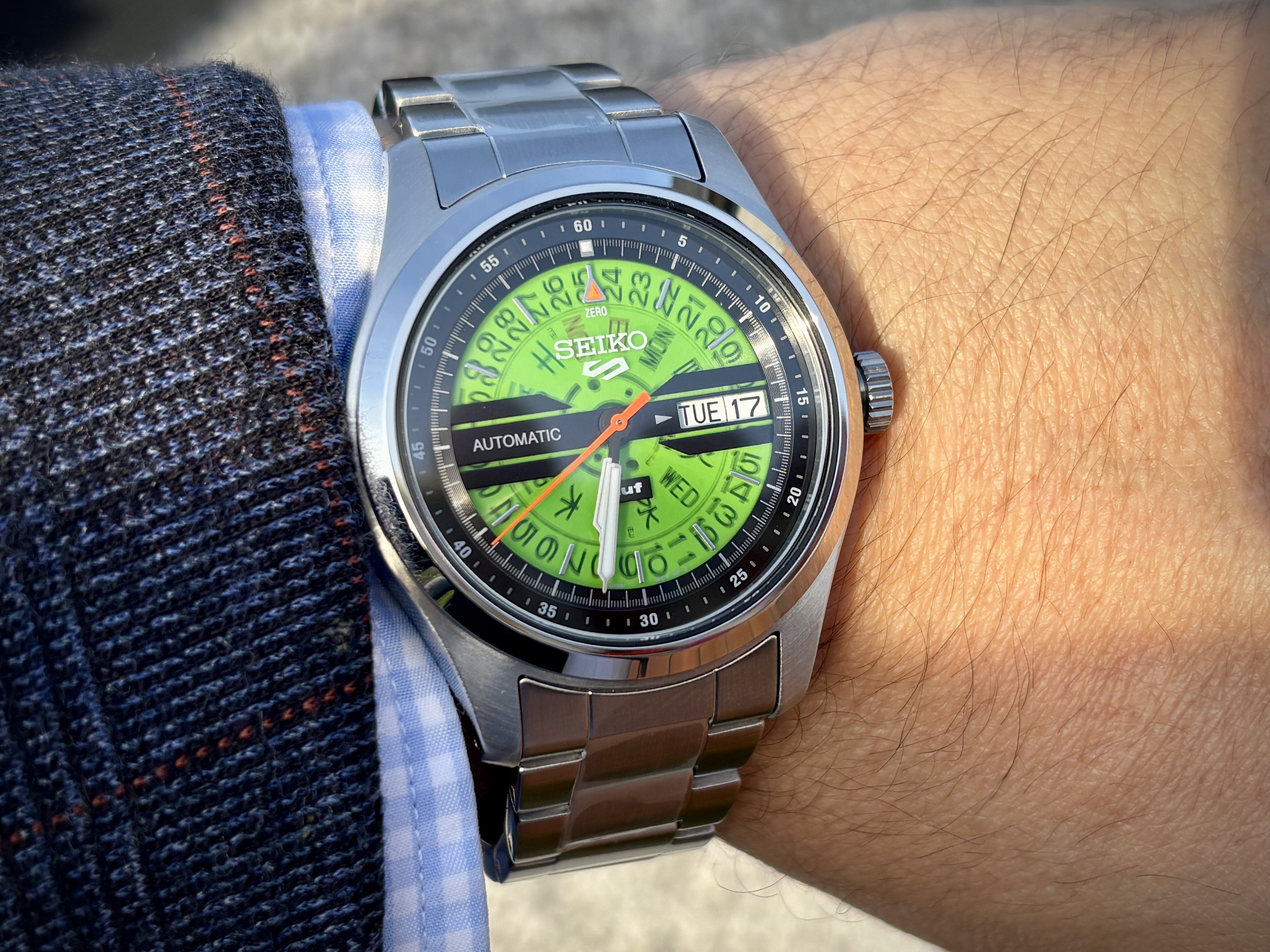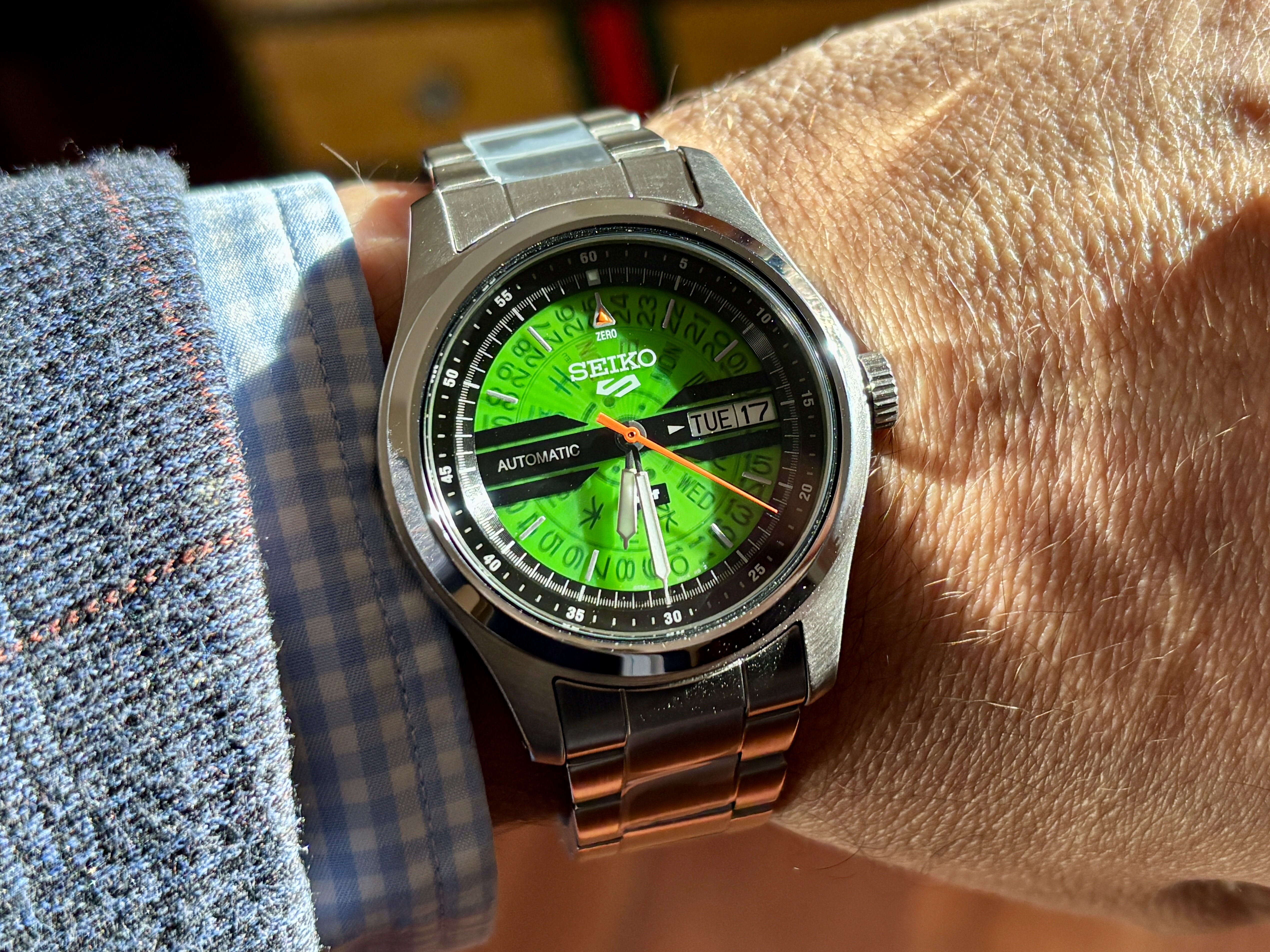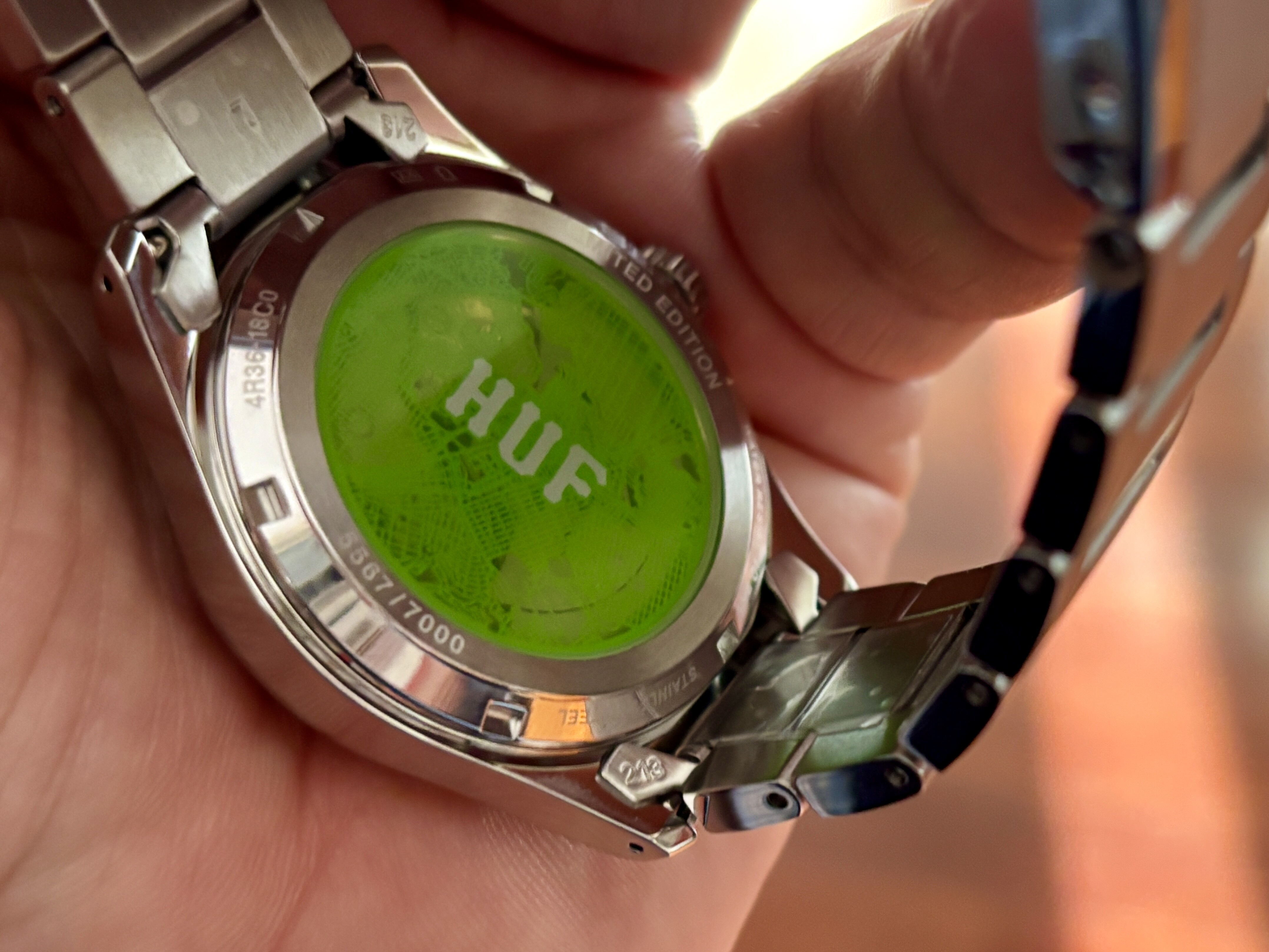 Muy chulo ese color verde, los índices, las agujas, la trasera… todo! Podrían ir poniendo endlinks sólidos a sus gamas de Seiko 5 o al menos en las ediciones limitadas como esta que parece también tener una caja específica.