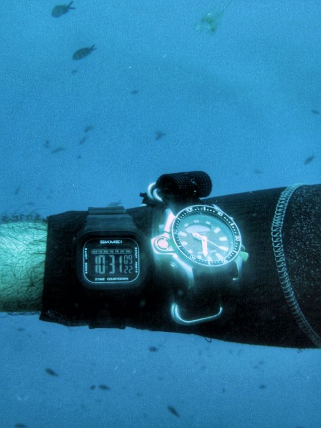 Y aquí lo tenéis, con mis otros instrumentos de buceo (normalmente no llevo tantos cacharros, pero estaba haciendo pruebas). ![]()