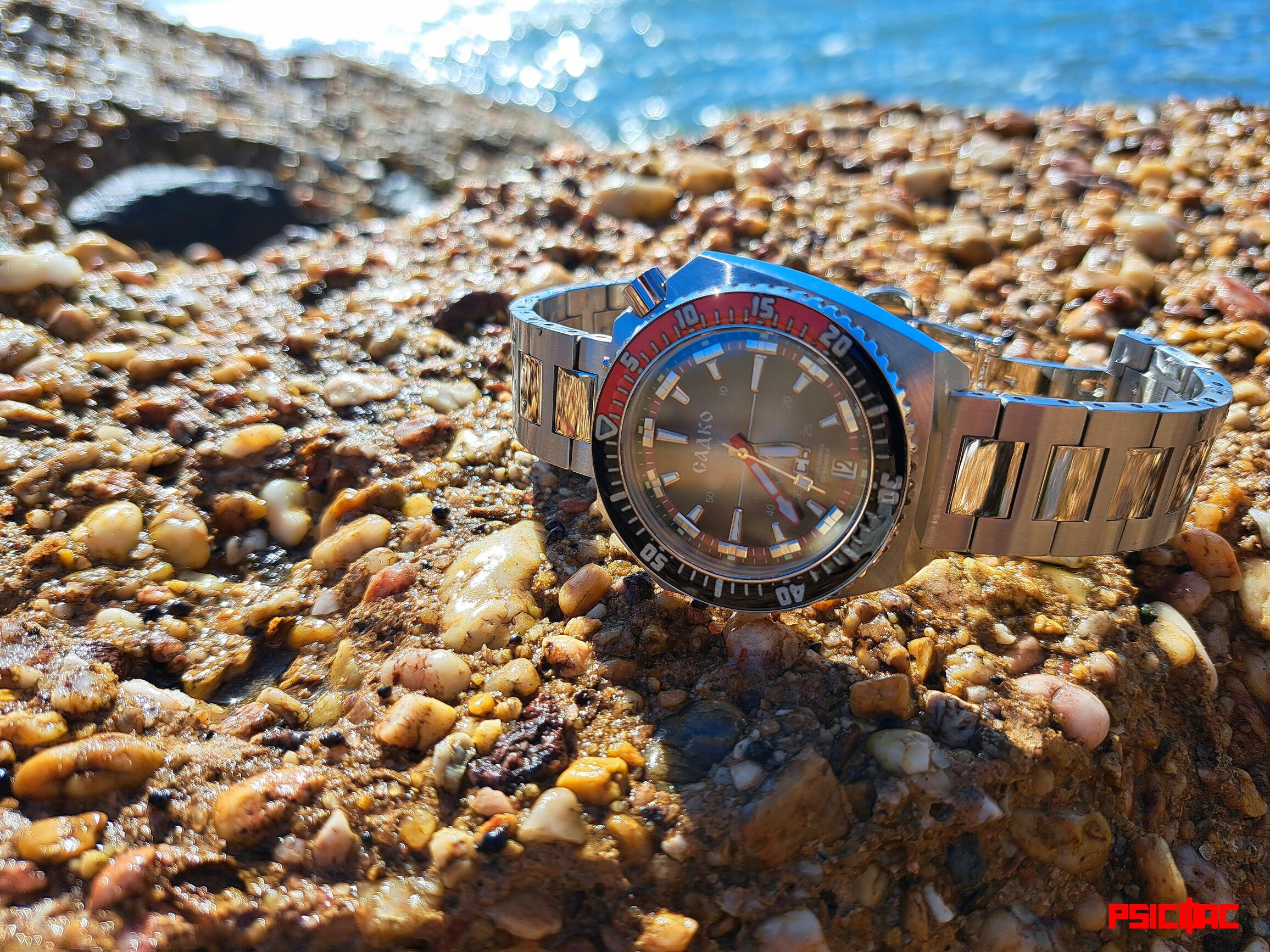 Su bisel en este caso “Coca-Cola” me parece sobrio, funcional e intuitivo, se promociona como de 120 clicks, pero cuál no es mi sorpresa que al comenzar a contar los mismos en un intervalo de 5 minutos, no encuentras ni 5 ni 10 clicks, ja,ja, lo que daría un total de 60 o de 120 clicks, cosas lógicas ambas. Pues NO ! Aquí hacemos las cosas “a nuestra forma” y encontramos una combinación entre 7 y 8 clicks entre índice e índice. No me pregunten por qué ni cómo, pero lo he contado a todo lo largo del dial y presenta intervalos de siete o otras de ocho clicks señores entre ellos, para al final curiosamente, ja,ja, coincidir con las marcas de minuto. Increíble pero cierto !!!.