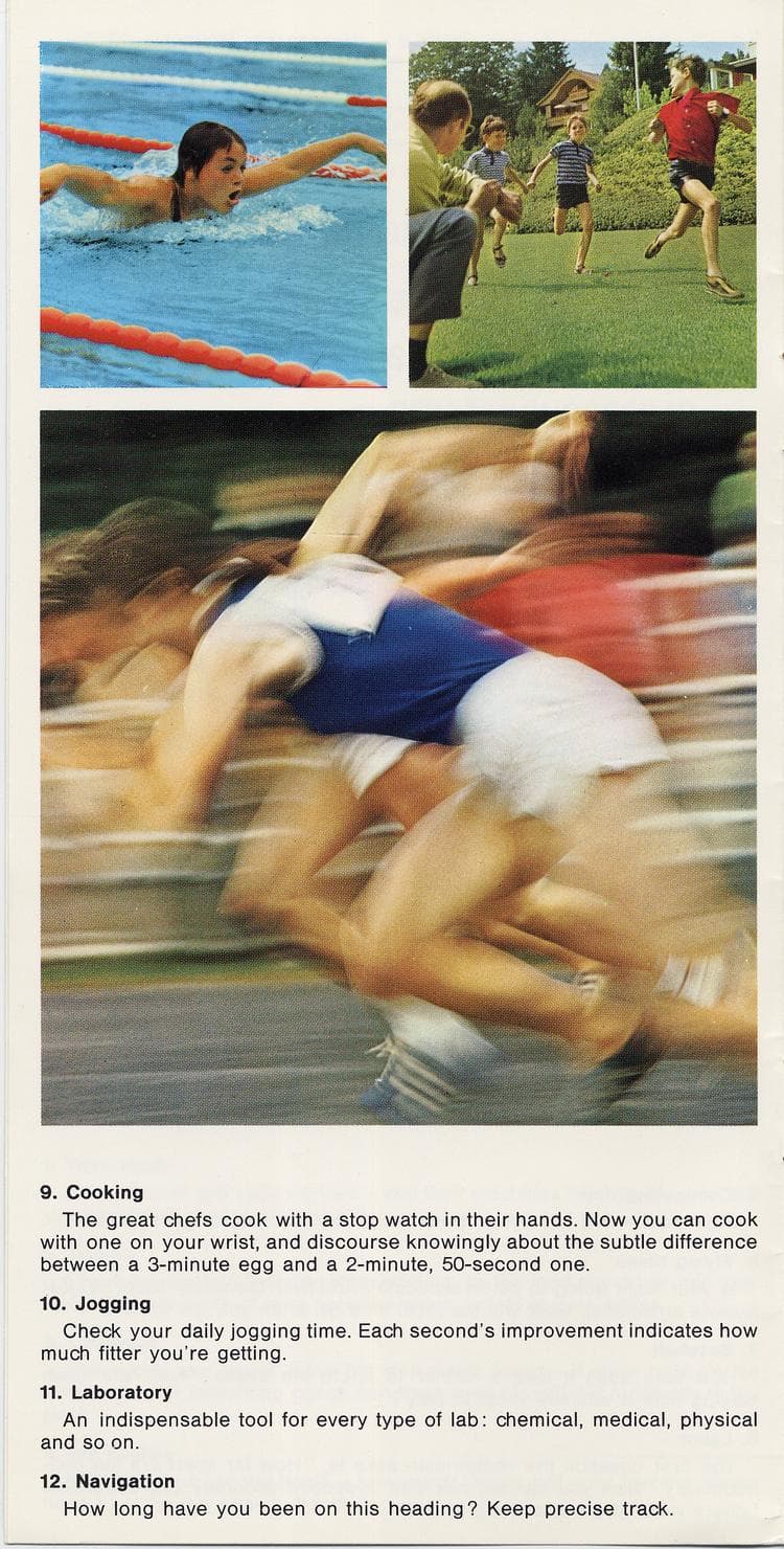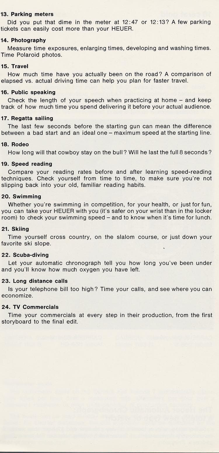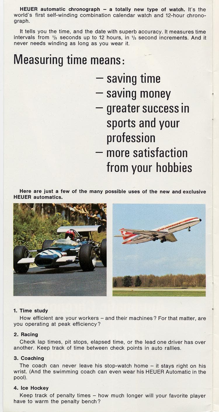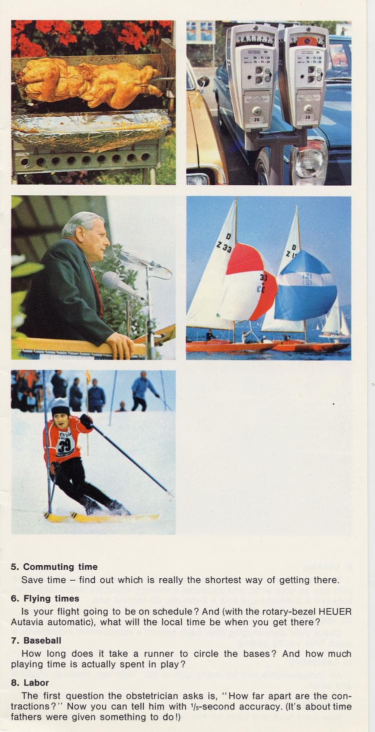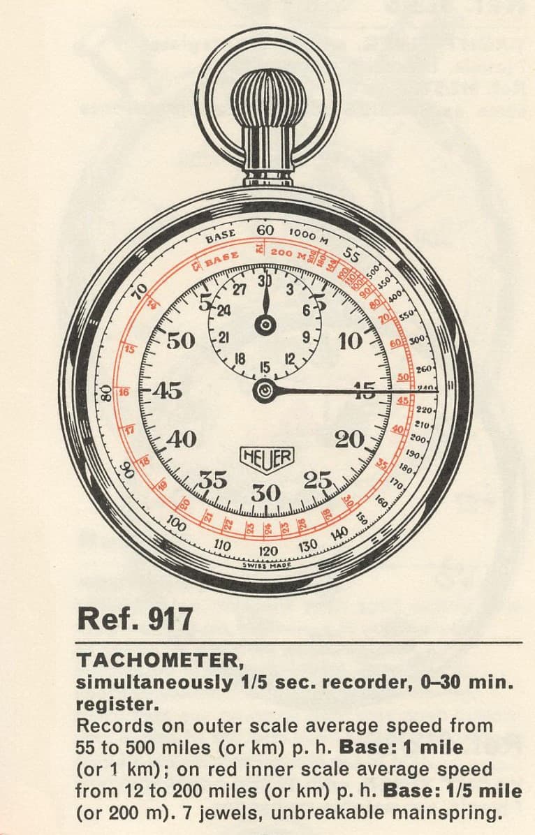 Resumiendo, este taquímetro giratorio nos puede parecer algo excesivamente complicado, poco práctico, no tan exacto como usar la tabla de cronometraje, etc. pero debemos valorarlo desde el punto de vista de la época en que apareció y no desde nuestro punto de vista actual, con todo tipo de herramientas disponibles al alcance de la mano. Así surgieron los relojes con biseles (o diales) de descompresión, los relojes con elaboradas reglas de cálculo,… El cronógrafo en sí mismo era una herramienta que ahora muchos consideran innecesaria pero véase, por ejemplo, como Heuer promocionaba sus cronógrafos en los 70, mostrando 24 maneras de darles uso en el día a día.