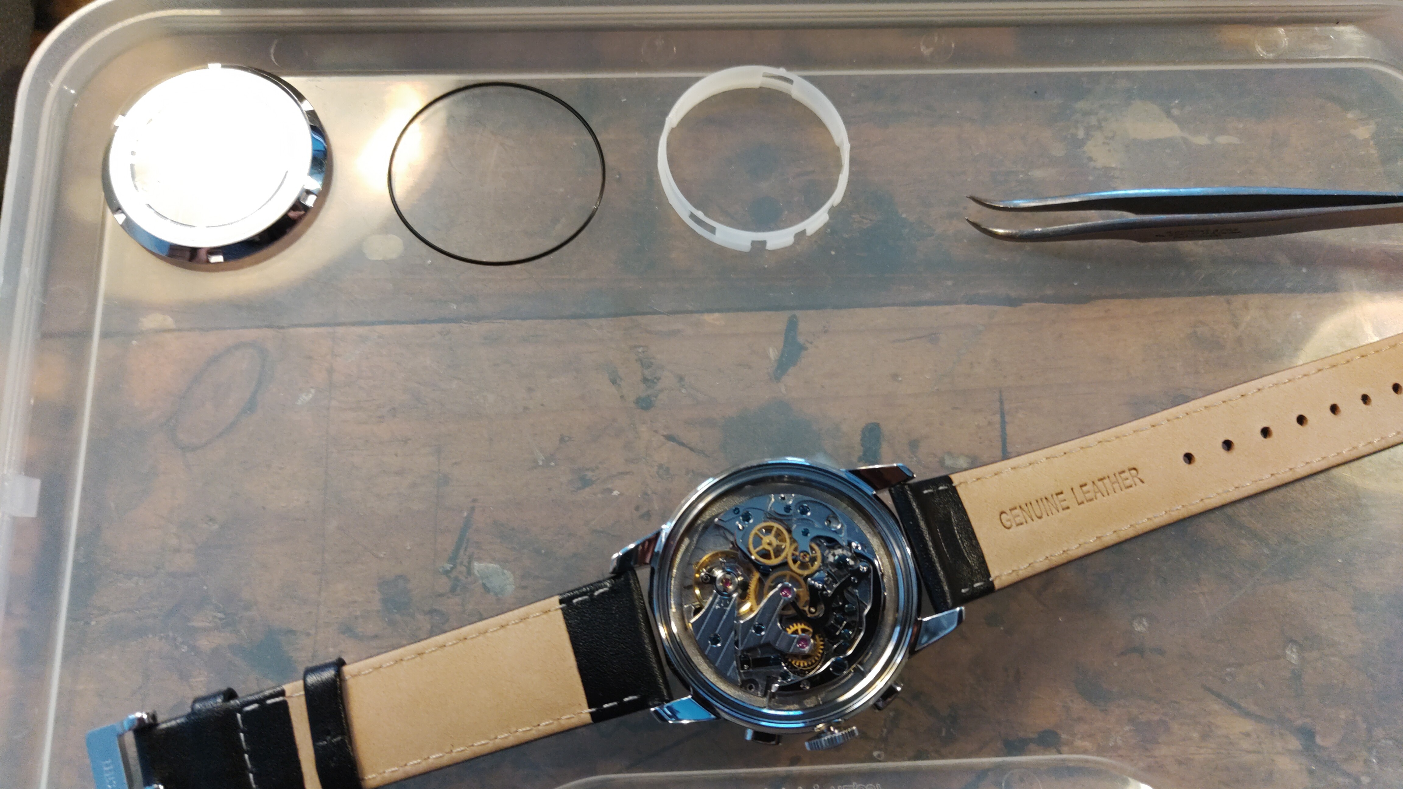 El problema es que no se puede sacar el movimiento por detrás. El diámetro del dIal es más grande que el diámetro interior del anillo central de la caja.