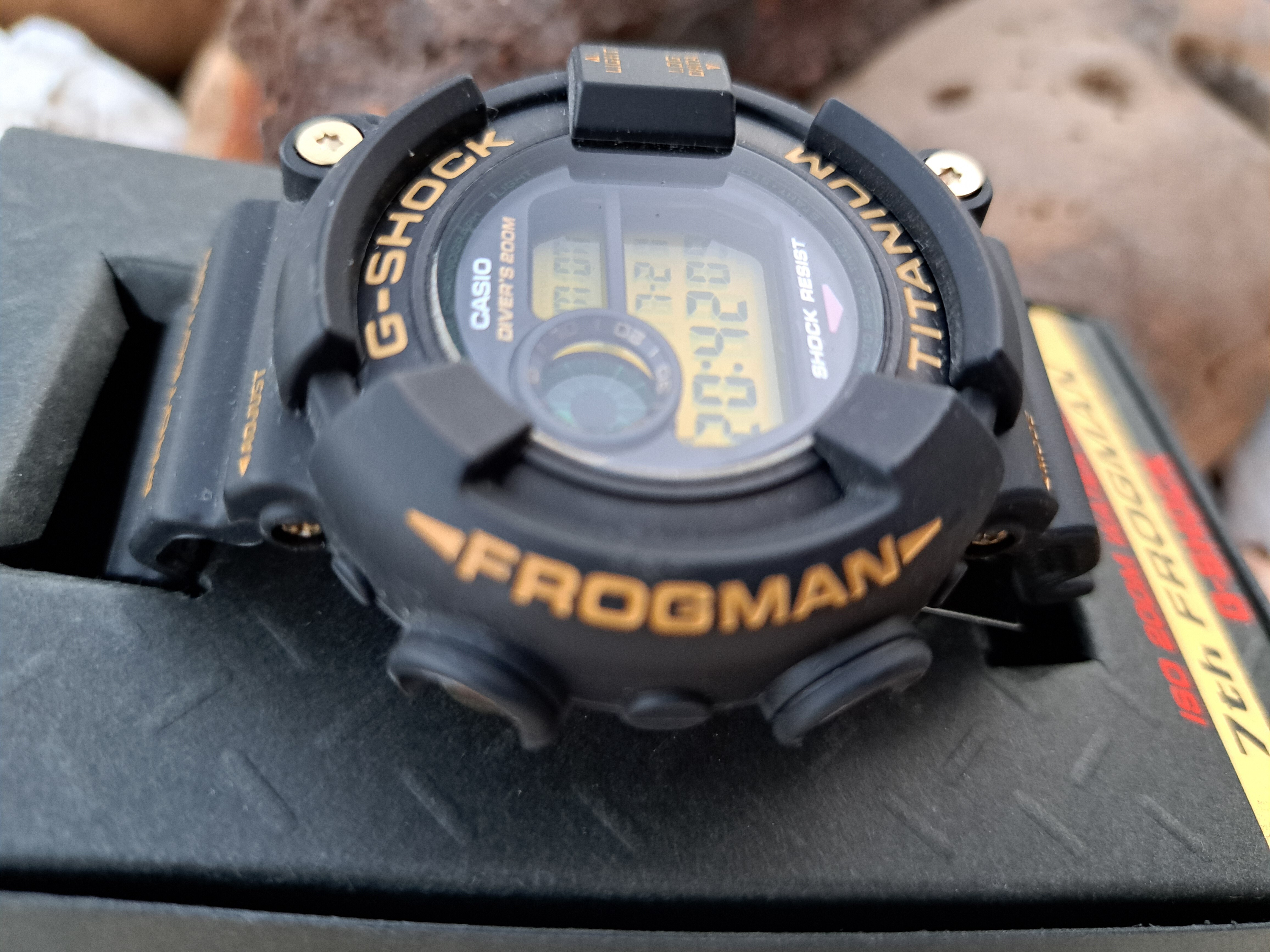 Casio Frogman de titanio con un tamañito la mar de contenido como se puede ver, caja roscada y que presenta tanto correa de modelo superior junto a ardillón nuevo en acero y dorado junto a trabilla igualmente, que le aportan un toque espectacular y superior. Tendrá una puesta. Tiene un arañazo en las 12 al lado de la O de Casio, por lo demás está muy bien conservado.