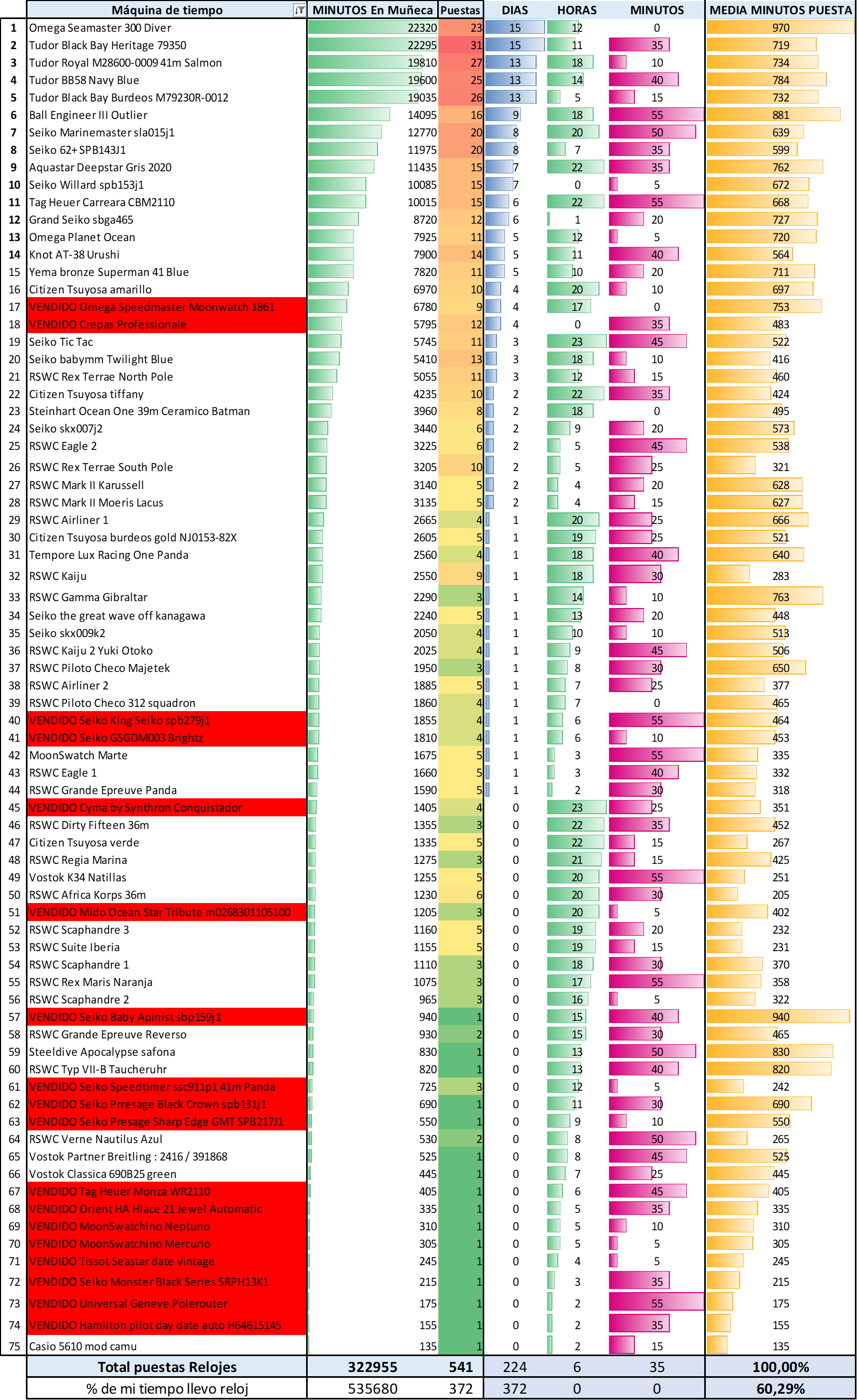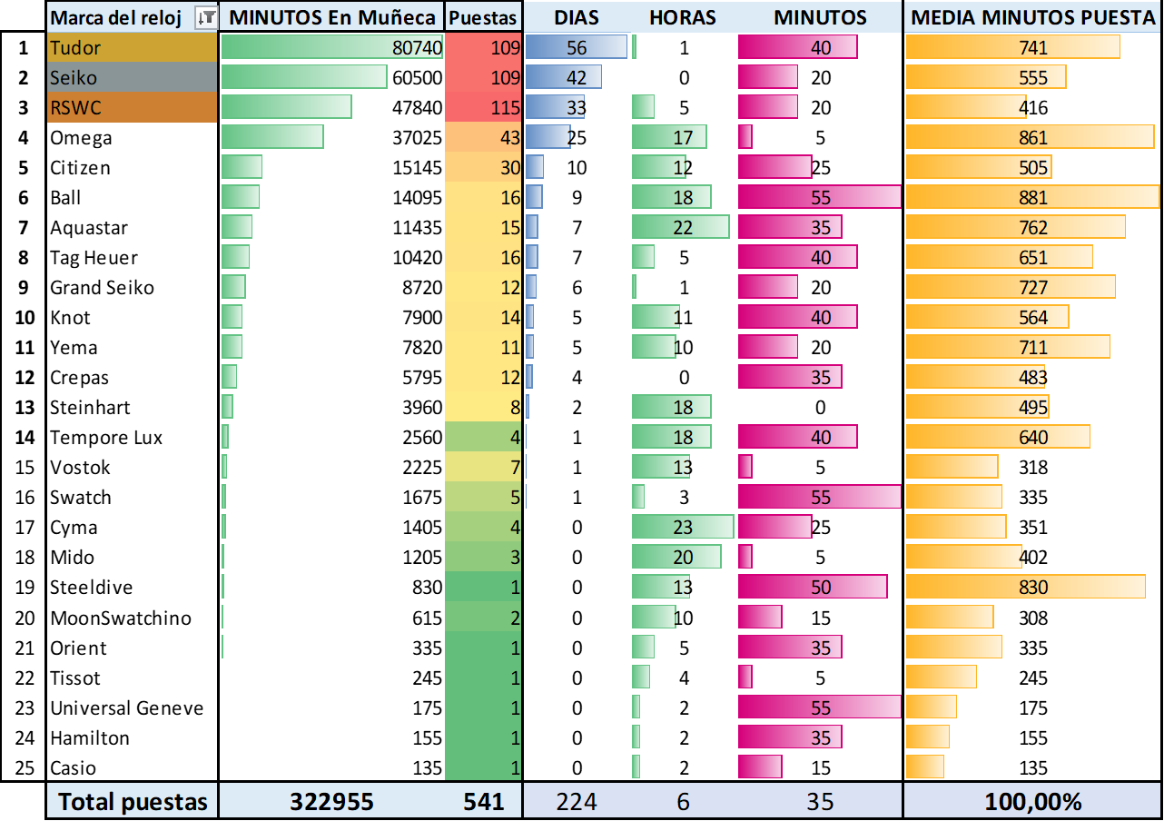 Hombre, raro no, pero metódico y consistente desde luego que eres un rato. Yo no tengo fuerzas ni ganas para fichar en la web las horas de trabajo, porque trabajo desde casa, así que imagínate para registrar el tiempo que me pongo cada reloj en un Excel, y ya no te digo si te lo quitas para fregar los cacharros o para lo que sea…
