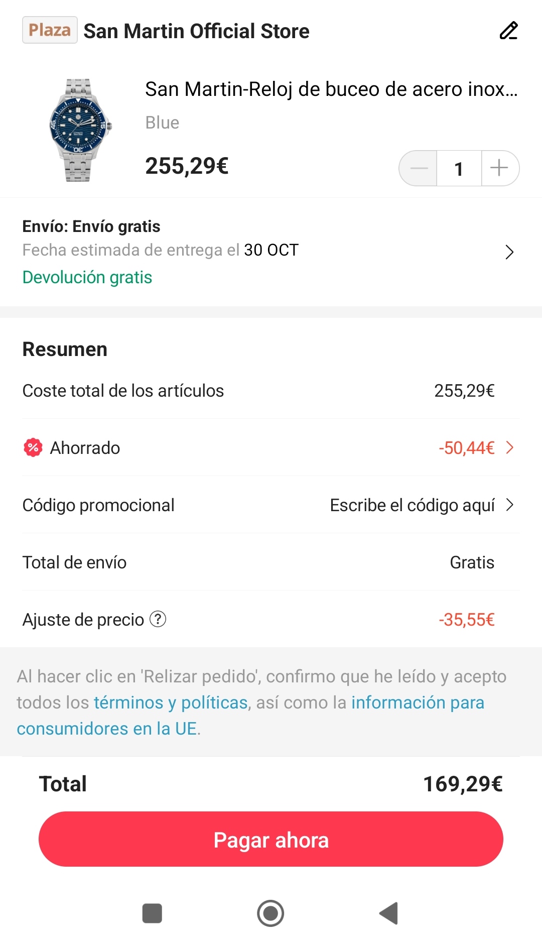 El precio será el total más el ajuste de precio. Esos 169 más los 35….Es decir, unos 205