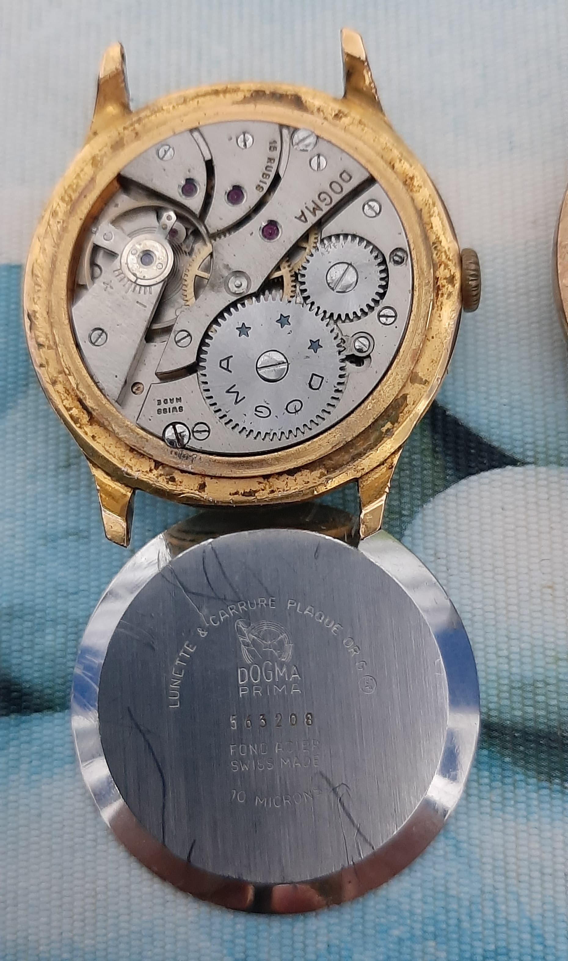 Su tapa trasera, de inoxidable, muestra el logo de la casa Dogma, su procedencia helvética, su número de serie y la referencia al chapado de la carrura y el bisel.