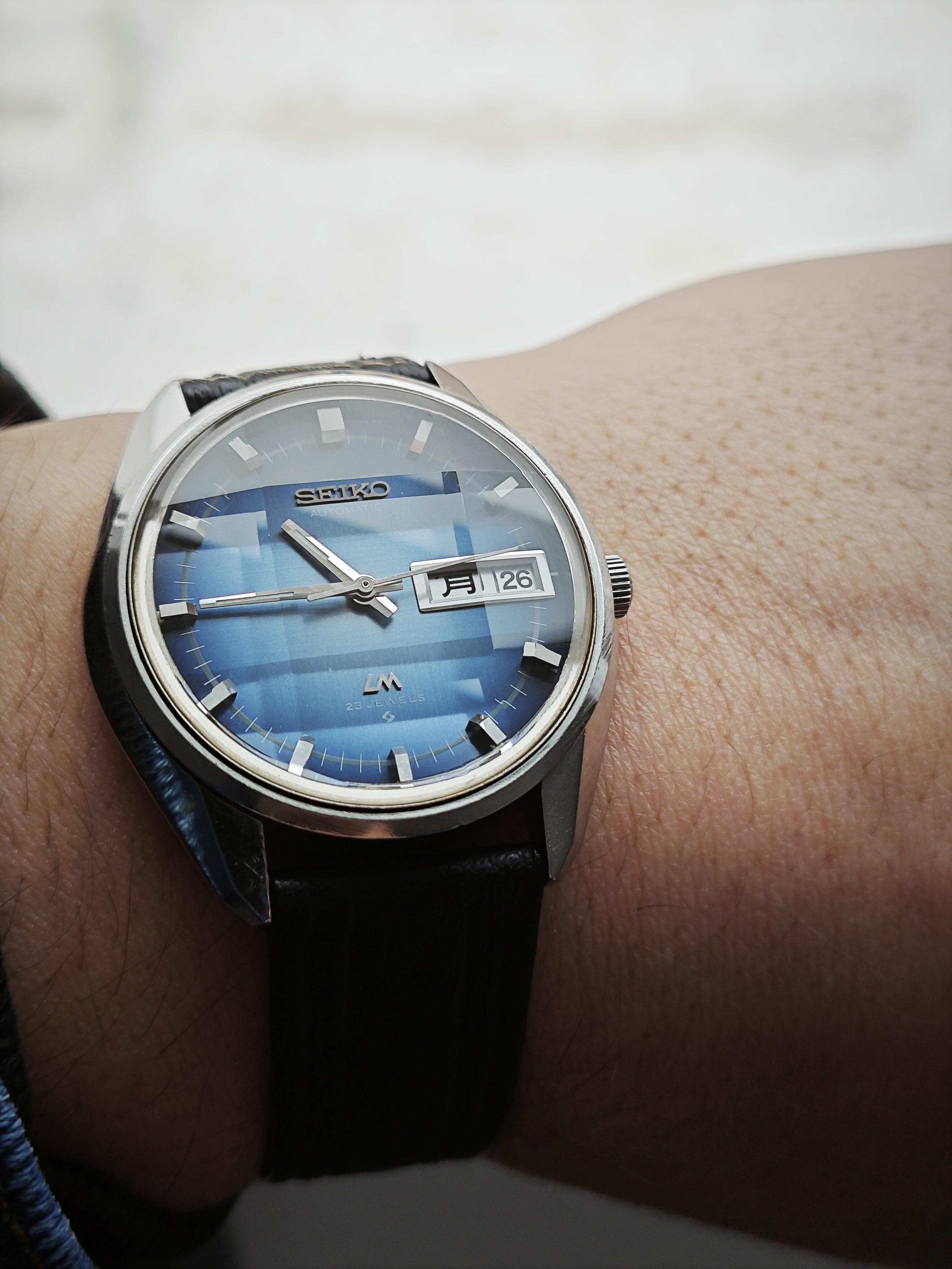 Pues hoy toca presentar brevemente a un recién llegado. Un curioso Seiko lord matic de 1973 con movimiento automático 5606 y una preciosa esfera azul degradada efecto rayos de sol que se disfruta a través de un cristal facetado que lo convierte en un caleidoscopio dependiendo del angulo