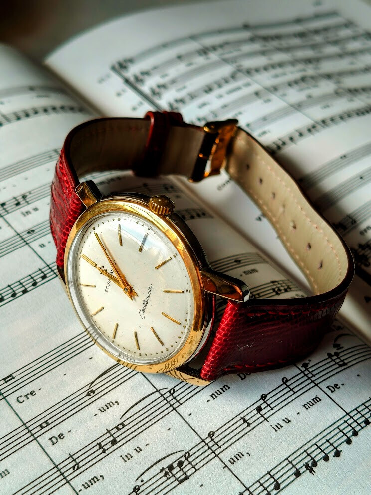 En los relojes de 2/3 agujas de los 50-60, las cajas era de acero (barato y duro), chapado dorado (lujo aparente, pero se desgasta) u oro sólido (top, pero caro). El “gold cap” era el punto medio perfecto: pones un bisel de oro real sobre acero, no se degrada y tiene pinta premium pero sin arruinarte. Eterna lo usó mucho, pero también lo usaba por ejemplo Omega en el Seamaster. Creo que la correa de tejus que le puse es también un compromiso.