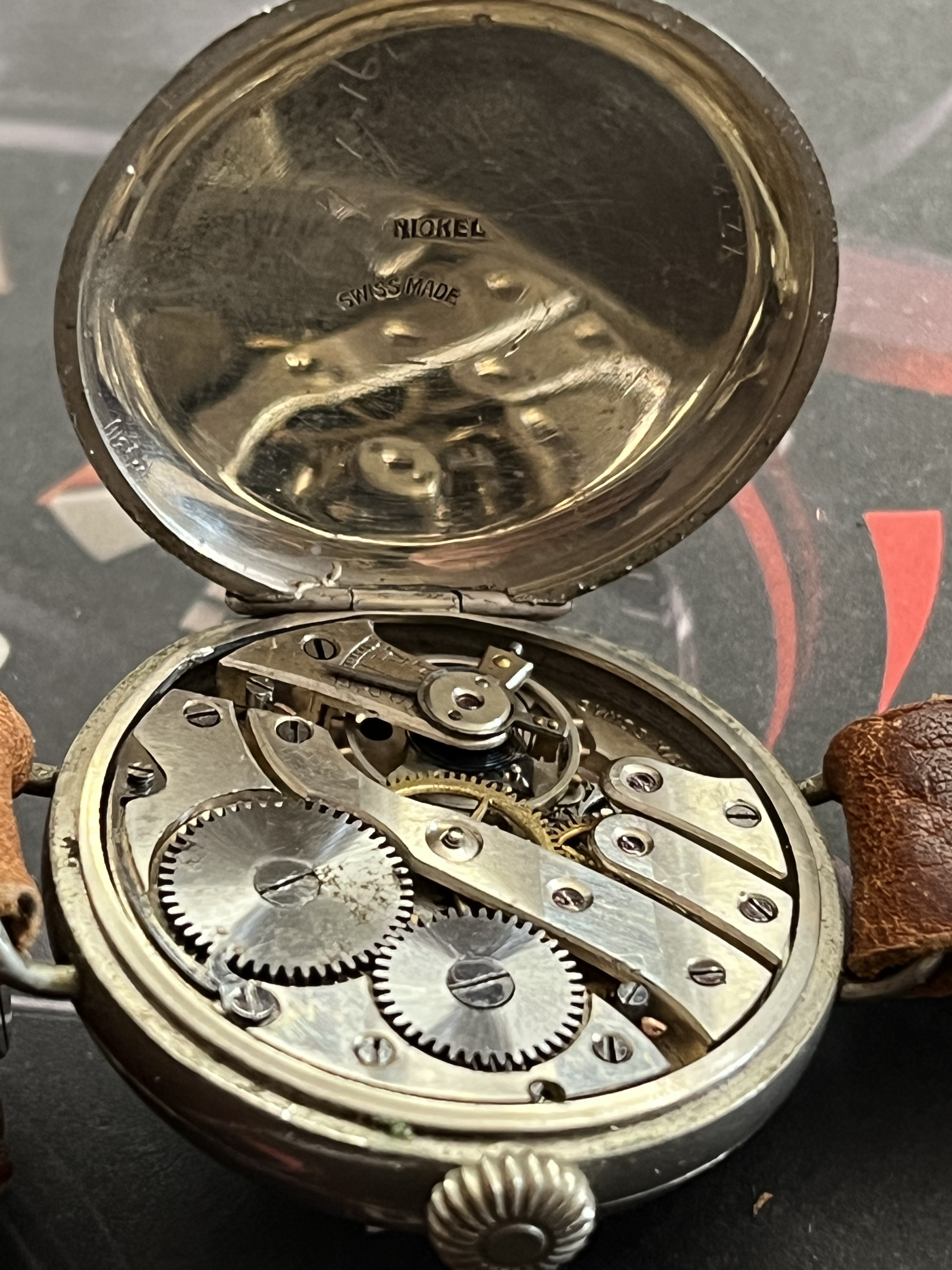 Pues en efecto por tamaño estilo y movimiento puede ser perfectamente de la primera guerra mundial. En la tapa parece que le revisaron en el 16…lo que no sabemos es de que siglo. Y el movimiento es muy parecido al longines 12.92 que se usaba en bastante modelos de principios del siglo pasado