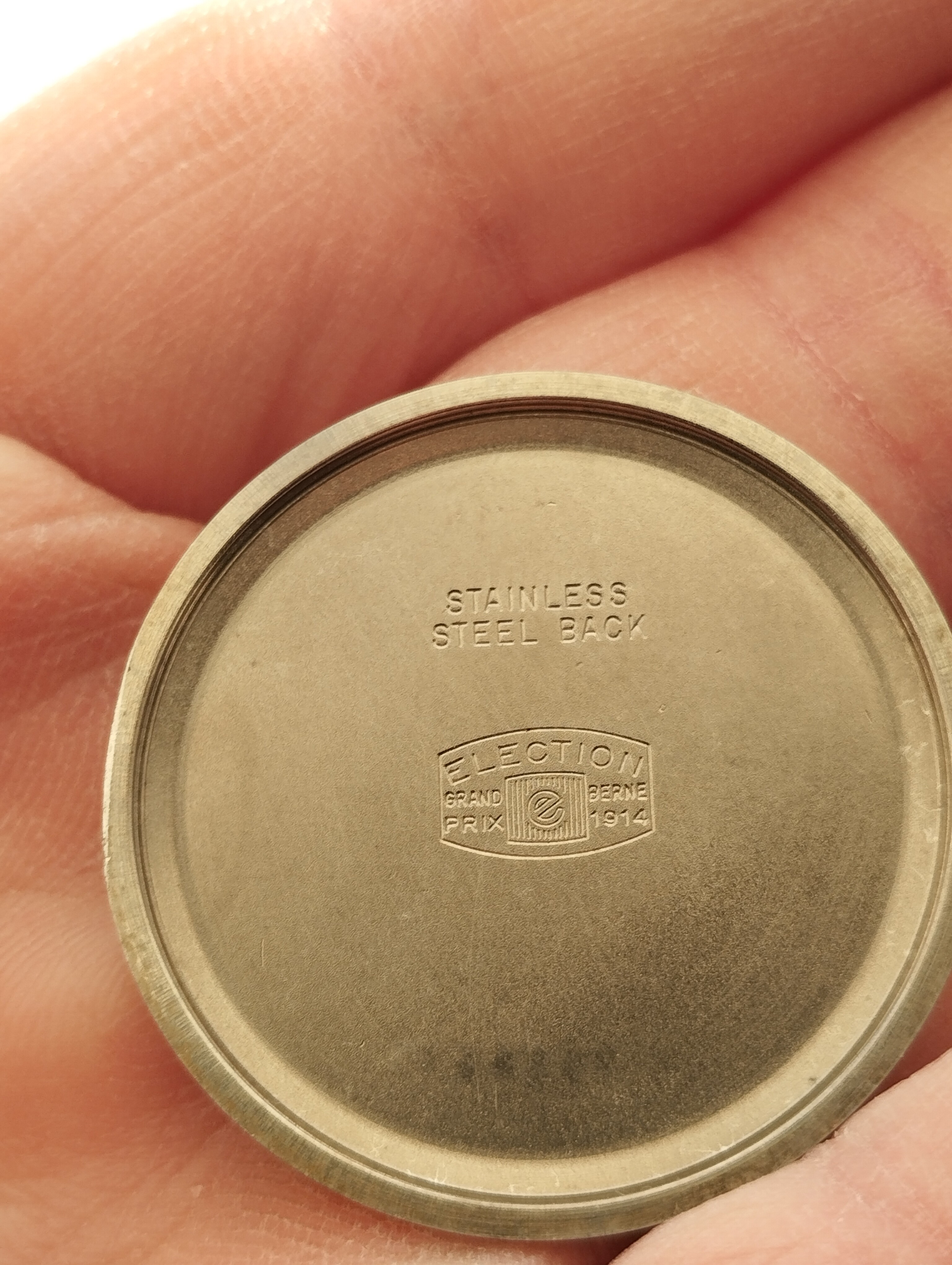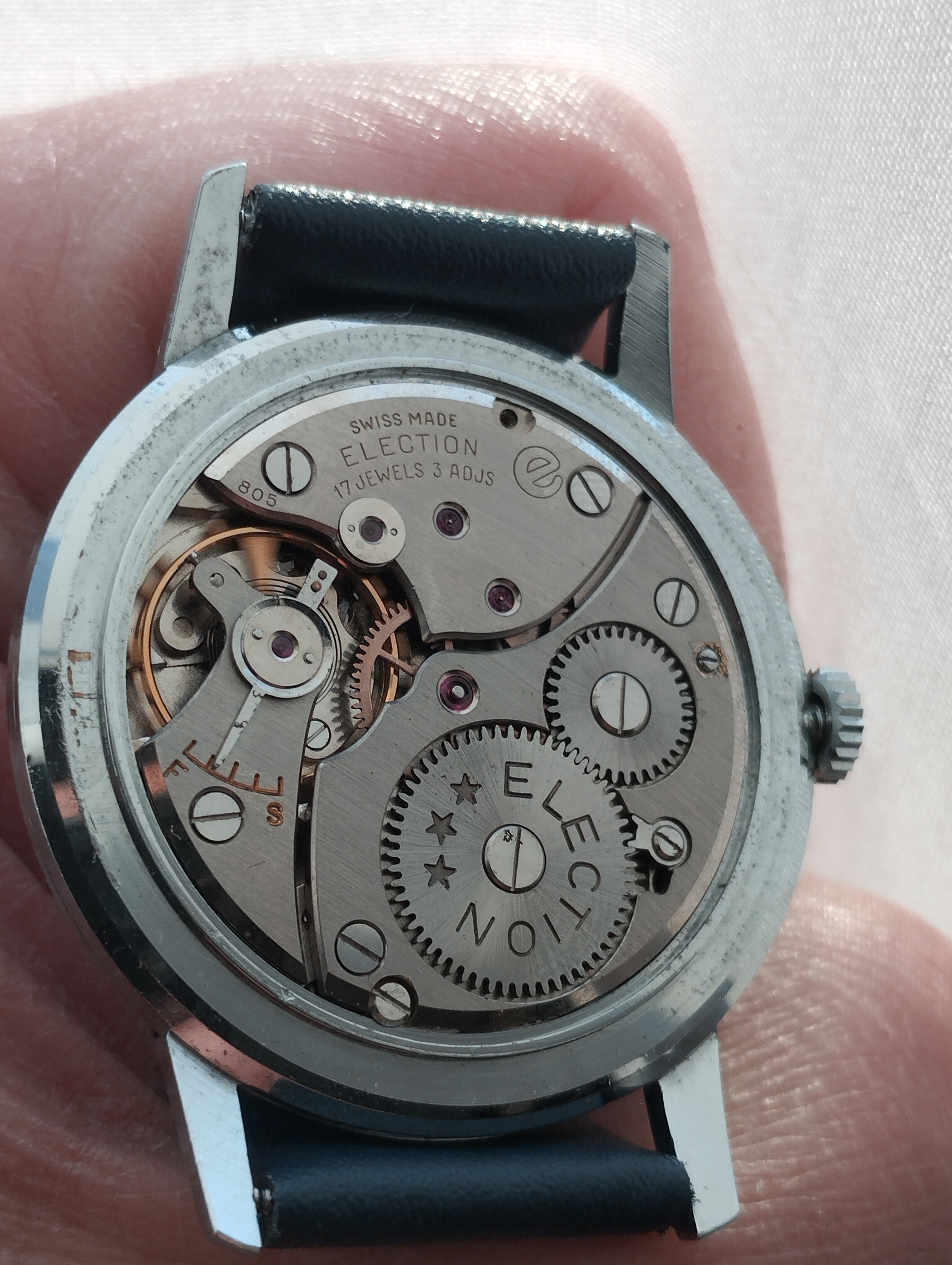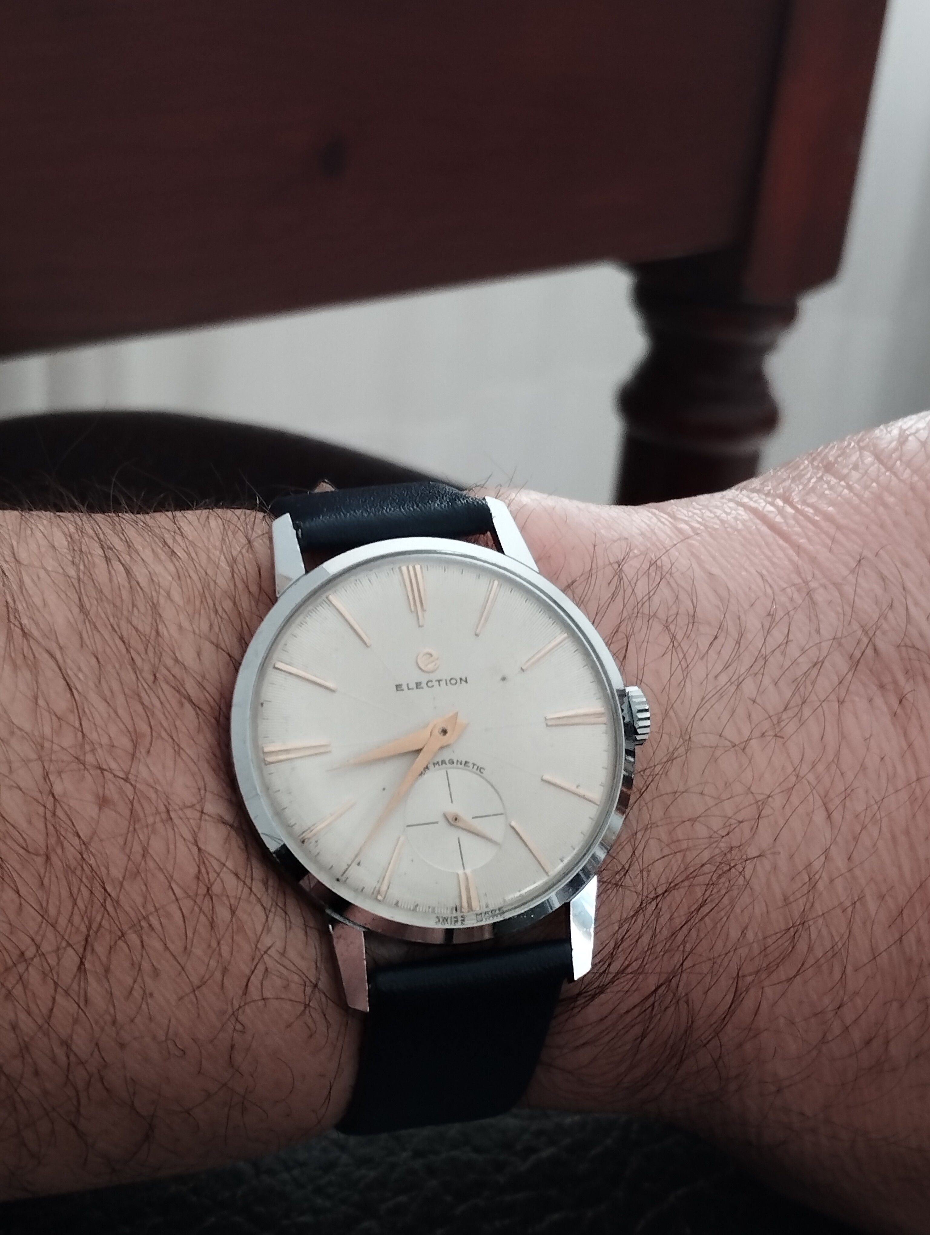 De momento, para empezar, os voy a enseñar un Election, marca que no conocía, pero que al parecer tenía calibres manufactura. Este reloj lo compré hace un par de semanas. Nótese la delgadez de la caja, no lo he medido pero es admirable.