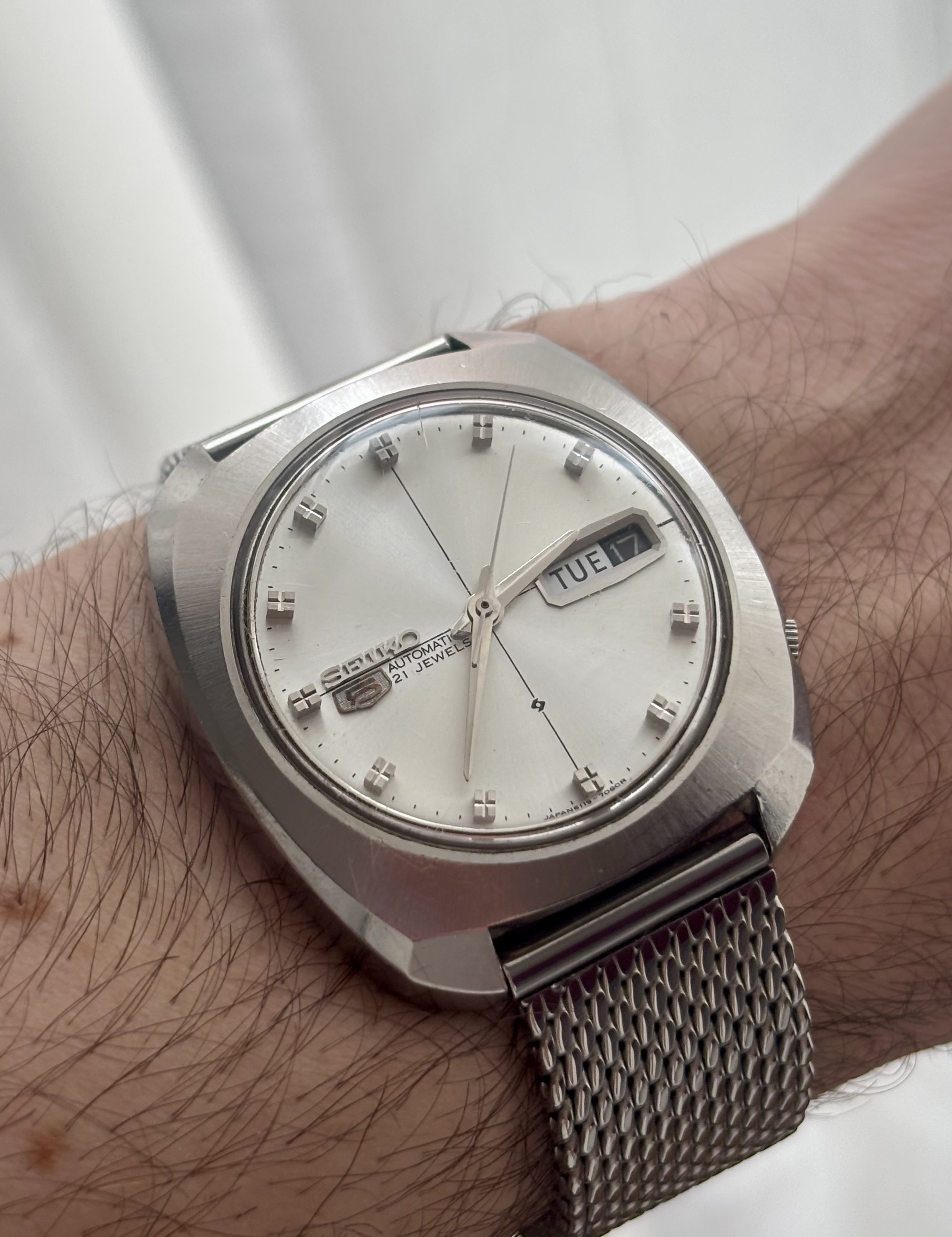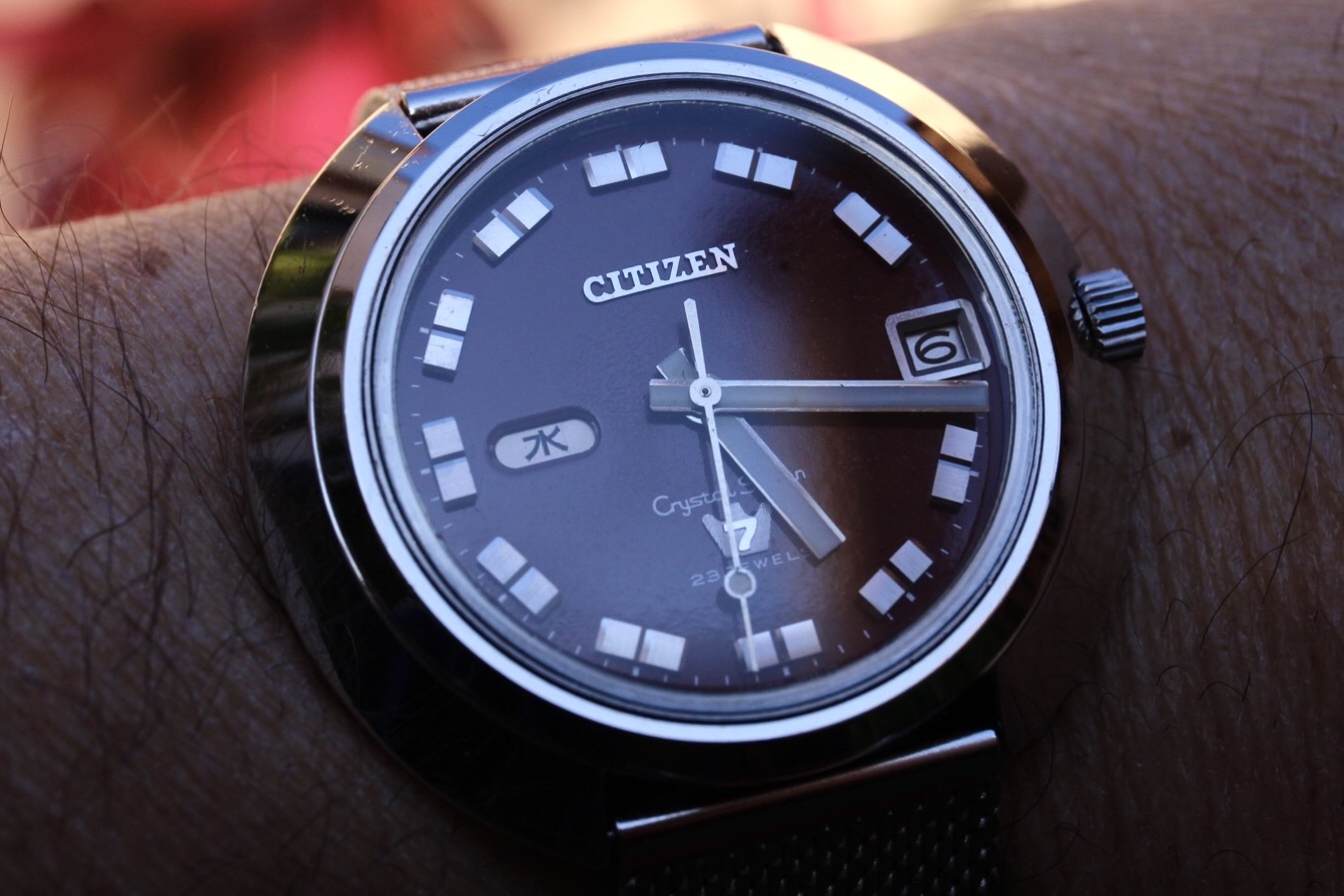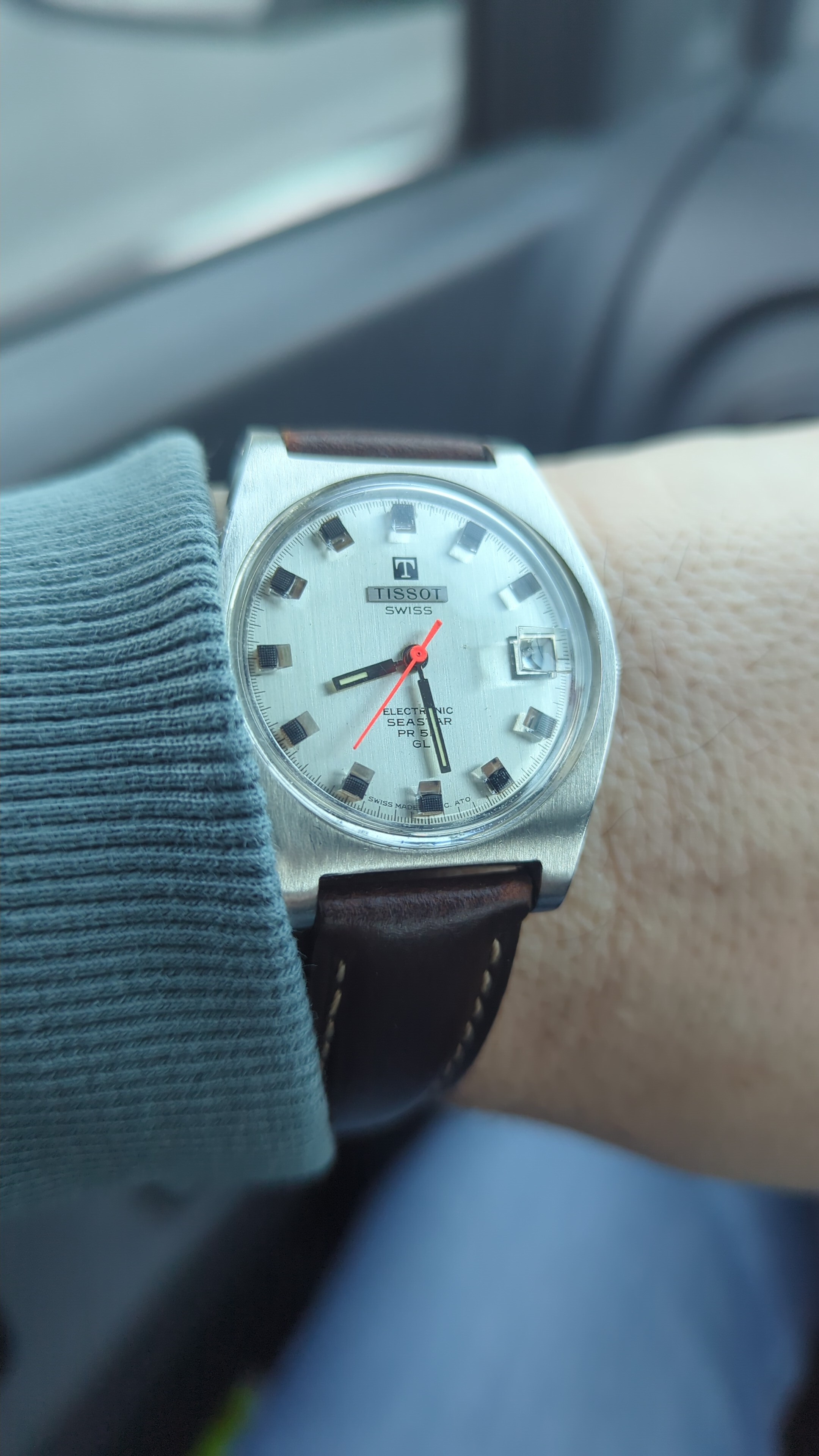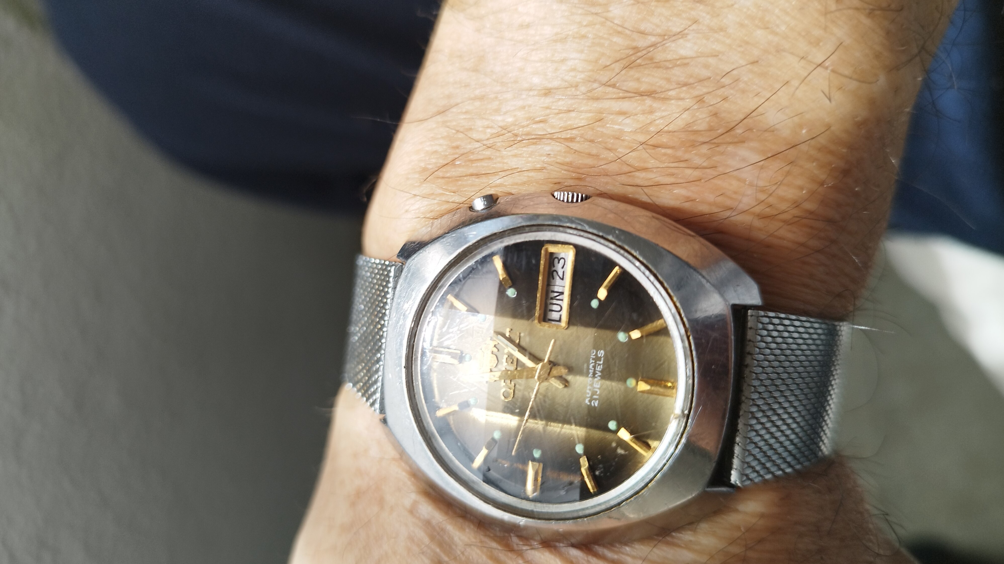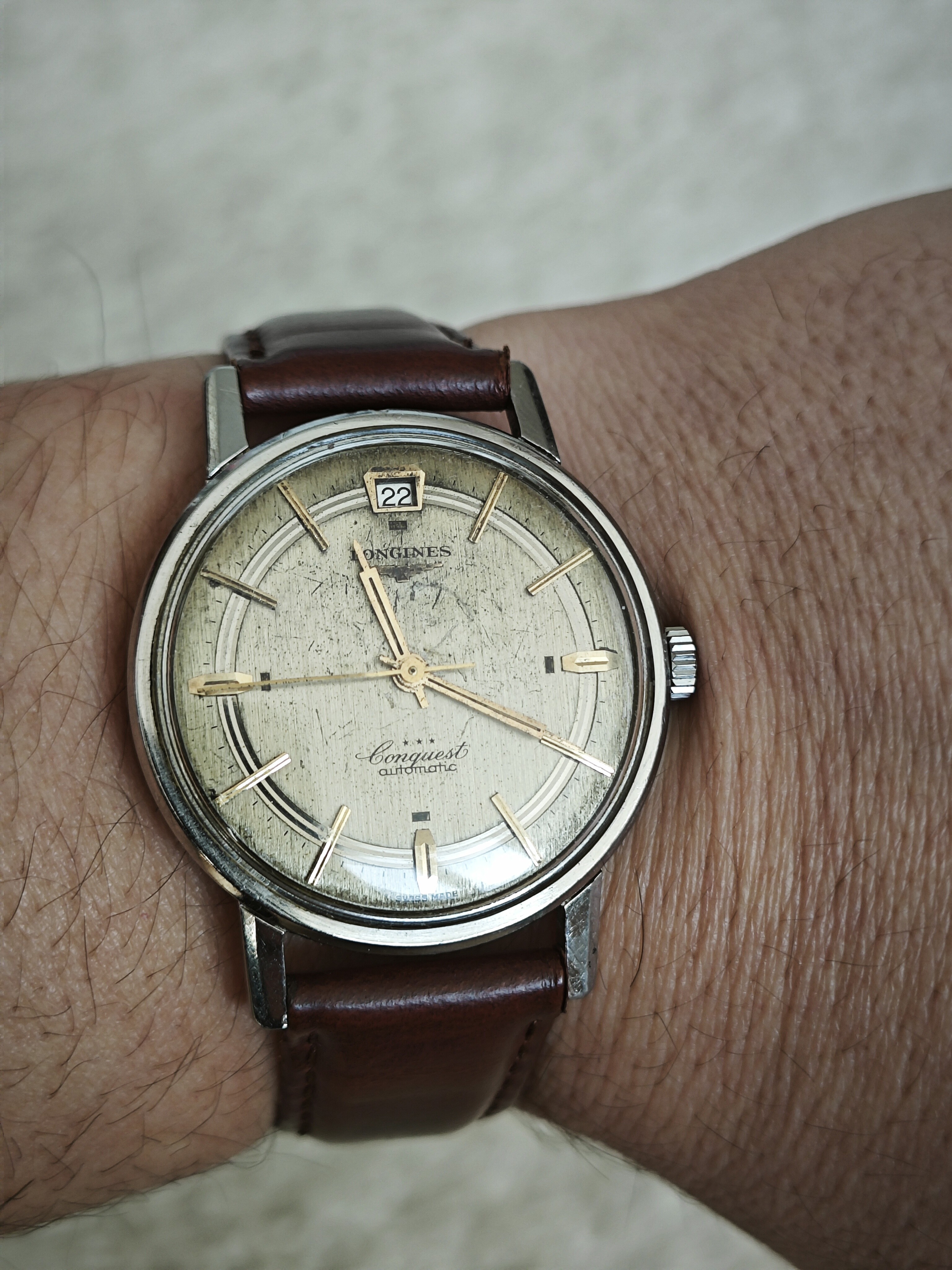 Cortesía del compañero @Pitikli tengo un nuevo conquest vintage de compañero de muñeca. Ya tengo el de mi abuelo pero ese al ser de oro y una reliquia familiar lo saco poco por puritito miedo a que le pase algo. Con este que además luce sus buenas cicatrices de una larga vida no tengo ese problema y puedo disfrutarlo como se merece con tranquilidad….bueno eso y que esos marcadores Puente en el dial me parecen una maravilla