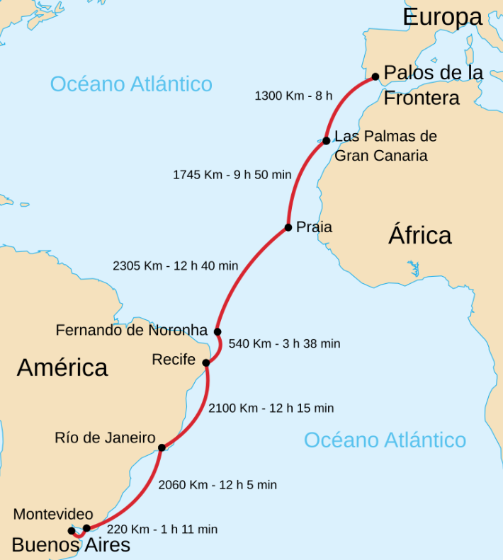 Un año más tarde, en 1926, España realizó su propia contribución a la navegación aérea con el vuelo del Plus Ultra. El comandante Ramón Franco, junto a los capitanes Julio Ruiz de Alda, Juan Manuel Durán y el mecánico Pablo Rada, voló desde Palos de la Frontera (Huelva) a Buenos Aires atravesando el Atlántico Sur. La ruta incluyó escalas en Las Palmas, Porto Praia, Fernando de Noronha, Recife, Río de Janeiro y Montevideo, hasta aterrizar en la capital argentina el 10 de febrero, 19 días después de su salida.