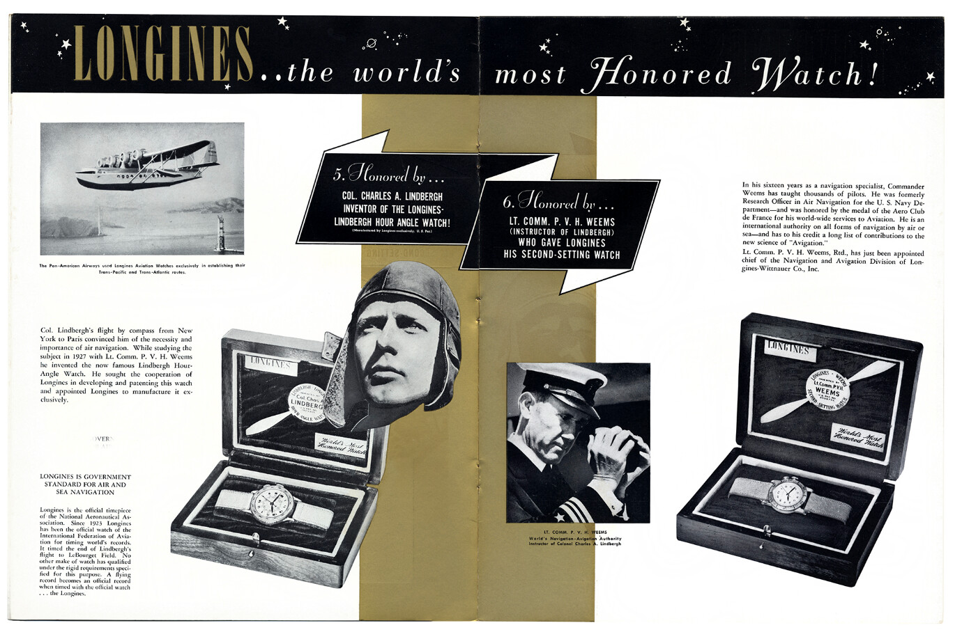 Su obra Air Navigation (1931) fue especialmente influyente, y mereció la medalla de oro del Aero Club de Francia. A medida que los aviones evolucionaban y las distancias a cubrir se ampliaban, Weems perfeccionó también sus herramientas y métodos. Véase el nivel técnico alcanzado que se muestra en este anuncio de 1942, su sistema de navegación es un conjunto integrado de instrumentos y procedimientos, una versión analógica del GPS moderno. Nótese la presencia del reloj.