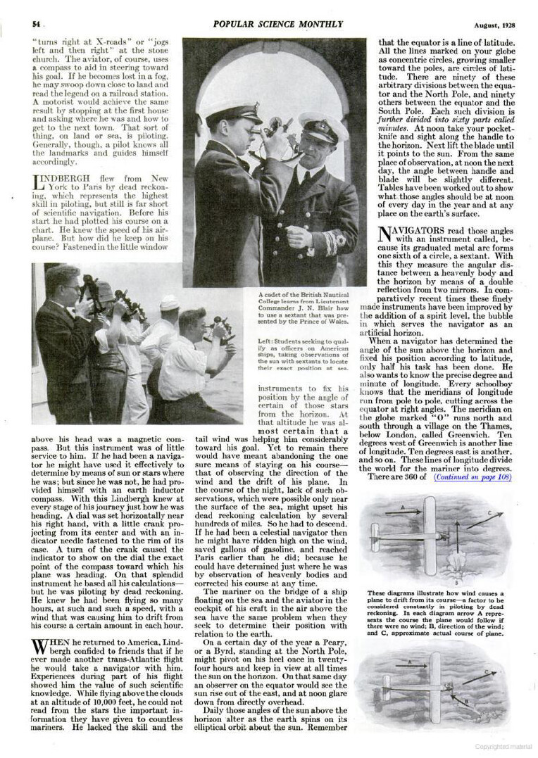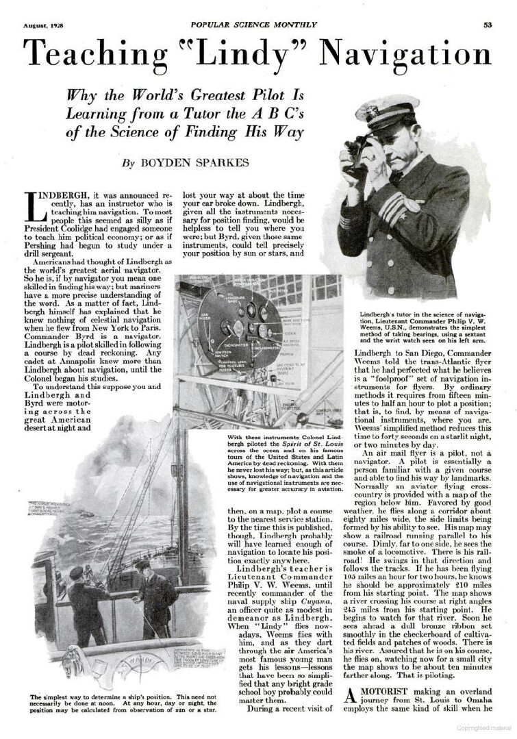 Interesante artículo publicado en Popular Science Monthly en agosto de 1928. En él se menciona que, utilizando métodos convencionales, obtener la posición podía llevar entre quince minutos y media hora, mientras que con el método simplificado de Weems bastaban apenas cuarenta segundos en una noche despejada o unos dos minutos durante el día.