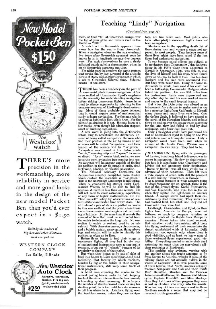 En cualquier caso, fue en abril de 1928 cuando Charles Lindbergh, durante una visita al portaaviones USS Langley para observar las operaciones aéreas a bordo, coincidió con aquel entusiasta capitán de corbeta de la Marina, P. V. H. Weems, que estaba realizando experimentos de navegación aplicados a la aviación embarcada. Weems aprovechó la ocasión para mostrar a Lindbergh algunos de los dispositivos en los que estaba trabajando. Entre ellos destacaban un sextante con burbuja, que estaba ayudando a perfeccionar en colaboración con el National Bureau of Standards, y un prototipo de reloj con ajuste de segundo (second-setting ) —el primero realmente diseñado para aviadores— que podía sincronizarse con precisión exacta al segundo.