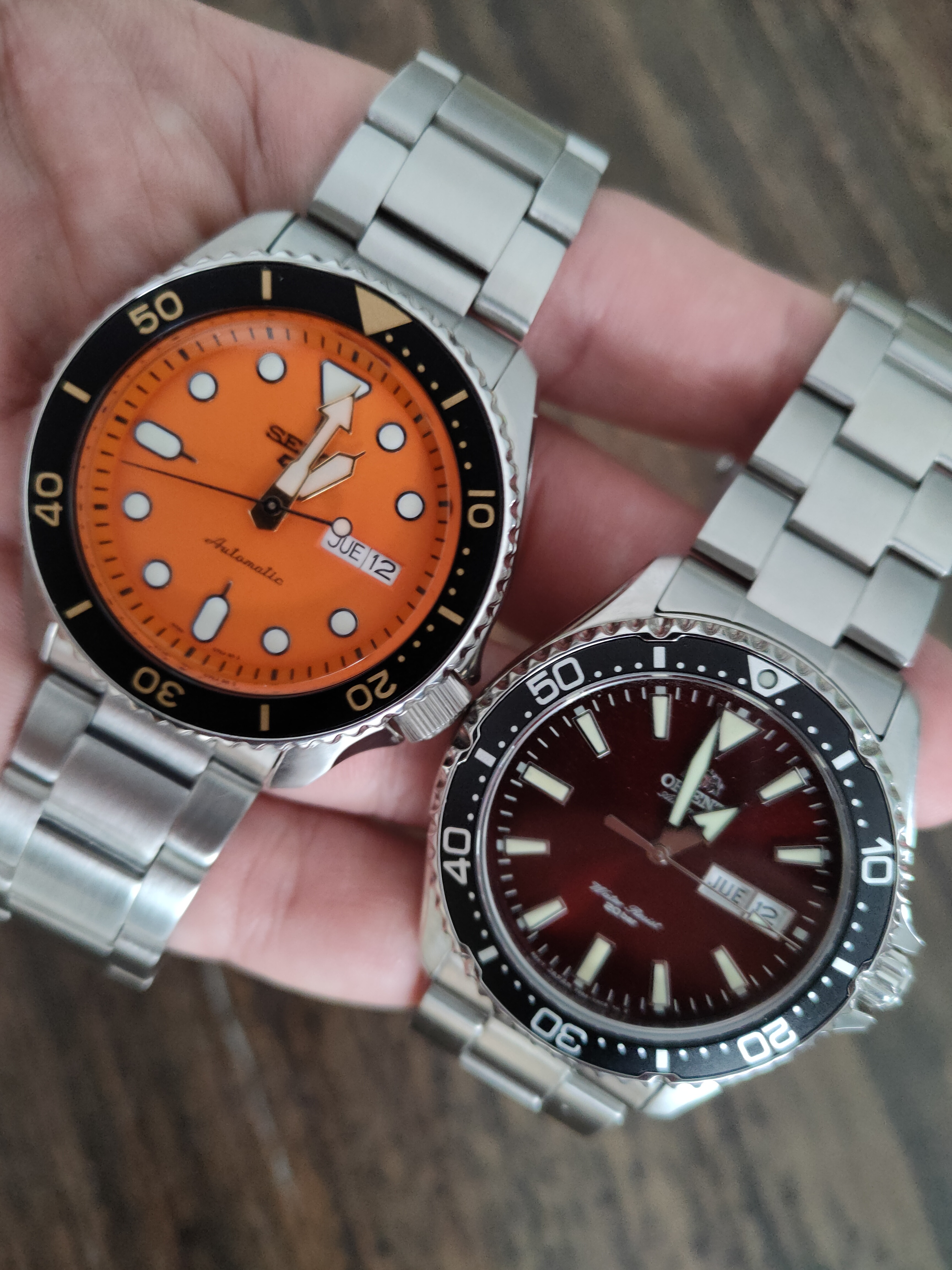 Difícil respuesta. Para mi el seiko tiene peor armis, dial “opaco”, la caja parece más elevada, trasera vista y peor bisel (más vertical y más suave). El dial del orient es una belleza con los reflejos y a parte de lo comentado antes, el tacto de la corona me gusta más y es roscada. Me gustaría el bisel en tonos rojos.
