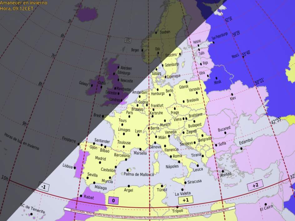 Siempre podría ser peor. Que nos pongan “en el huso que nos corresponde” para que en algunos sitios, en invierno, antes de las 16h. sea de noche, y buena parte de la gente se encuentre sin luz casi todo el año si sale en actuales horarios de trabajar. Pero eso sí, amanecerá antes…