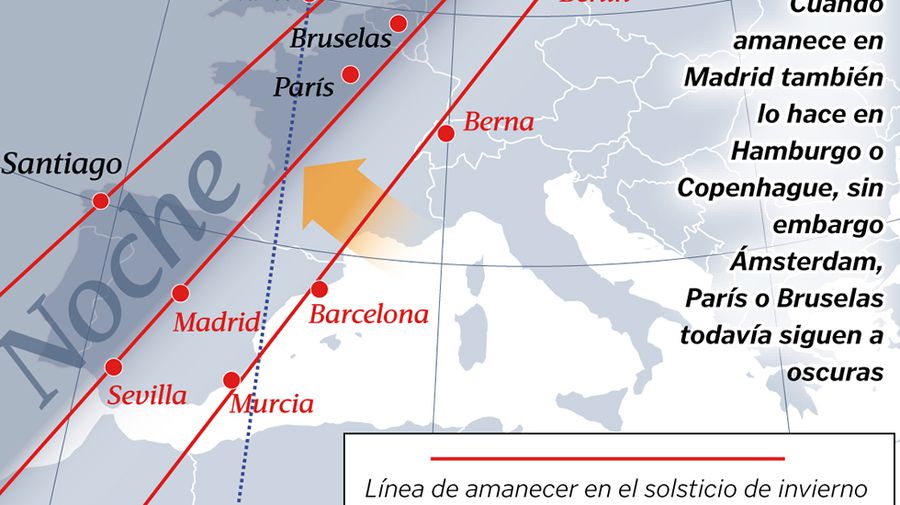 El Sol cae oblícuo a la Tierra, por lo que no necesariamente sigue meridianos ni husos.