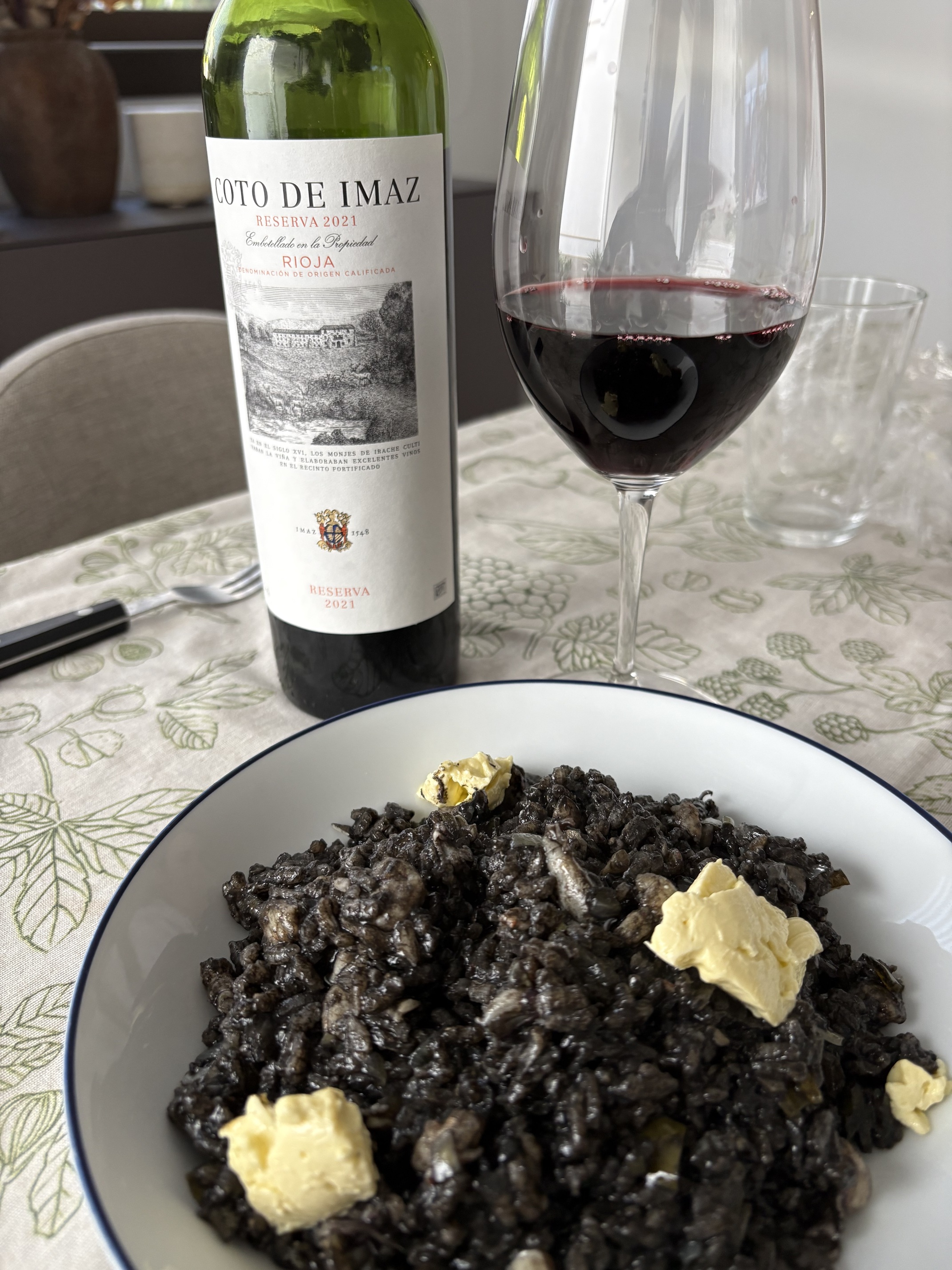 Un arroz negro con tinta de calamar y alioli. Todo hecho en casa. Buen vino, pero el arroz supera con mucho a este caldo.