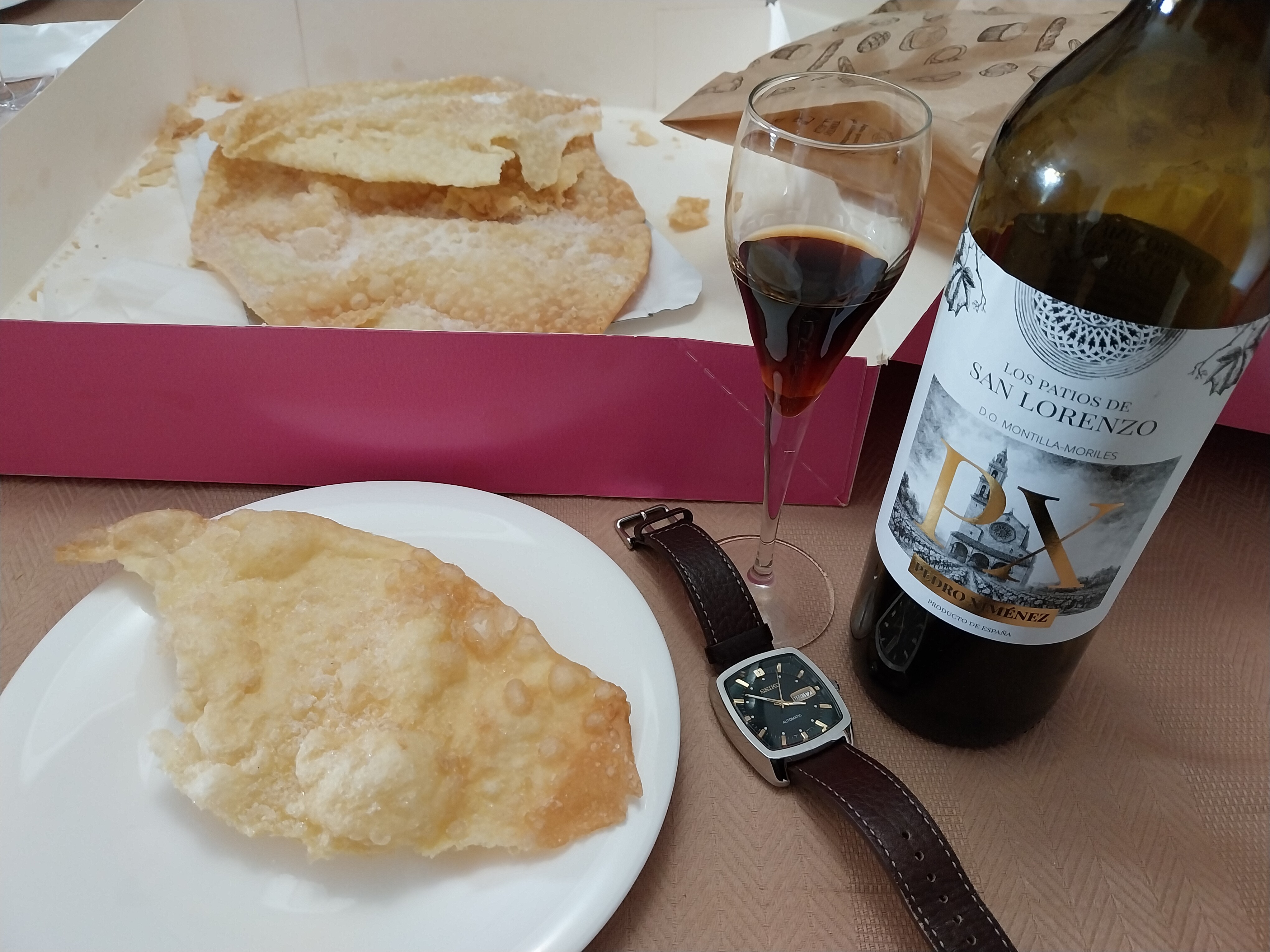 Para el postre orejas, que es carnaval. Mojaditas con Pedro Ximénez…