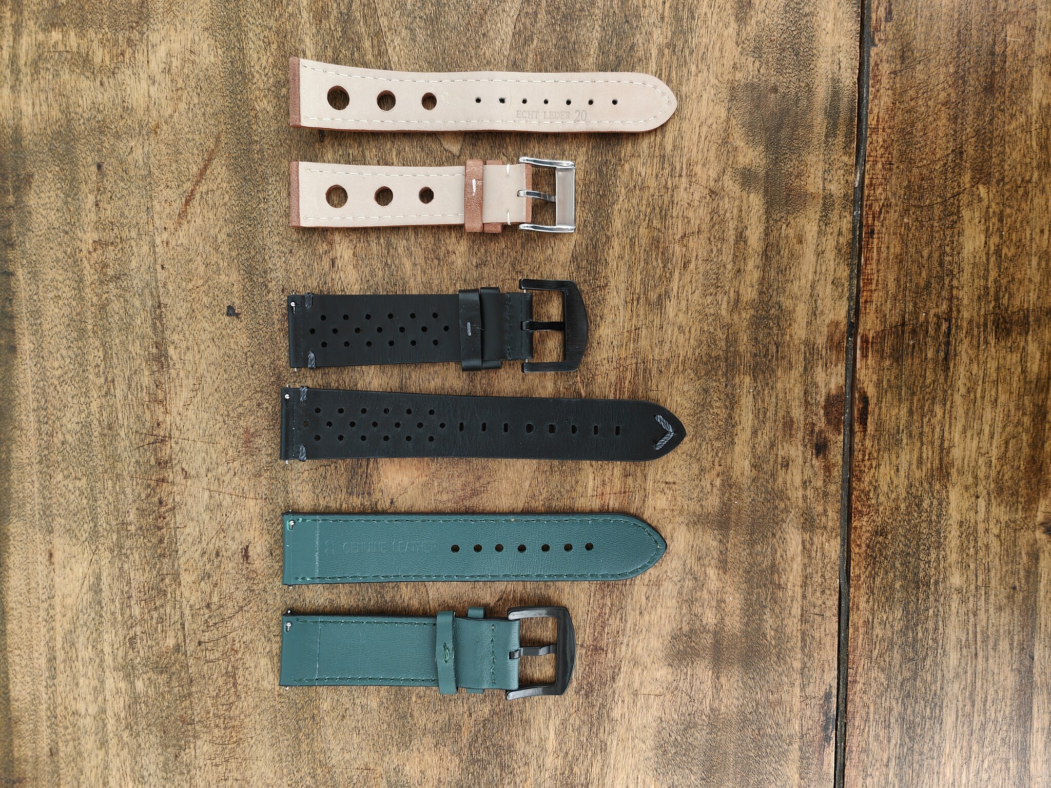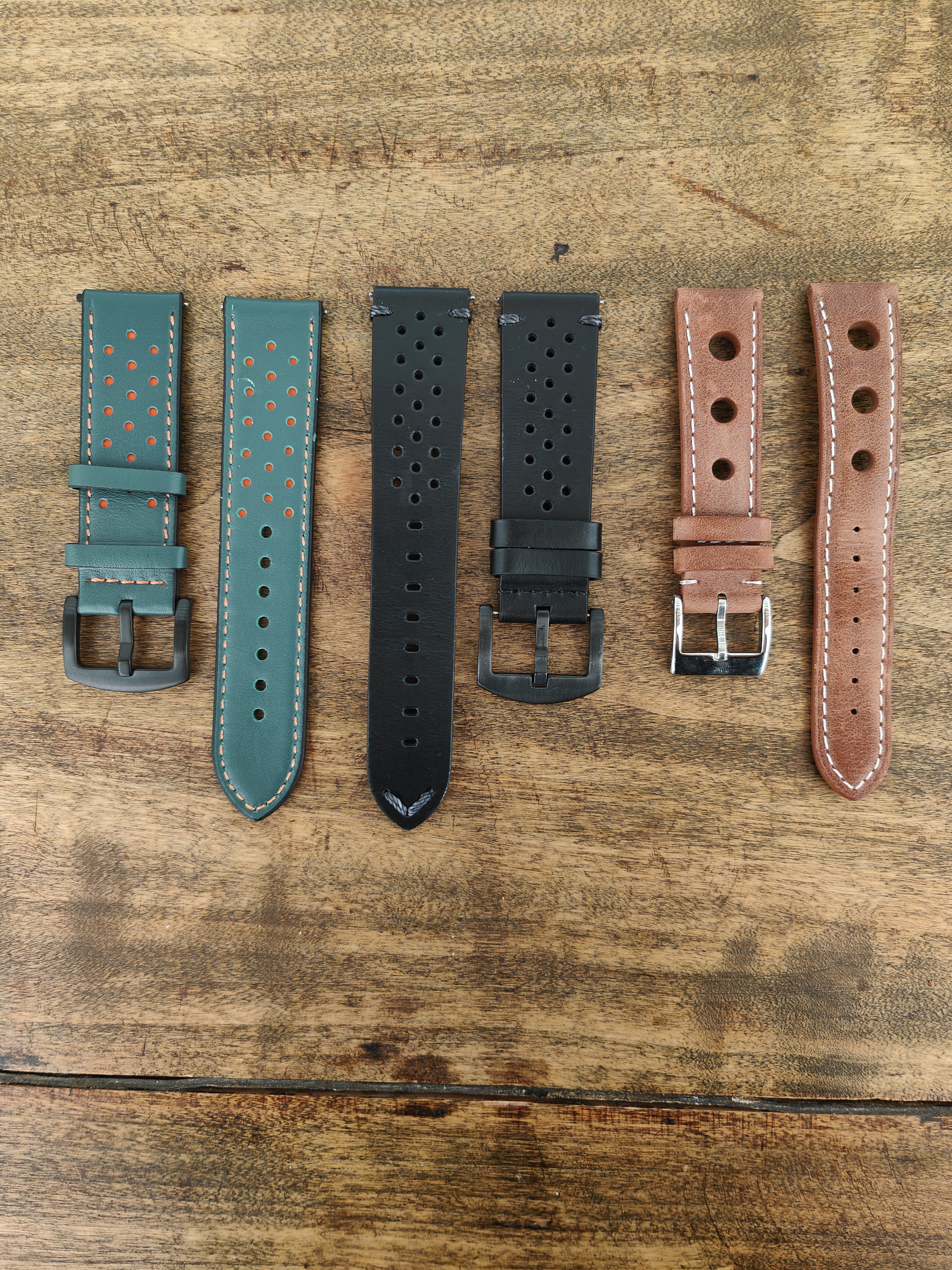 Vendo estas tres correas de piel nuevas y sin uso. La verde y la negra son de 22mm y de liberación rápida. La marrón es de 20mm.