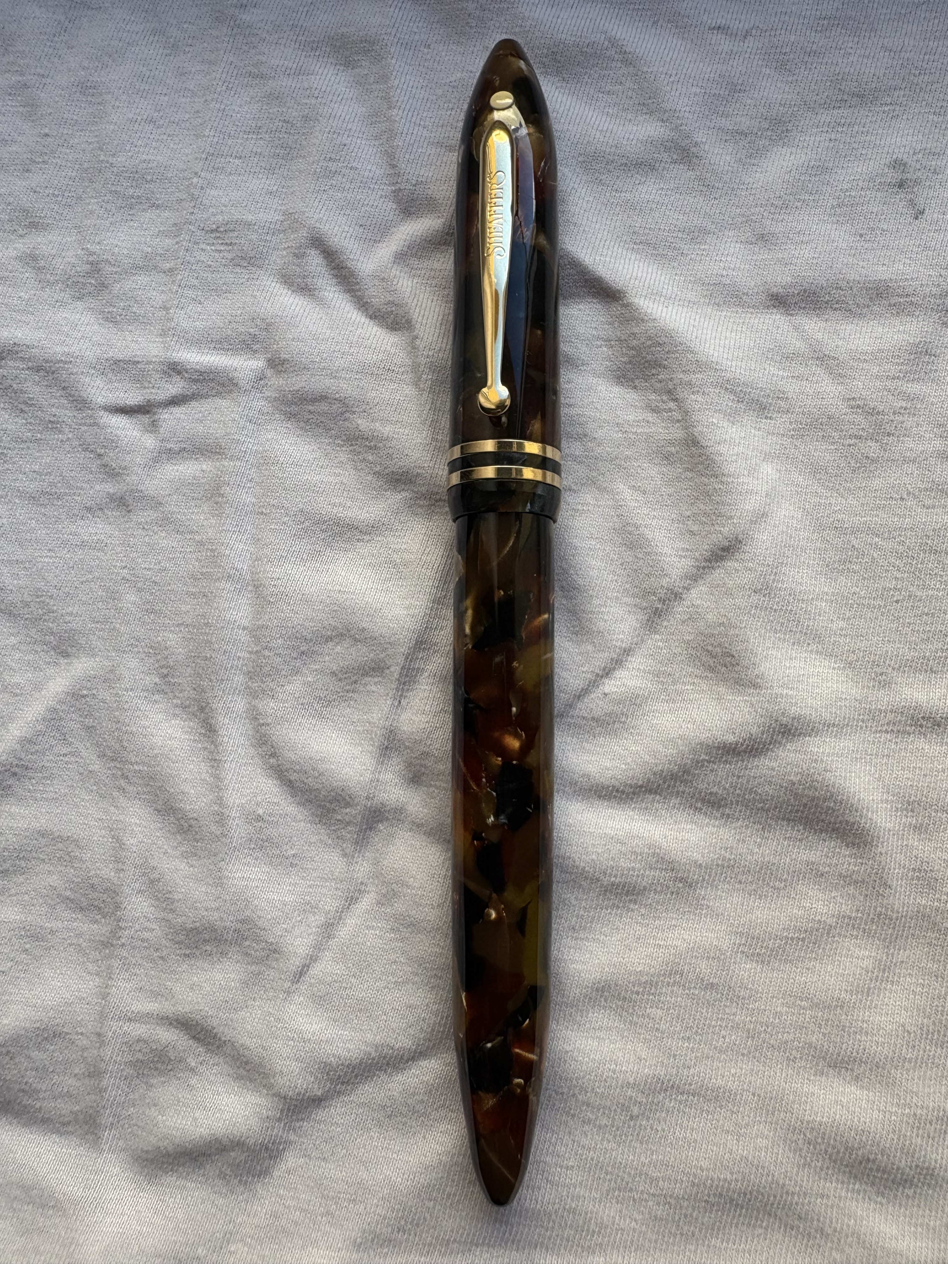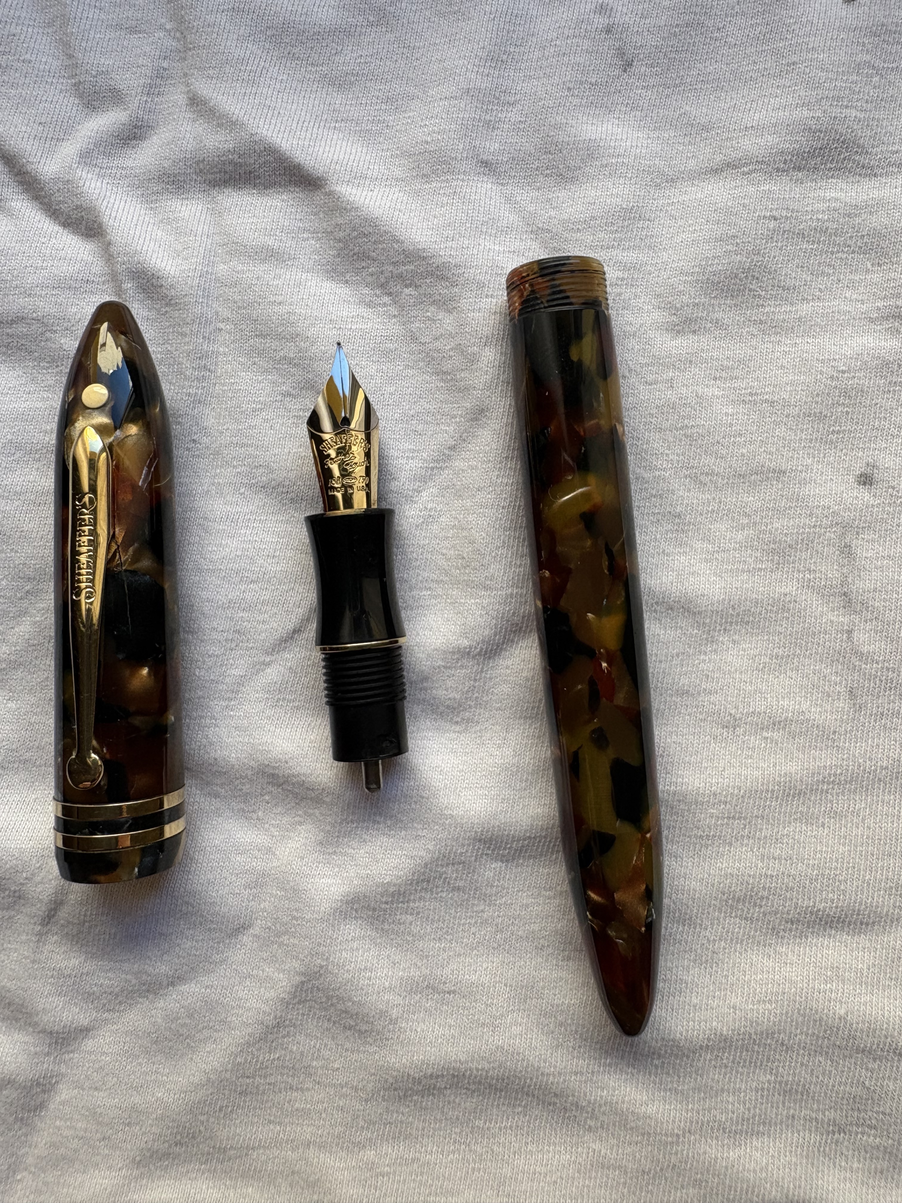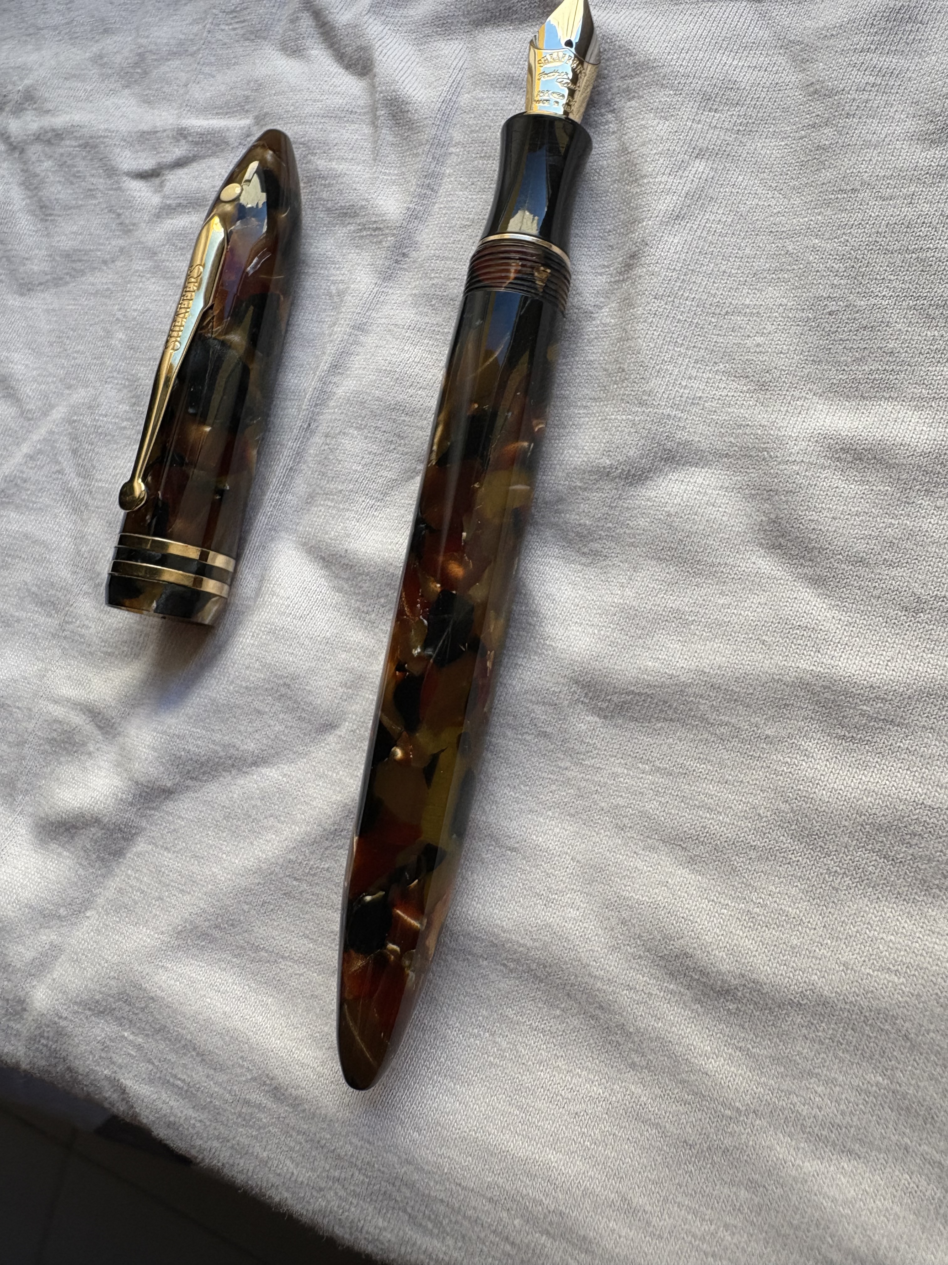 La siguiente es una Pelikan MN400 Tortoise Brown en buen estado, en un plumín Flex punto F. Precio……..165€ envío incluido por Correos, envío certificado. Unas fotos:
