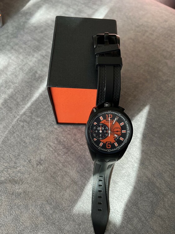 Asimismo el Chronograph está bien equilibrado y el dial Orange hace que sea el más buscado de este modelo por la belleza que le confiere y el contraste con el fondo así como el pvd negro arenado del reloj.