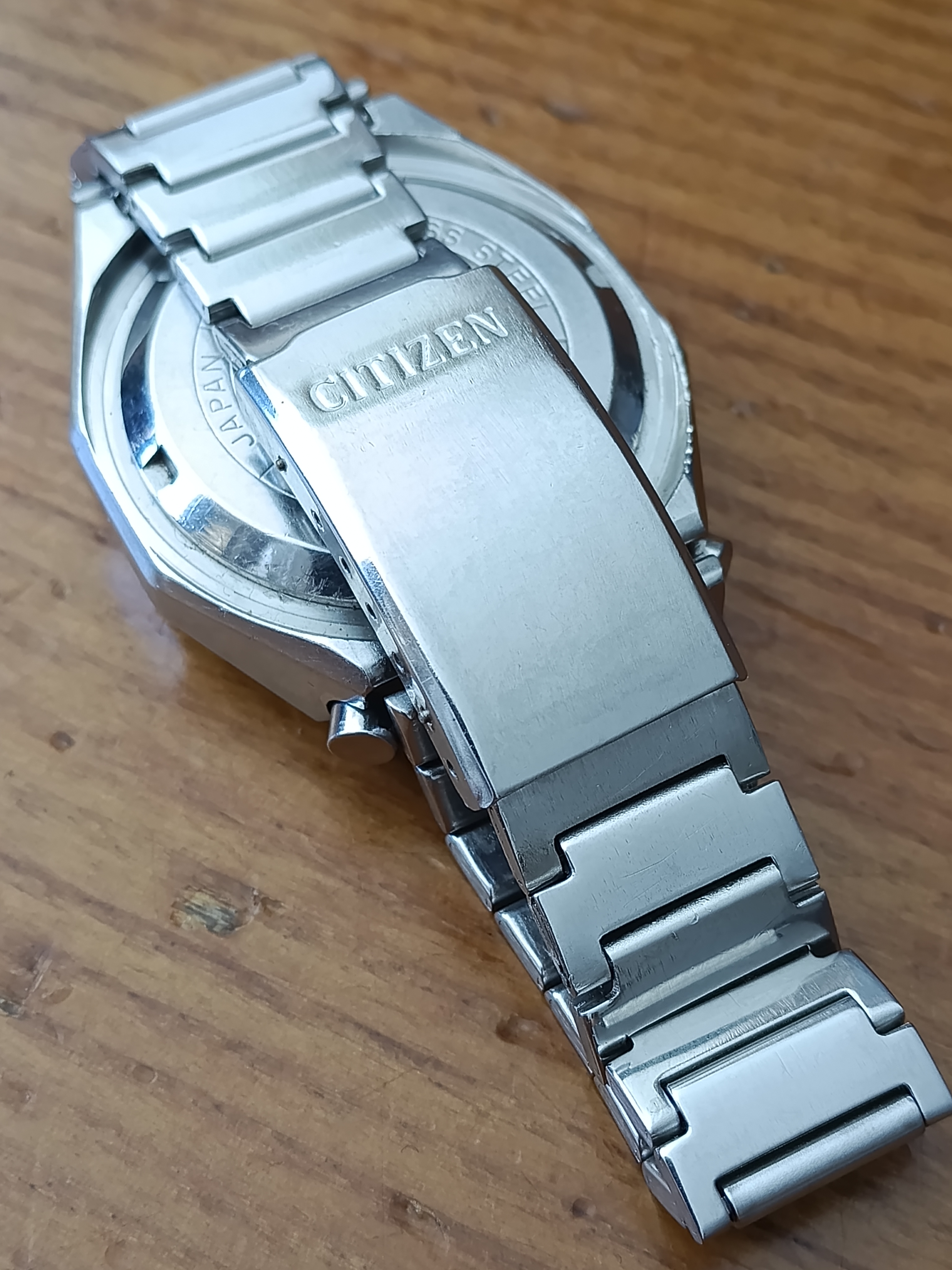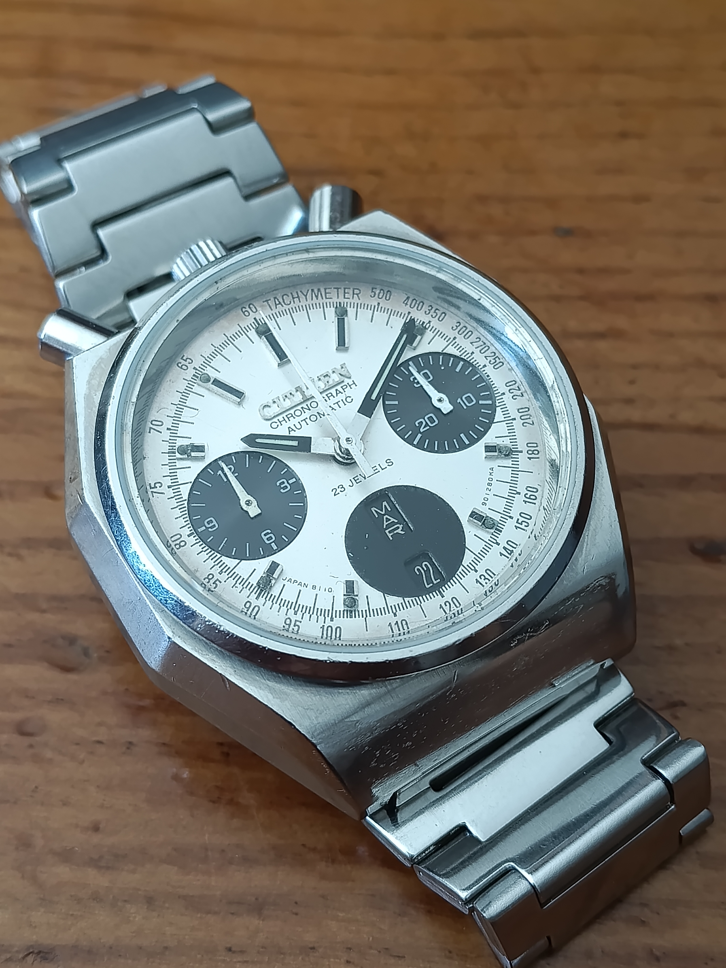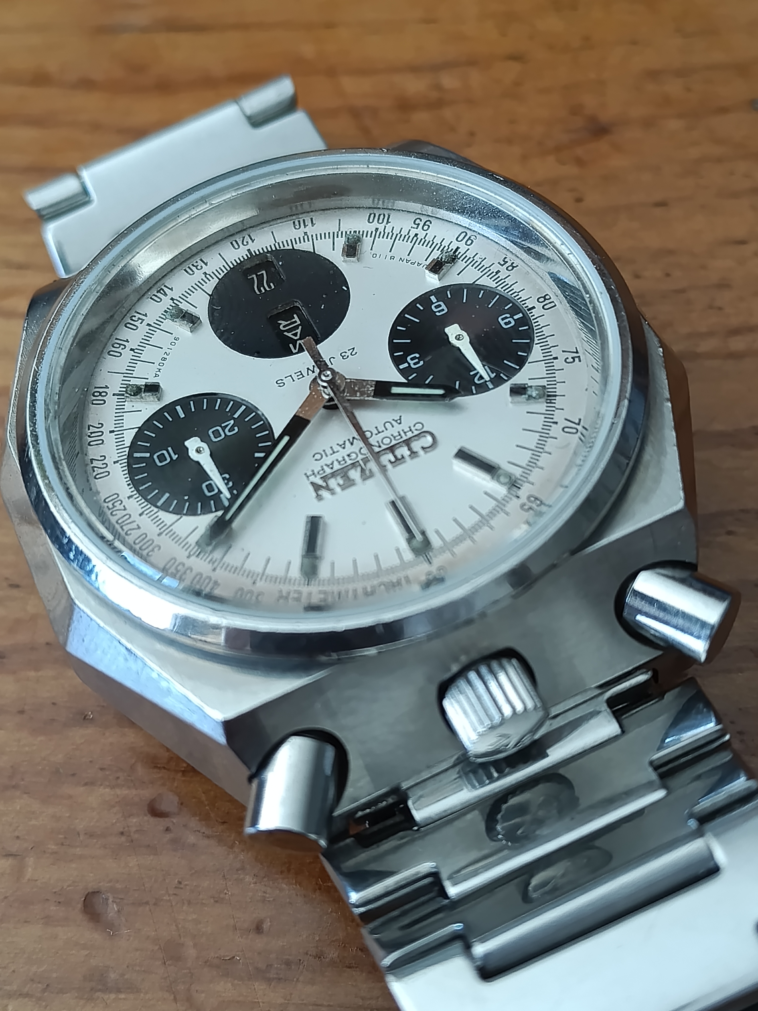 Es un Bullhead de 1979, con el calibre 8110 revisado hace menos de un año y funcionando reset a cero, fechador perfecto y manteniendo bien la hora y la carga. Brazalete para hasta 18cm de diámetro de muñeca y recién pasado por una limpieza con ultrasonidos.