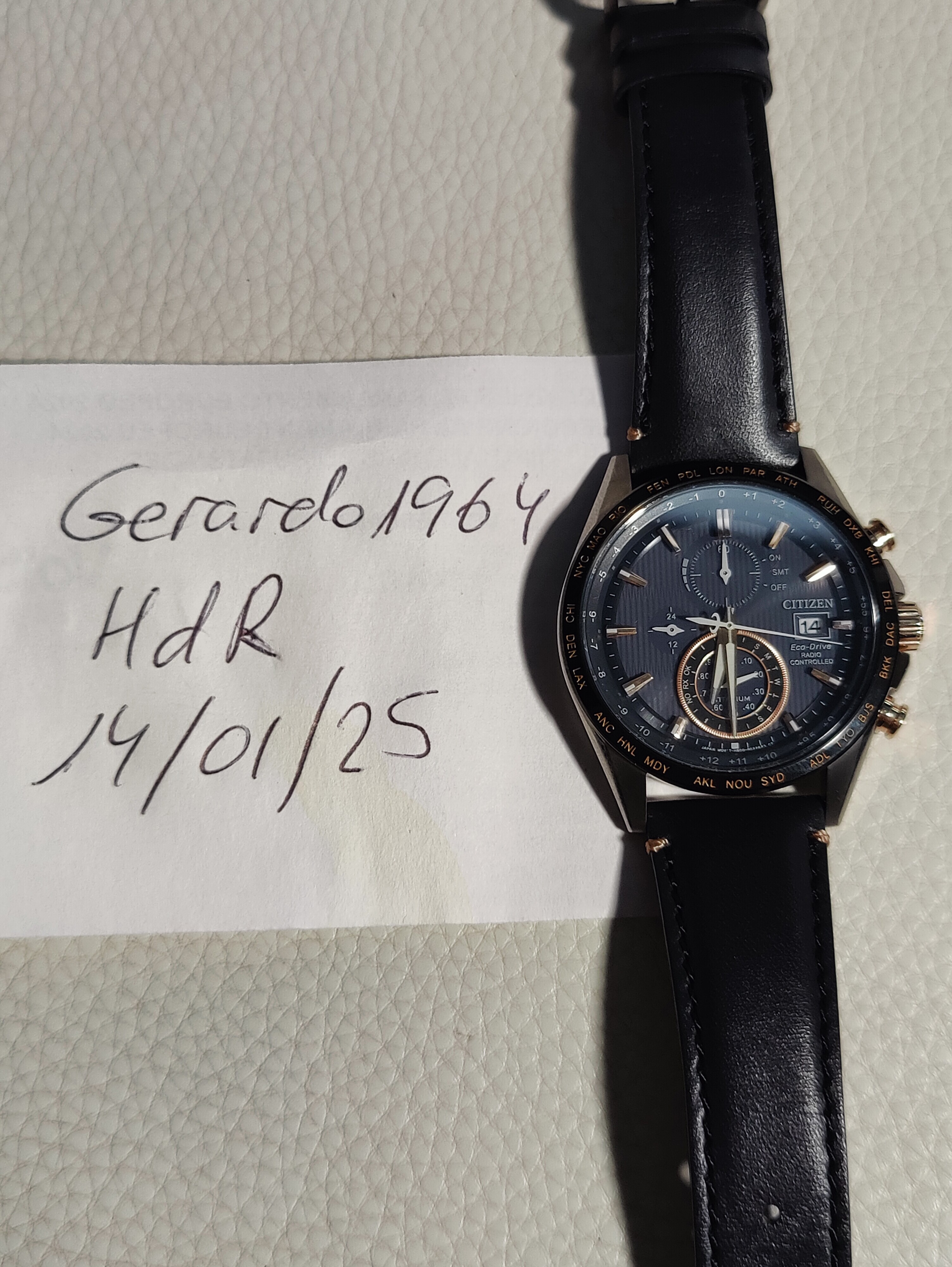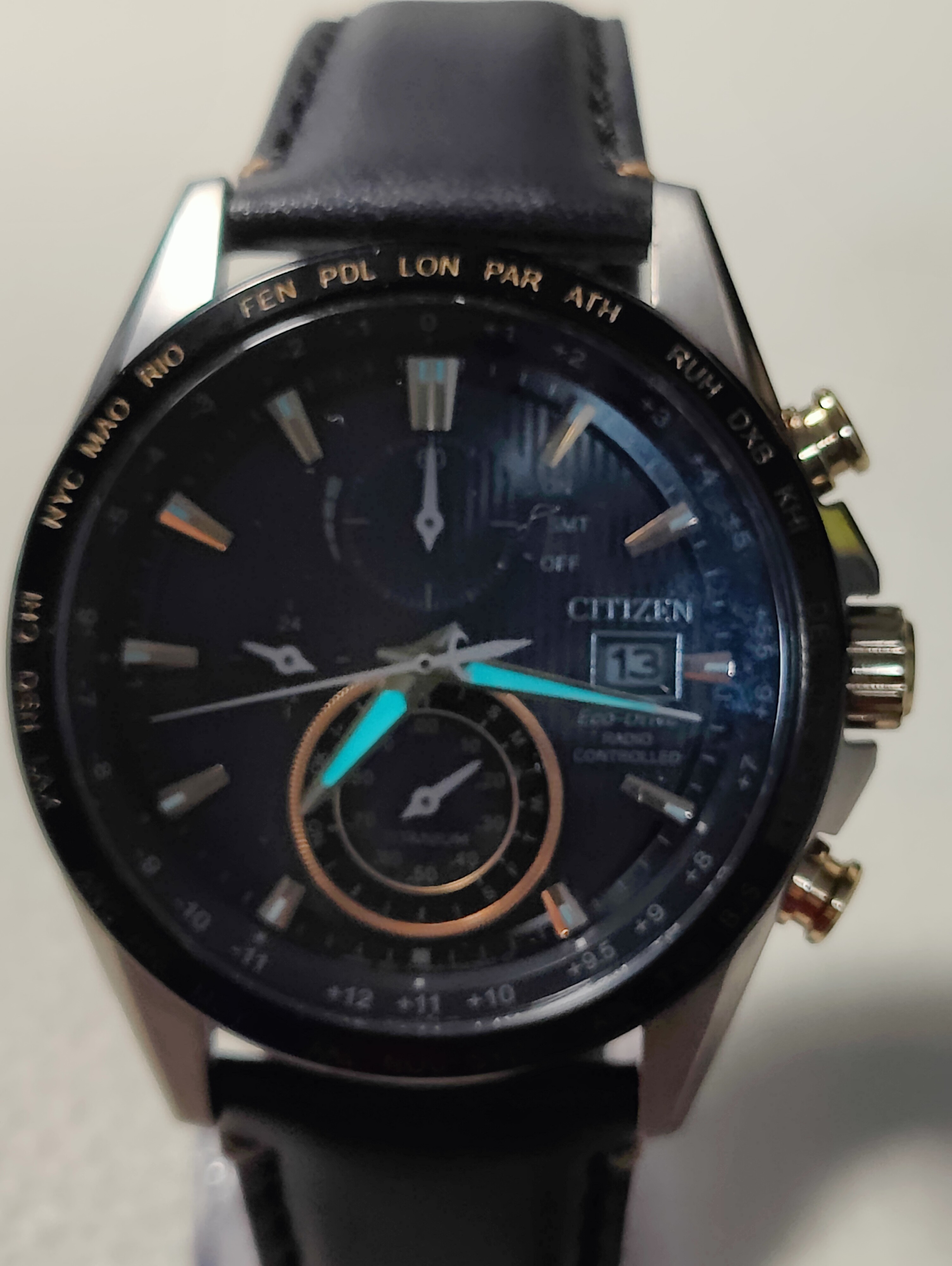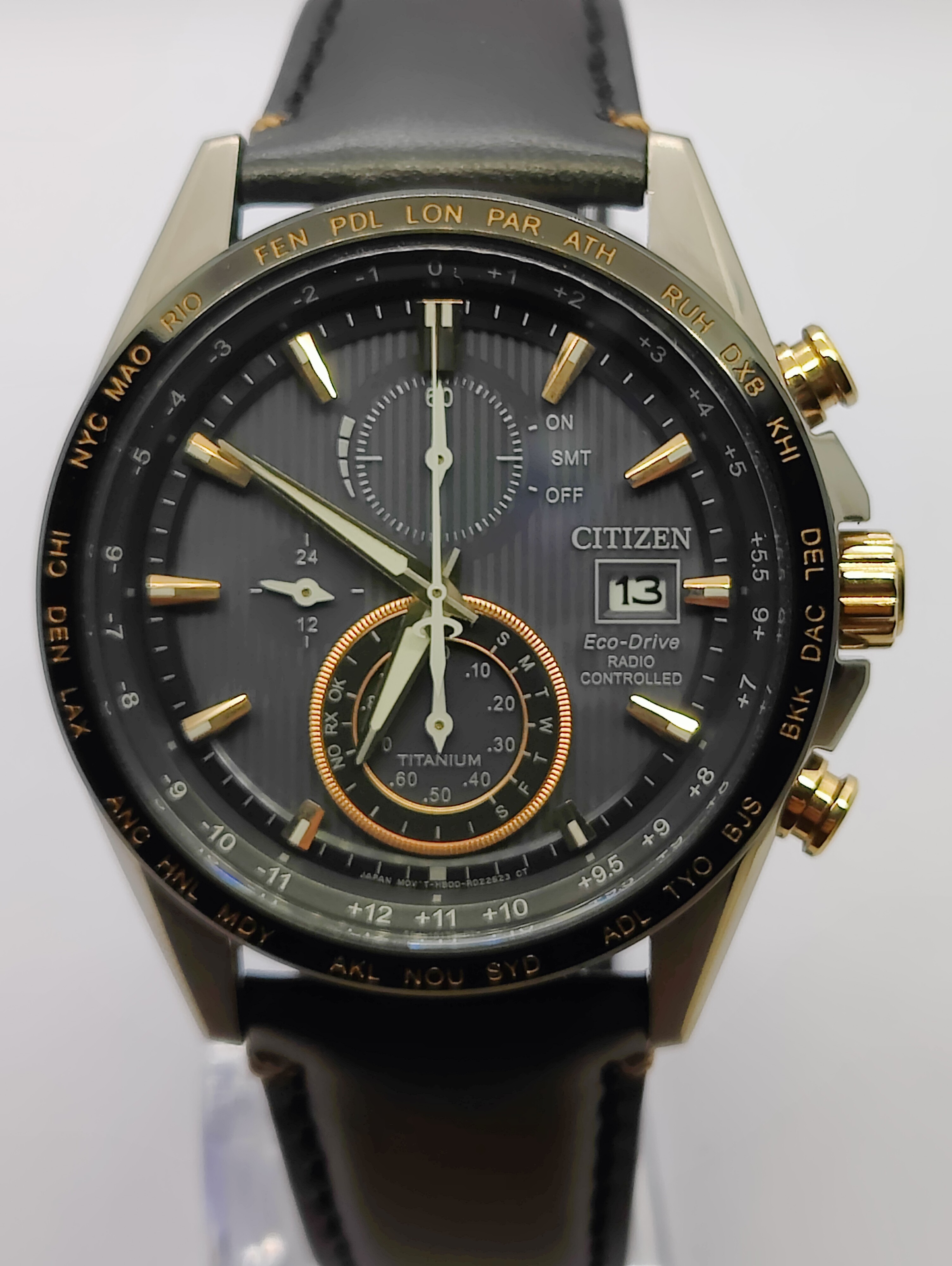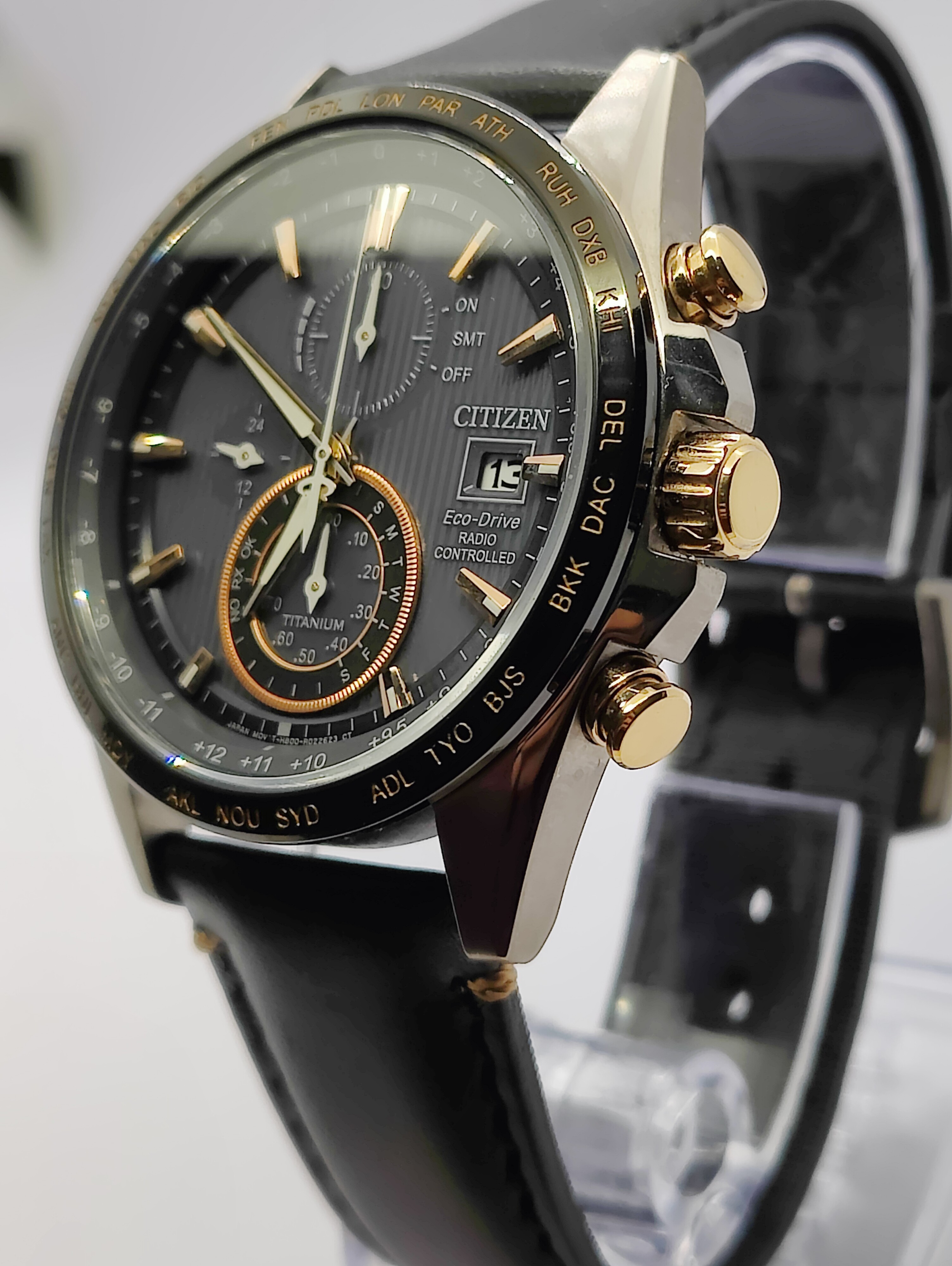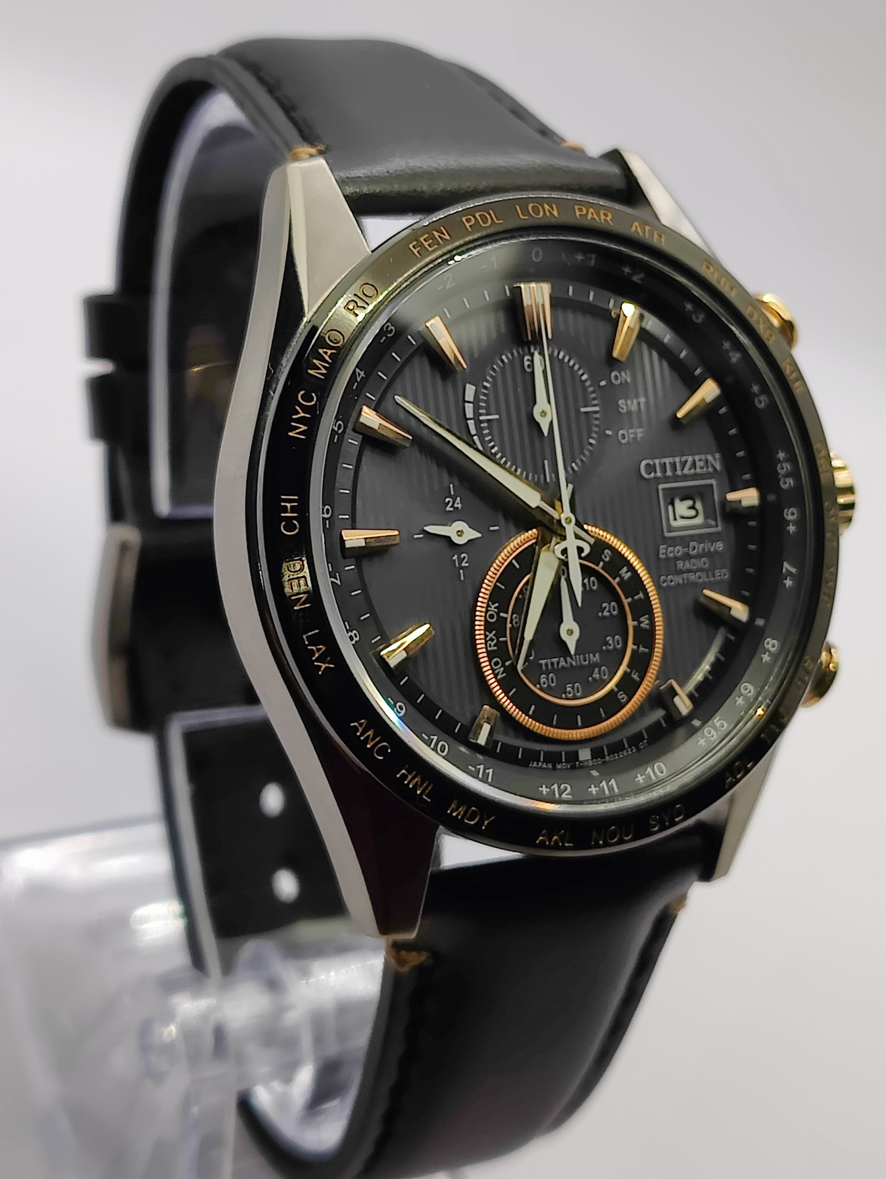 Reloj marca Citizen Radio controlado Eco Drive AT8158-14H. Caja de Titanio de 42,2mm de diametro y 12mm de grueso. Cristal de Zafiro. Resistencia al agua 100 mtrs. Correa de piel legitima. Funciones: Cronometro, fecha, dia semana Calendario perpetuo, GMT (doble uso horario), indicacion de carga. Agujas e indices luminiscentes. Con estuche original y documentación. Año fabricacion 2023. Articulo nuevo, no pressenta señales de uso.