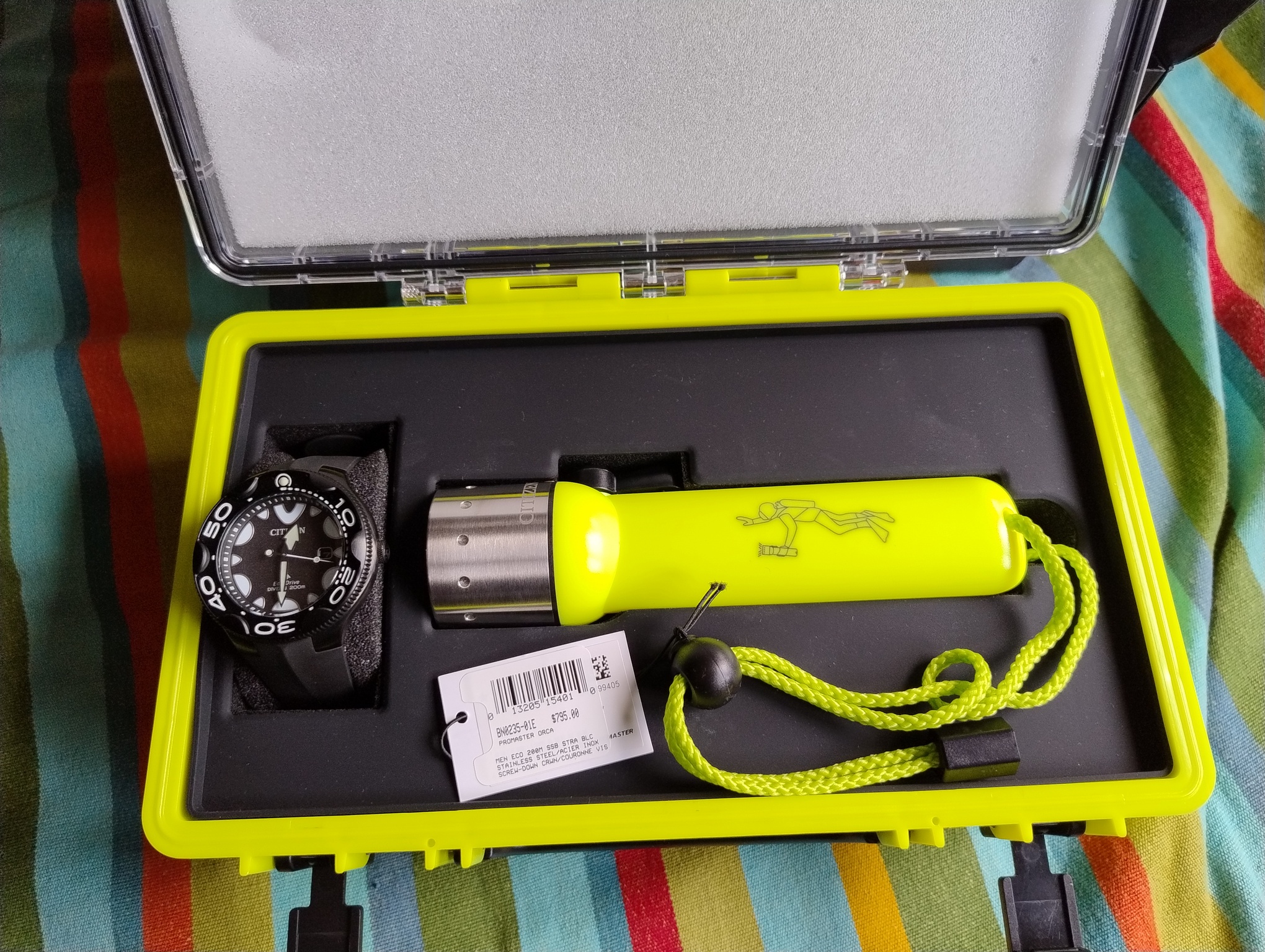 Este en especial viene con un kit en el cual se incluye una linterna marca ledlenser, que por lo que he estado mirando es una marca que fabrica linternas de calidad, y este modelo en concreto es una linterna de buceo auténtica que ya cuesta su dinero. En concreto es esta: