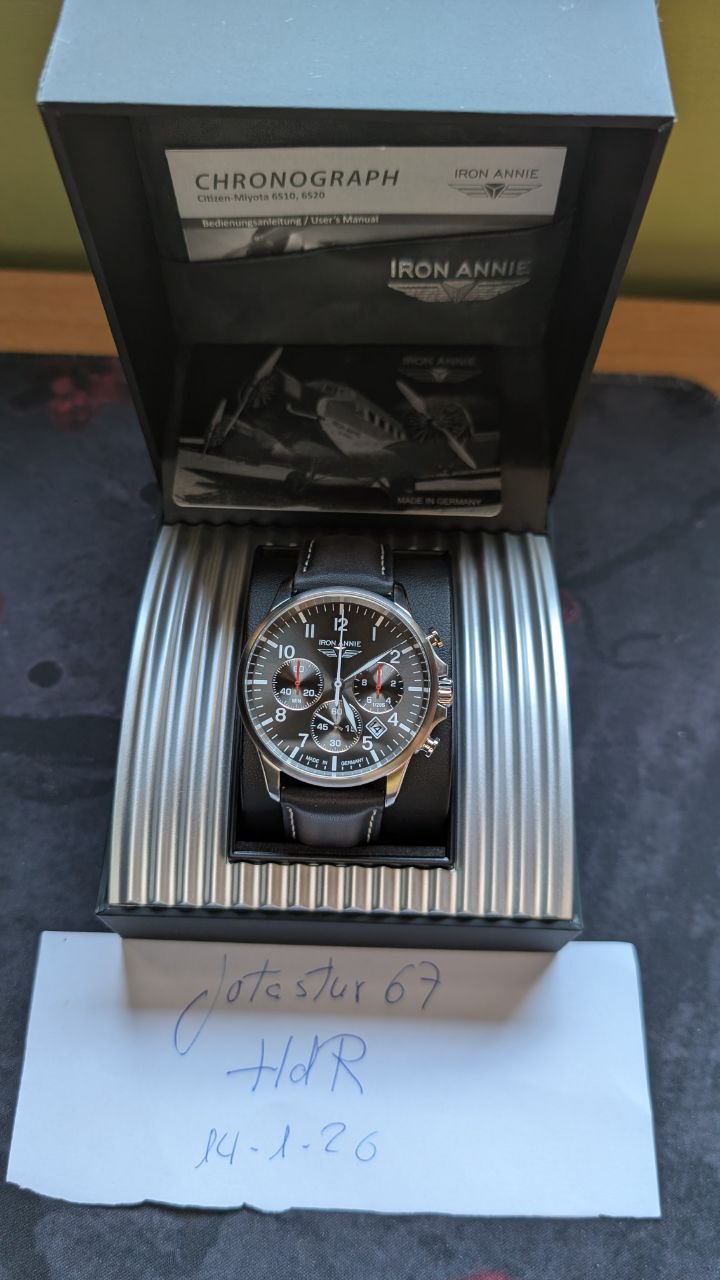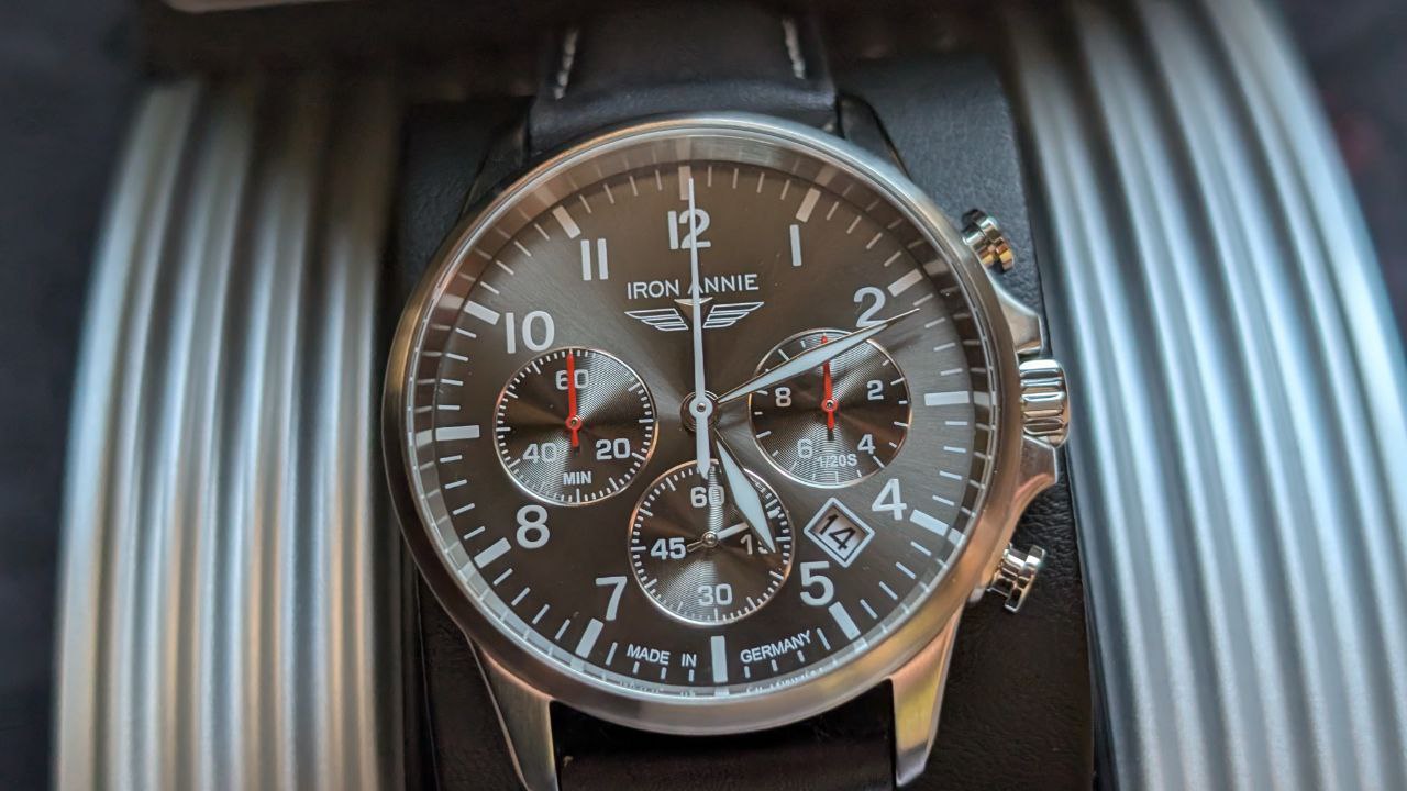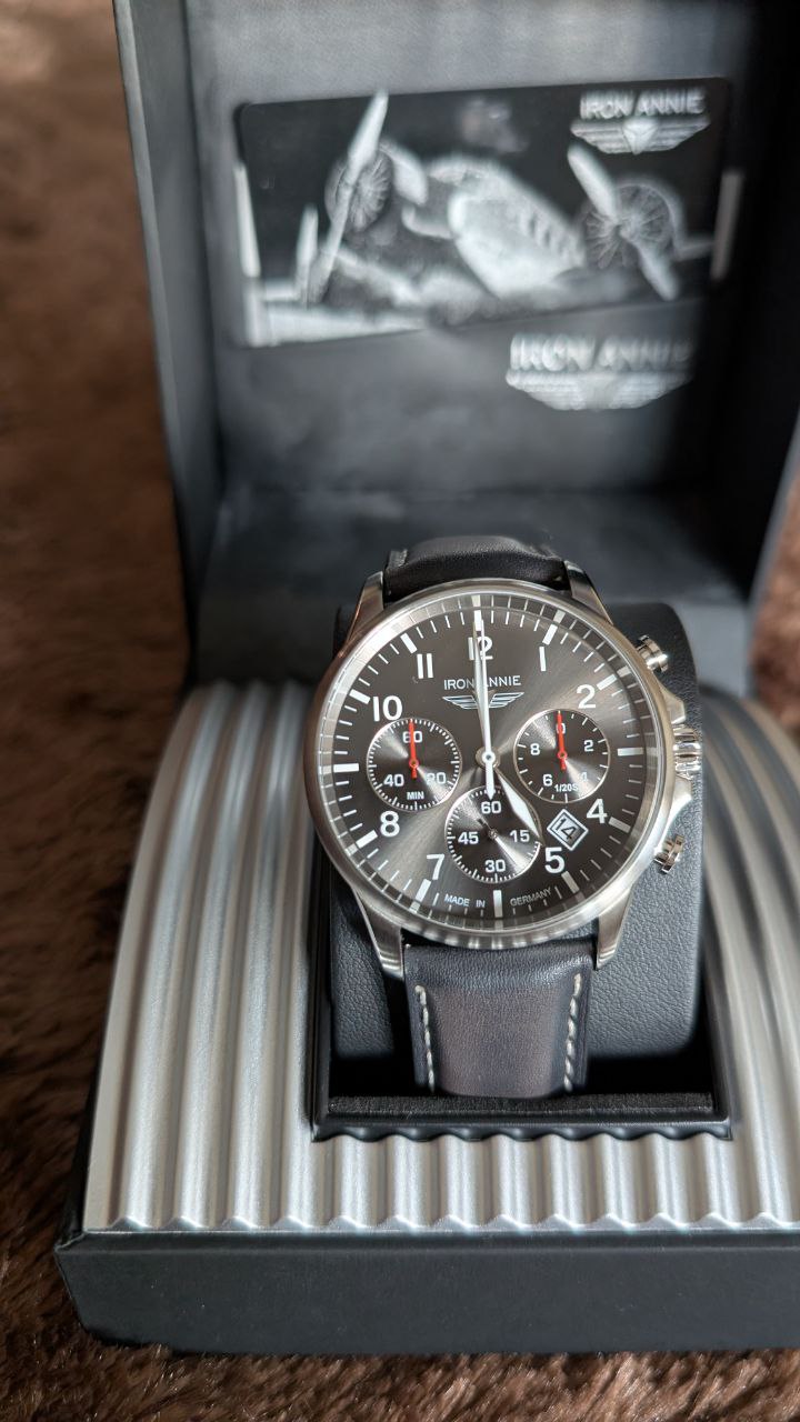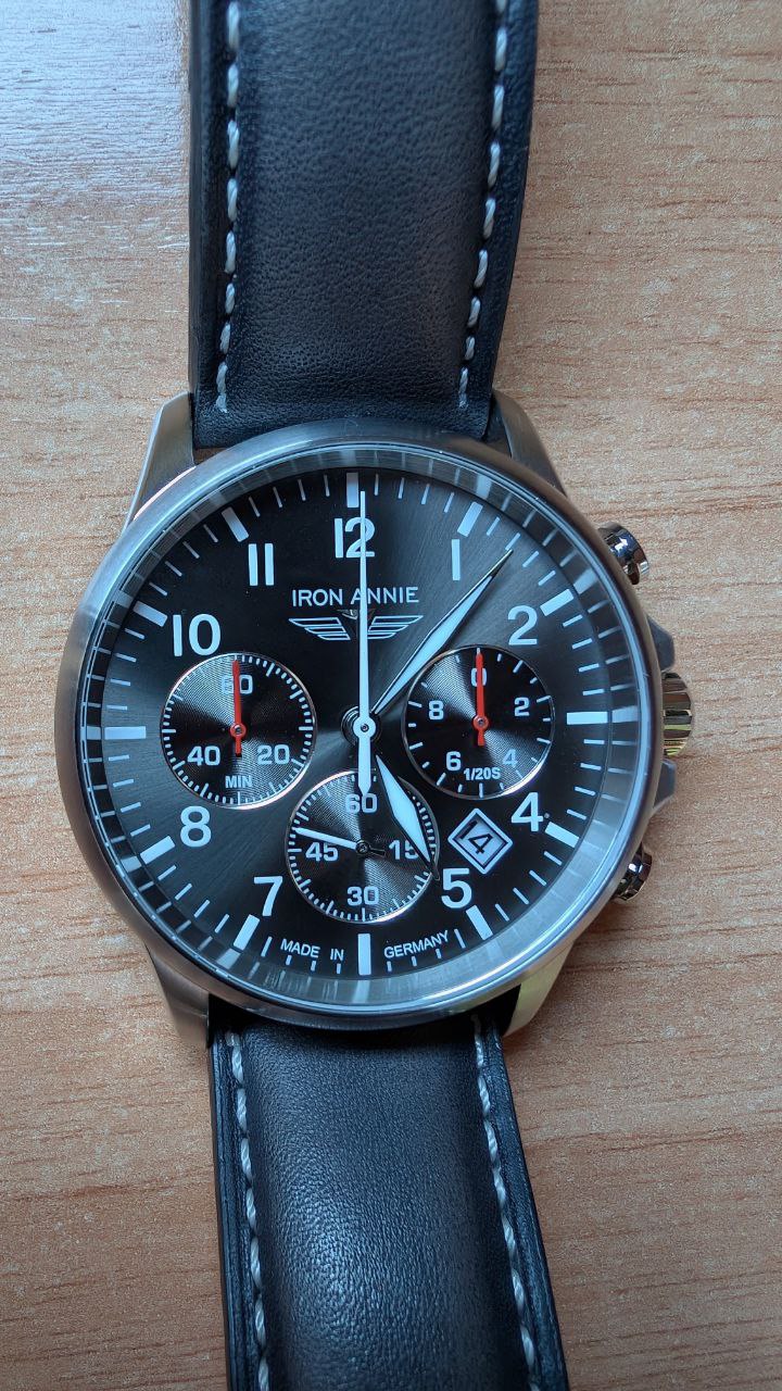 Es un cronógrafo de aviador de la casa alemana IRON ANNIE, serie Captain’s Line concretamente el modelo 5872-2.