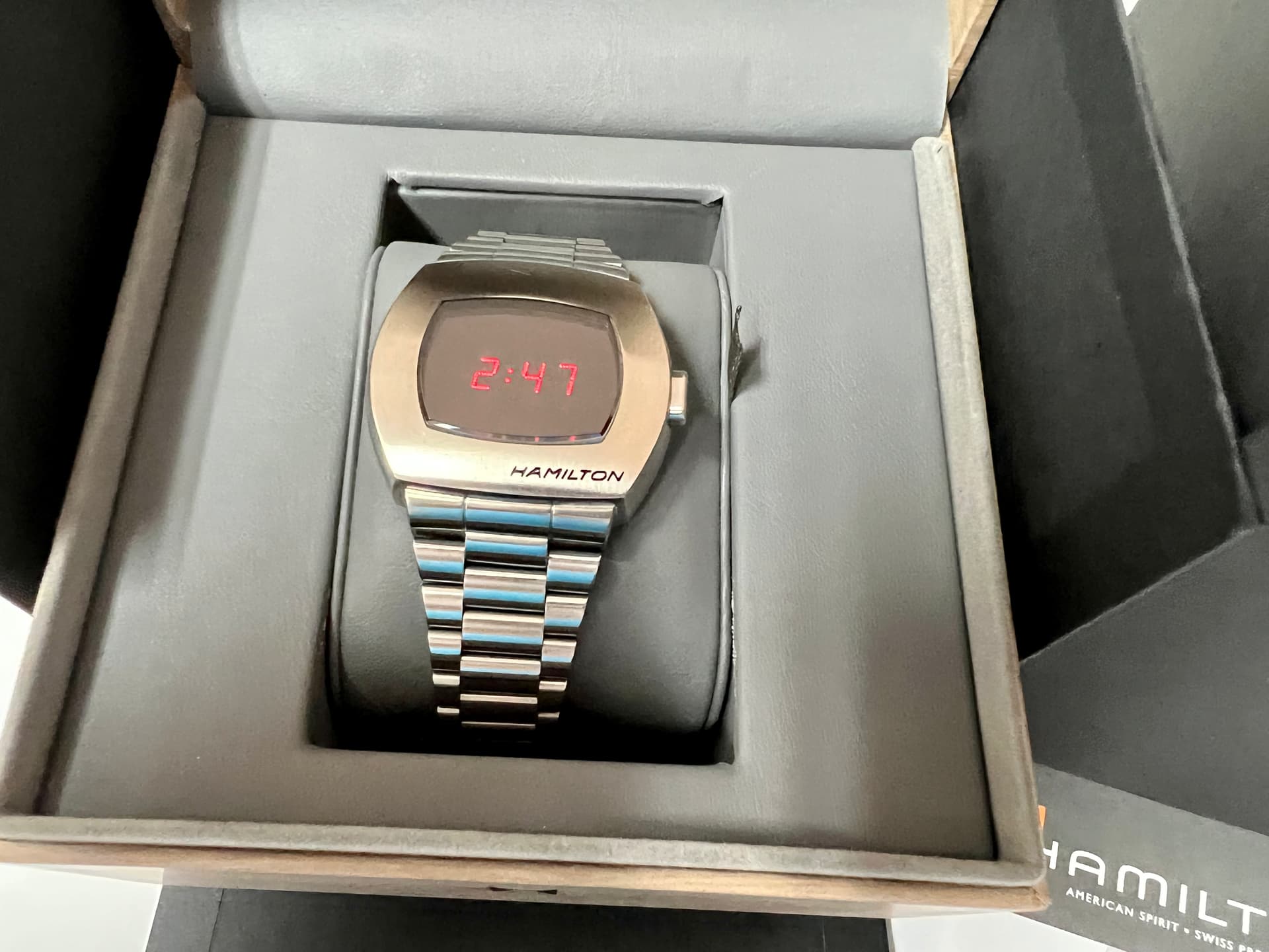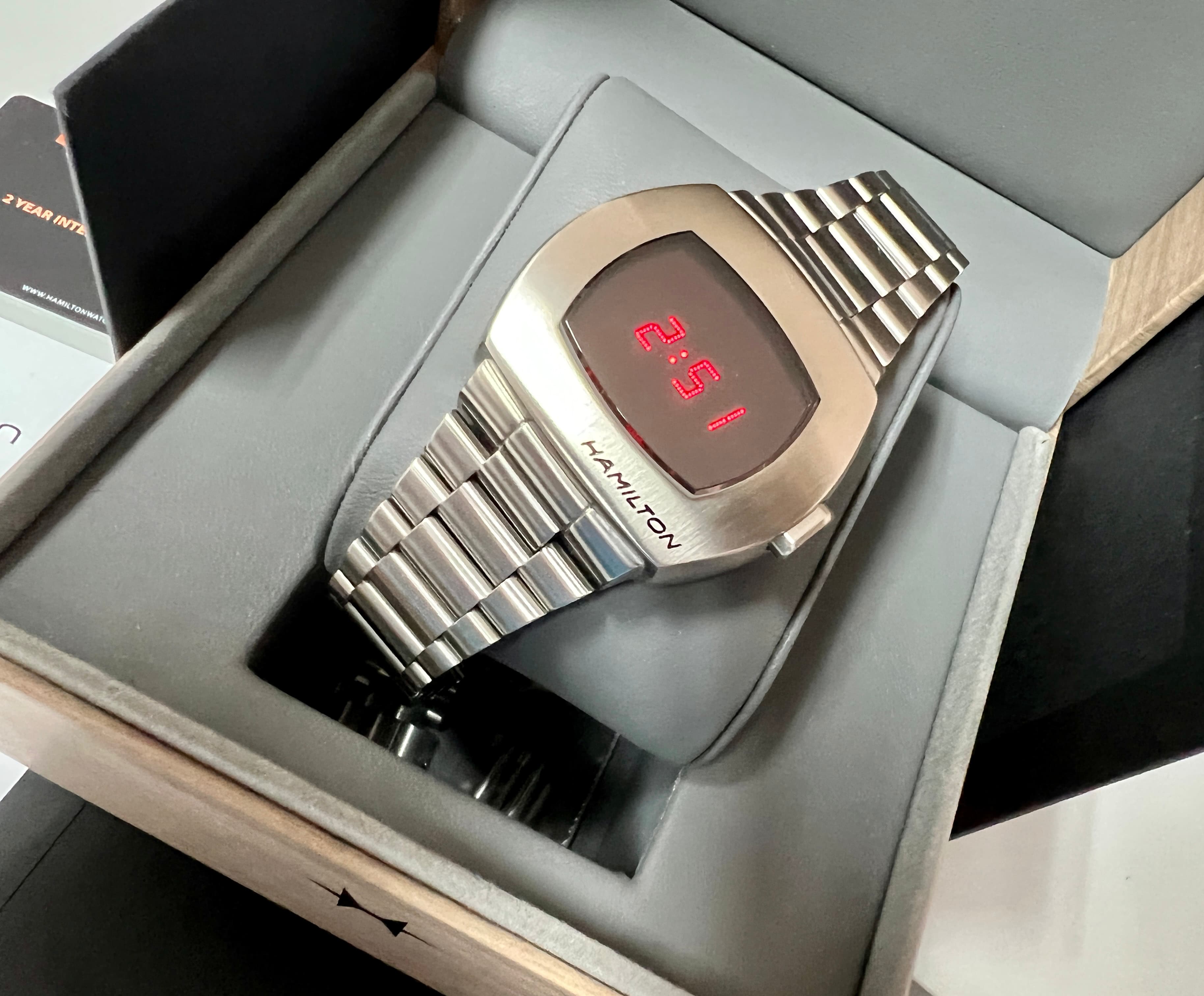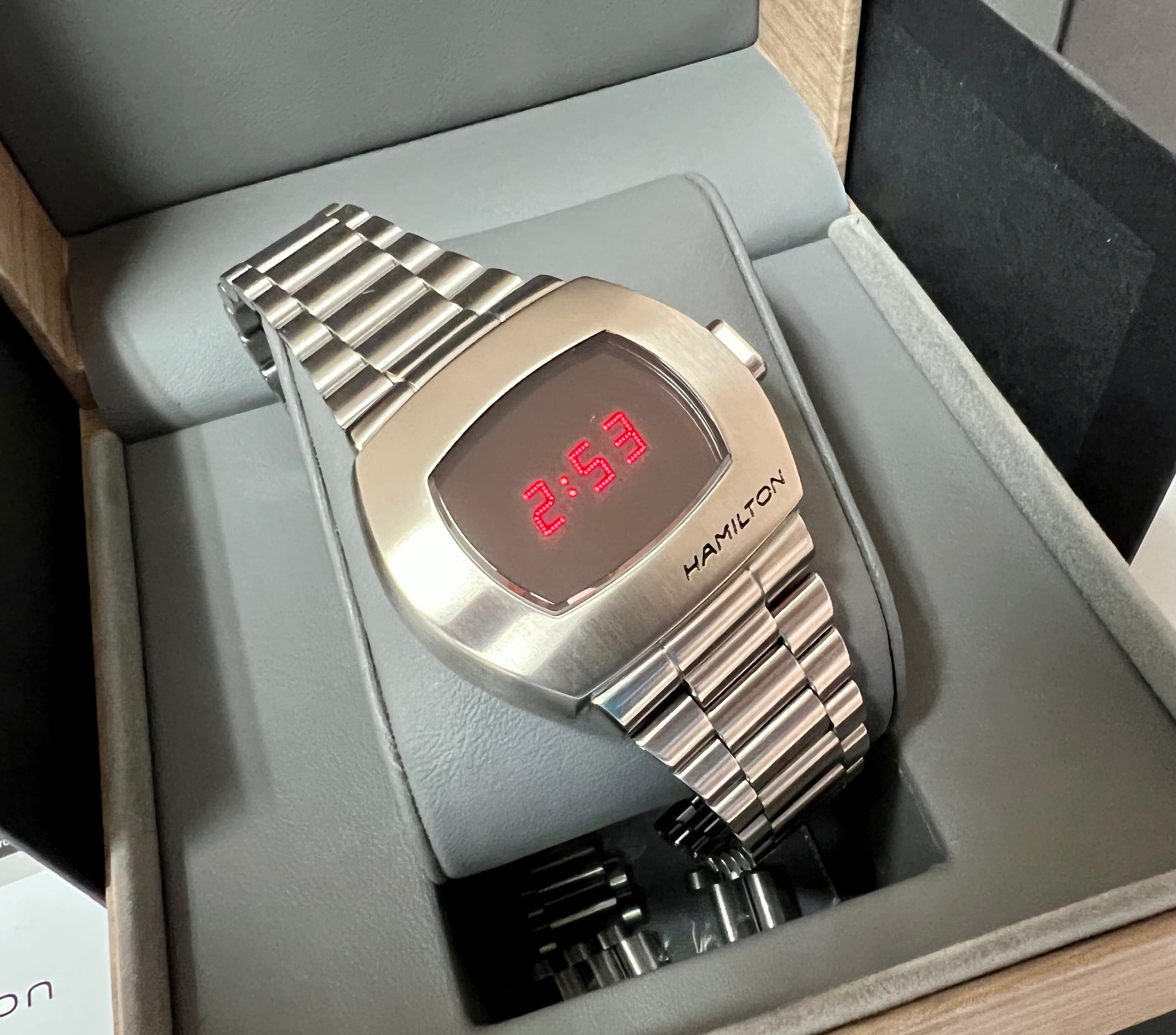 Como muchos sabrán se trata de la reedición actualizada del primer reloj digital, el Hamilton Pulsar de 1970 pero puesto al día con visualización híbrida de hora (led), zafiro con anti reflejos, resistente al agua 100m… etc.