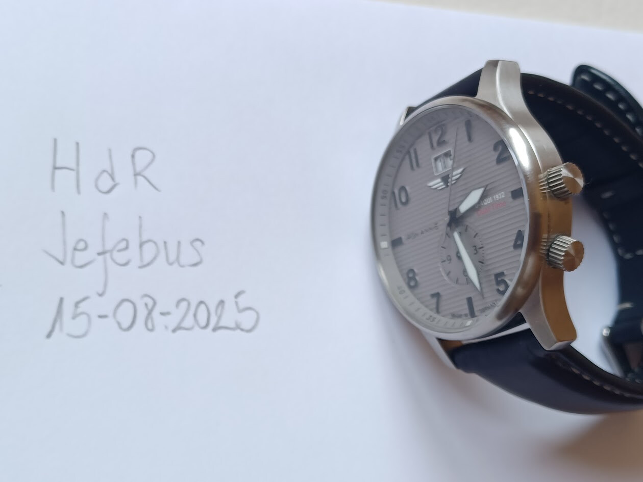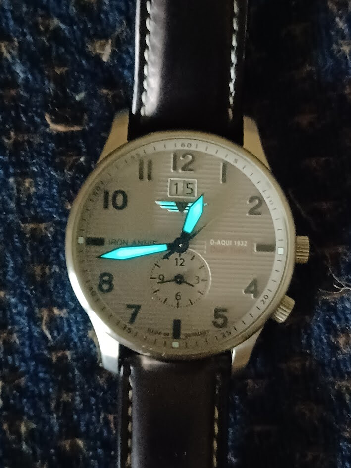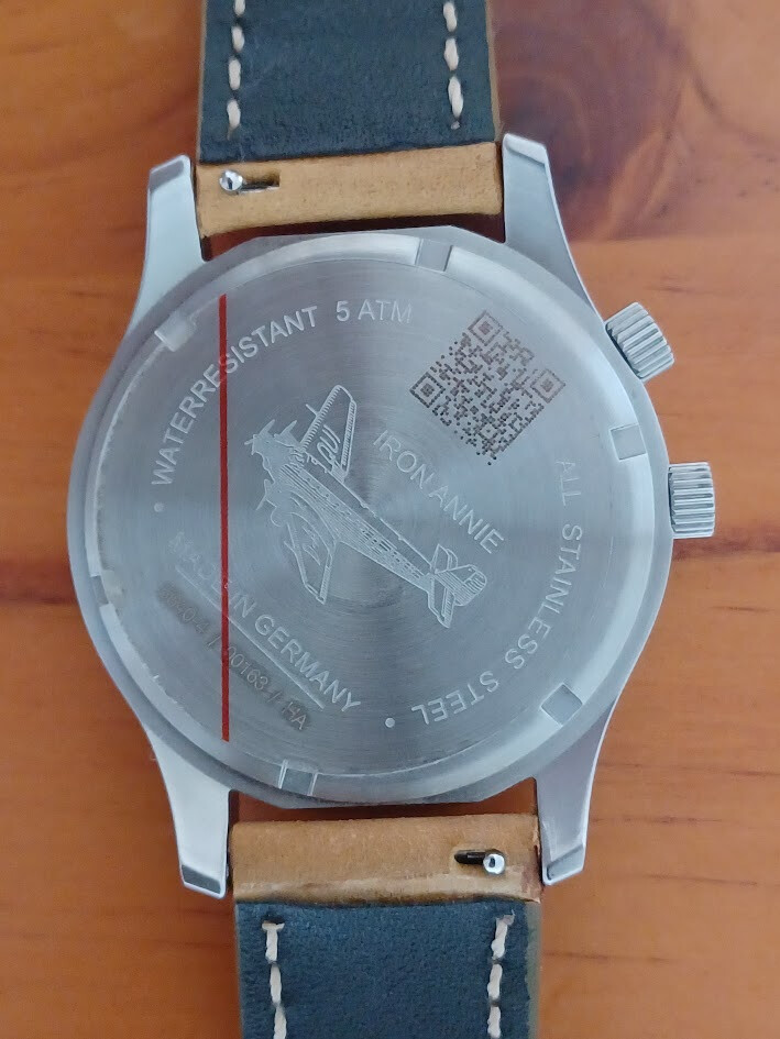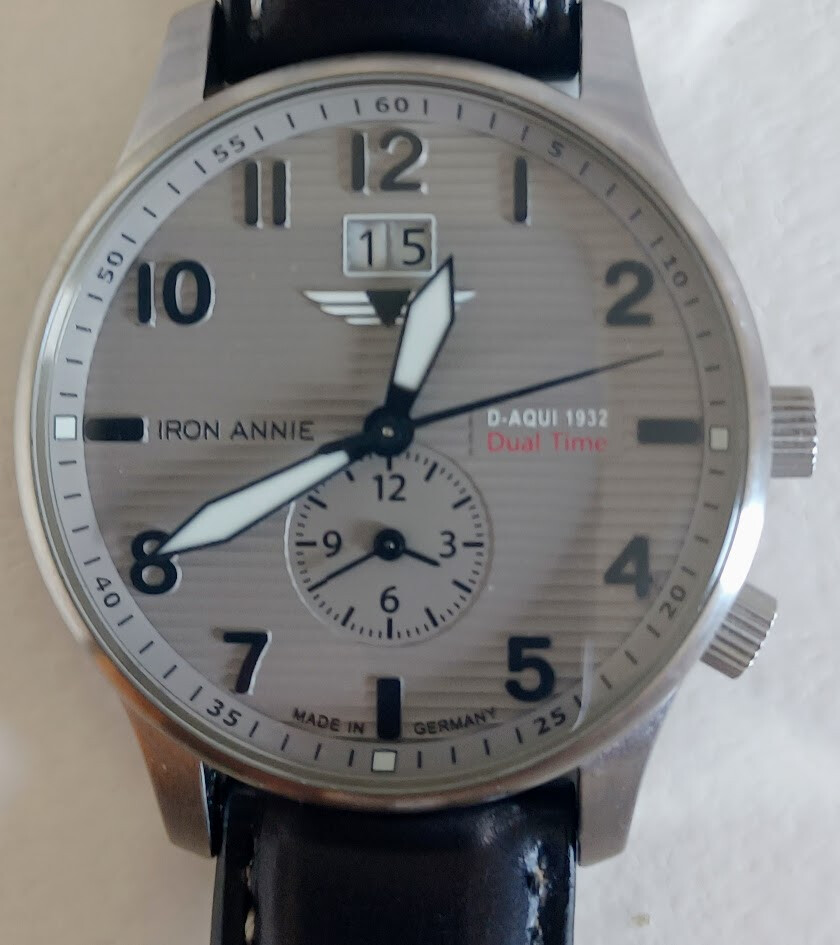 Pongo a la venta este Iron Annie made in Germany, comprado en 2024, aún en garantía. Tiene una esfera gris plateada con textura acanalada que recuerda a fuselaje del avión al que homenajea, índices negros y agujas con material luminiscente. A las 12:00 lleva una ventana grande para la fecha, y a las 6:00 una subesfera que se puede ajustar por separado para mostrar otra zona horaria.