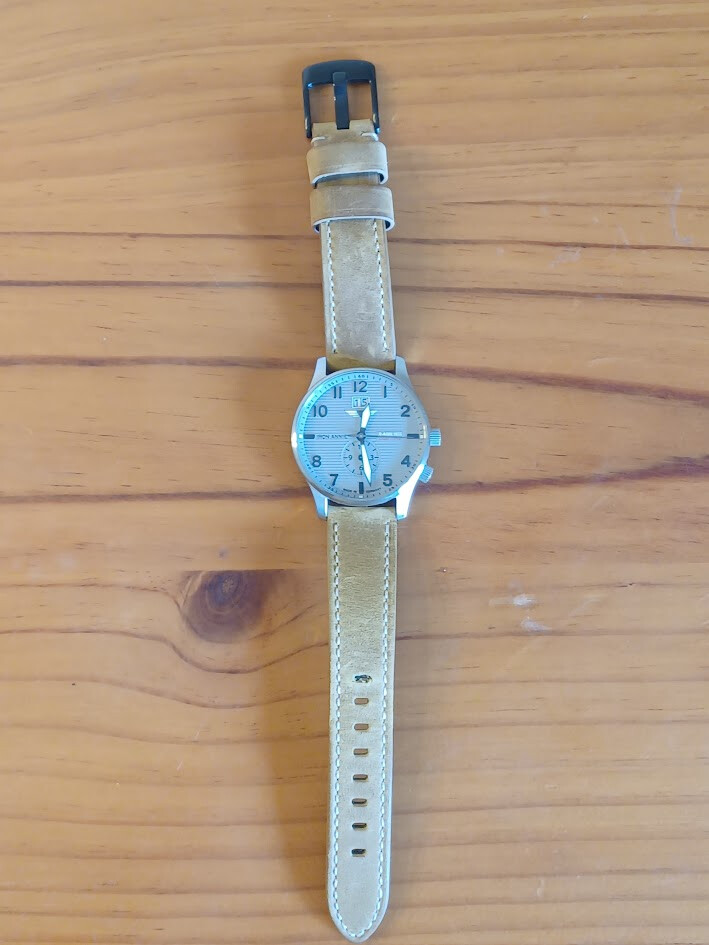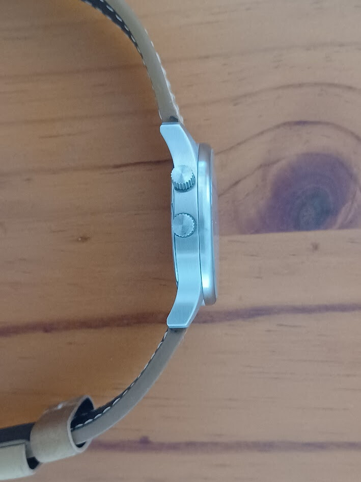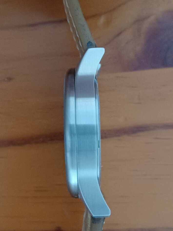 Funciona con un movimiento suizo de cuarzo Ronda 6203.B. La caja de acero inoxidable tiene un acabado cepillado, mide 42 mm y resiste hasta 50 metros bajo el agua. Viene con una correa de cuero negro con costuras blancas en contraste. Añado una segunda correa marrón tipo gamuza.