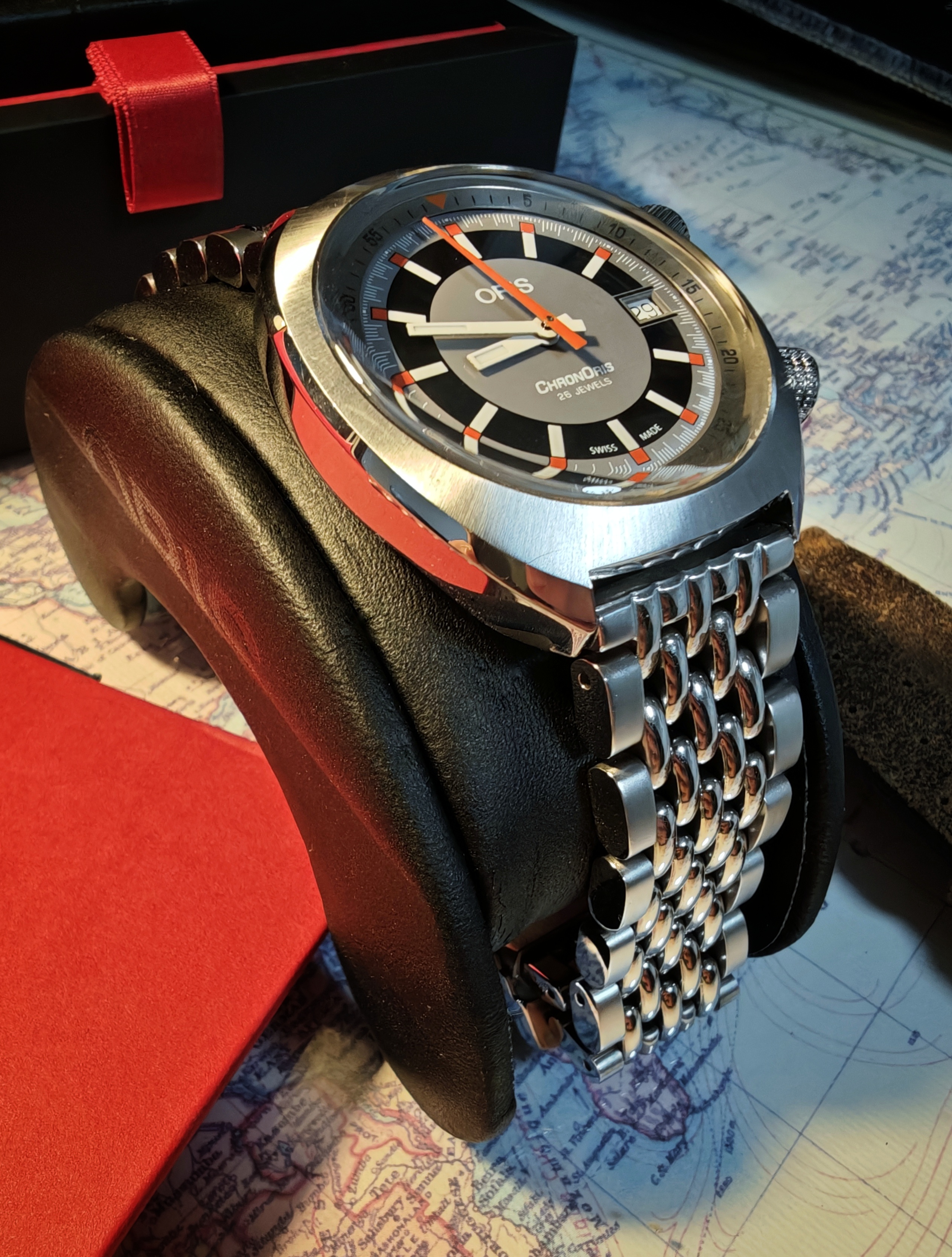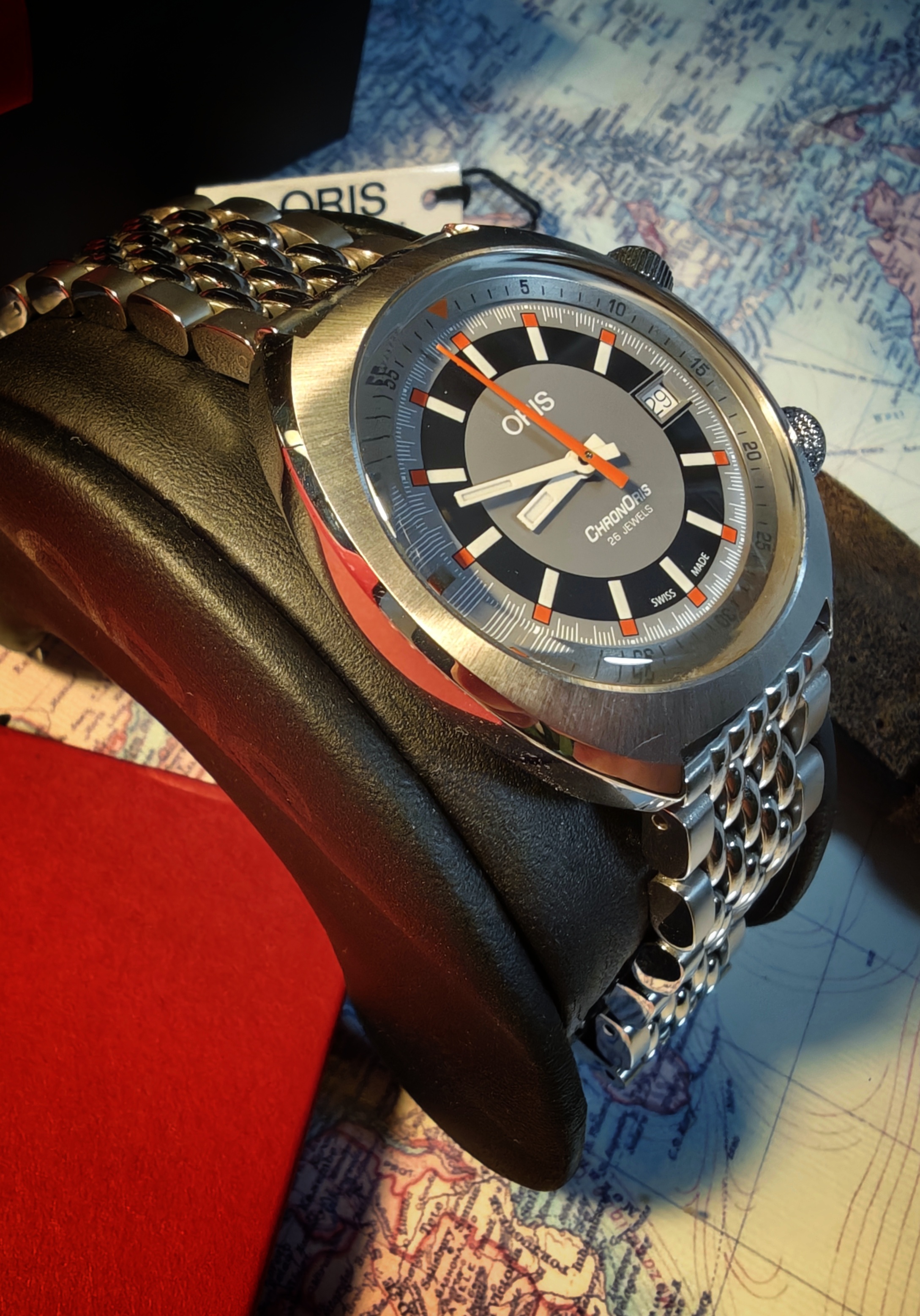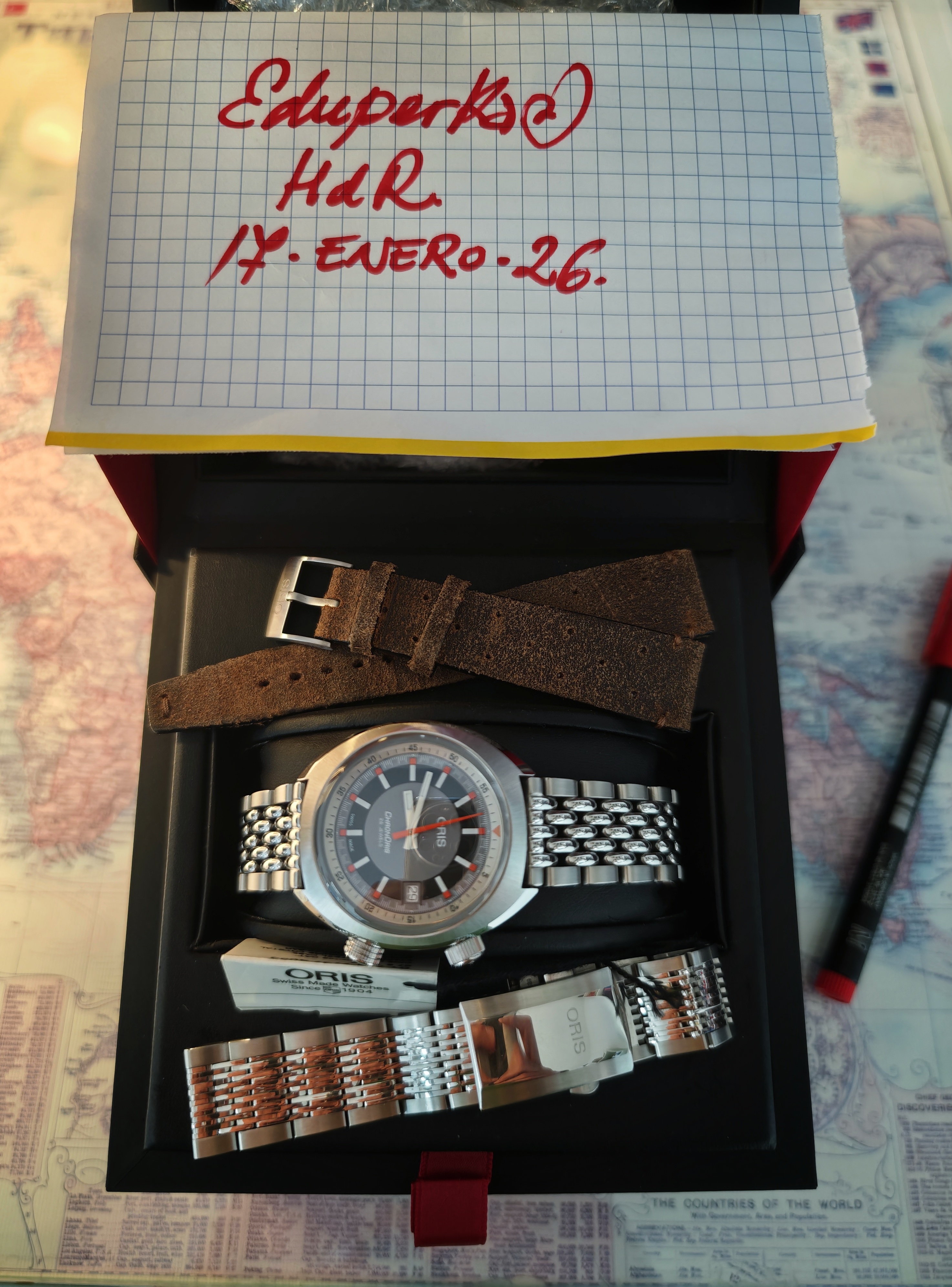 Saco mi Oris Chronoris tres agujas. El reloj es del año 2021. Un reloj poco visto con una calidad tremenda en cuanto a variedad de acabados, pulidos, cepillados en rayos de sol, cristal abombado estupendo por la nitidez y el anti reflejo, etc. Tiene muchos detalles. Un doble corona con diseño distinto para cada una.