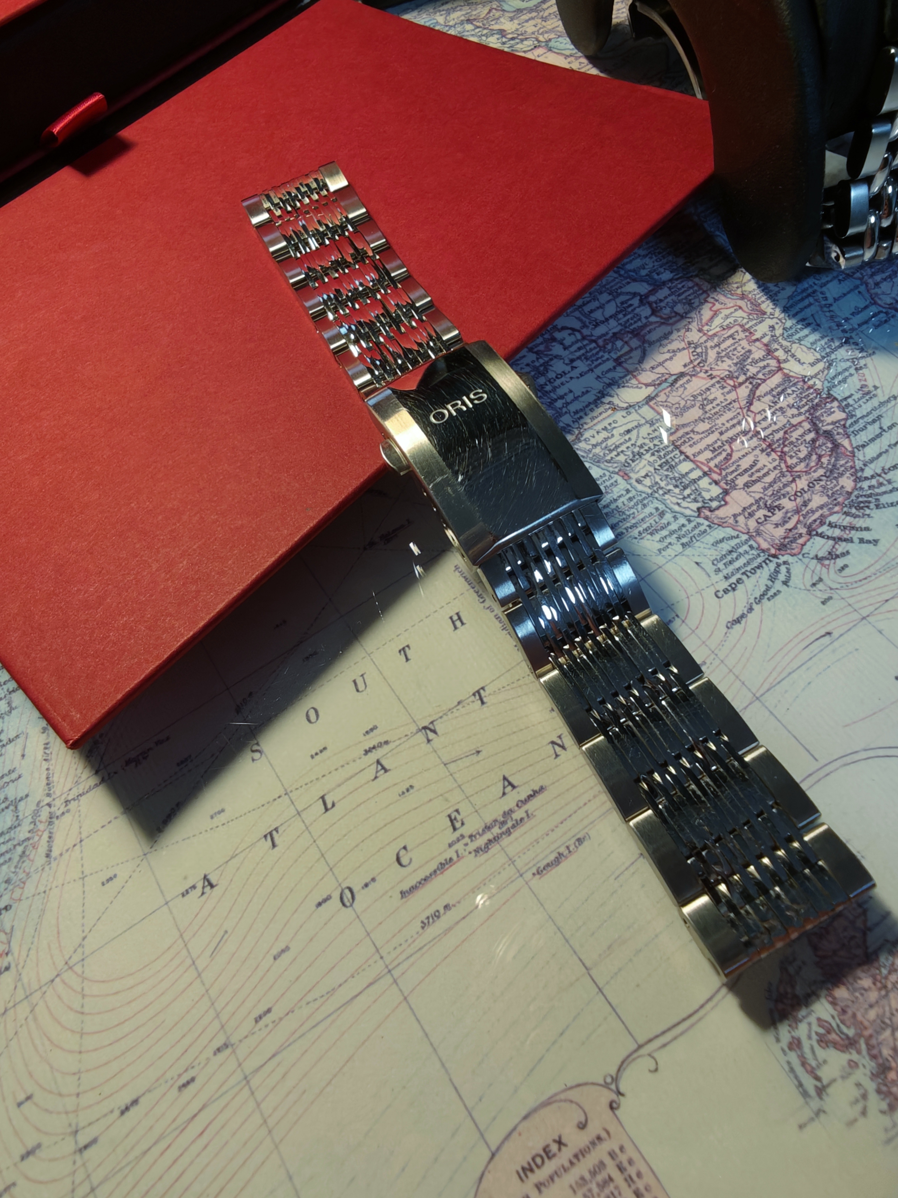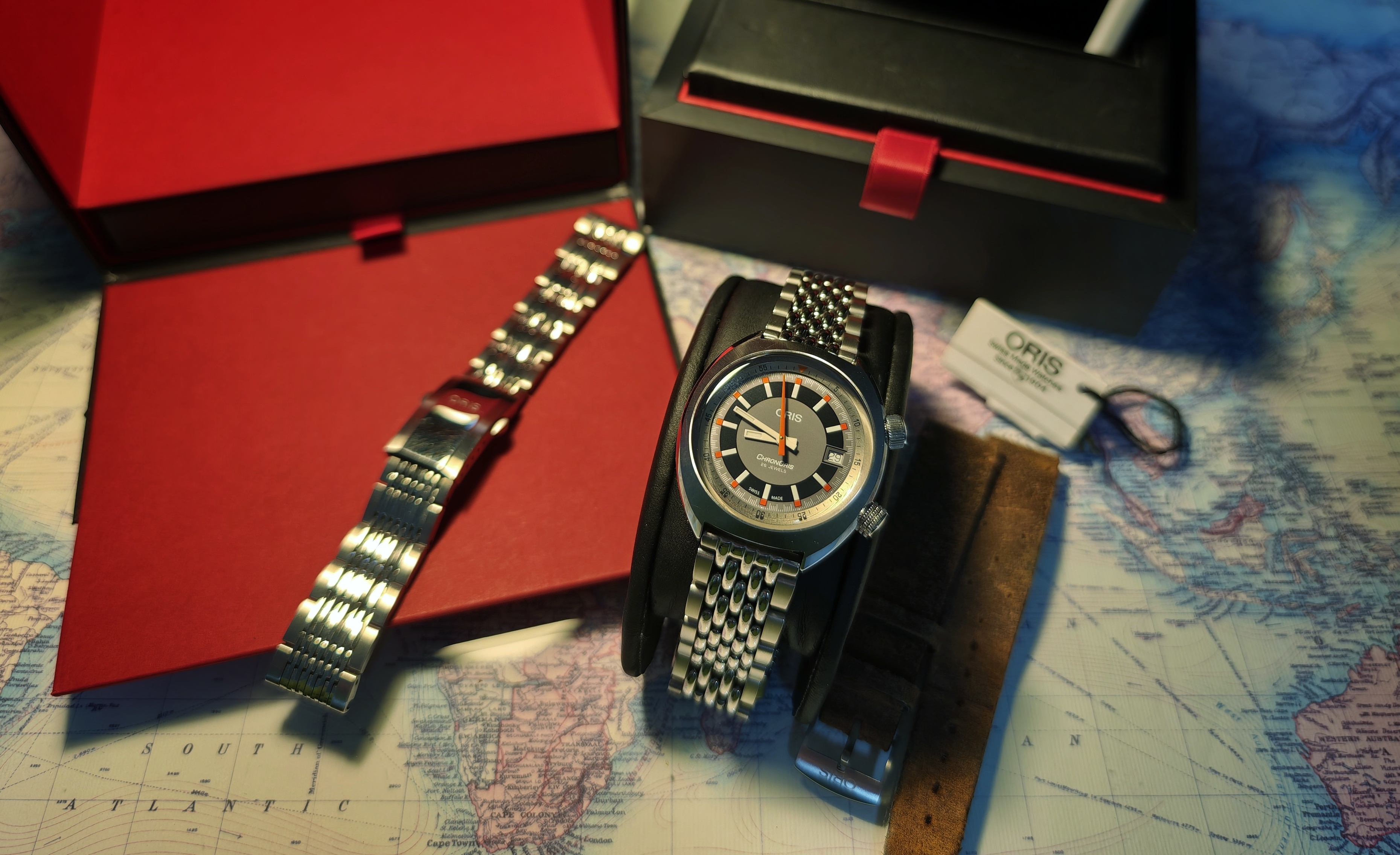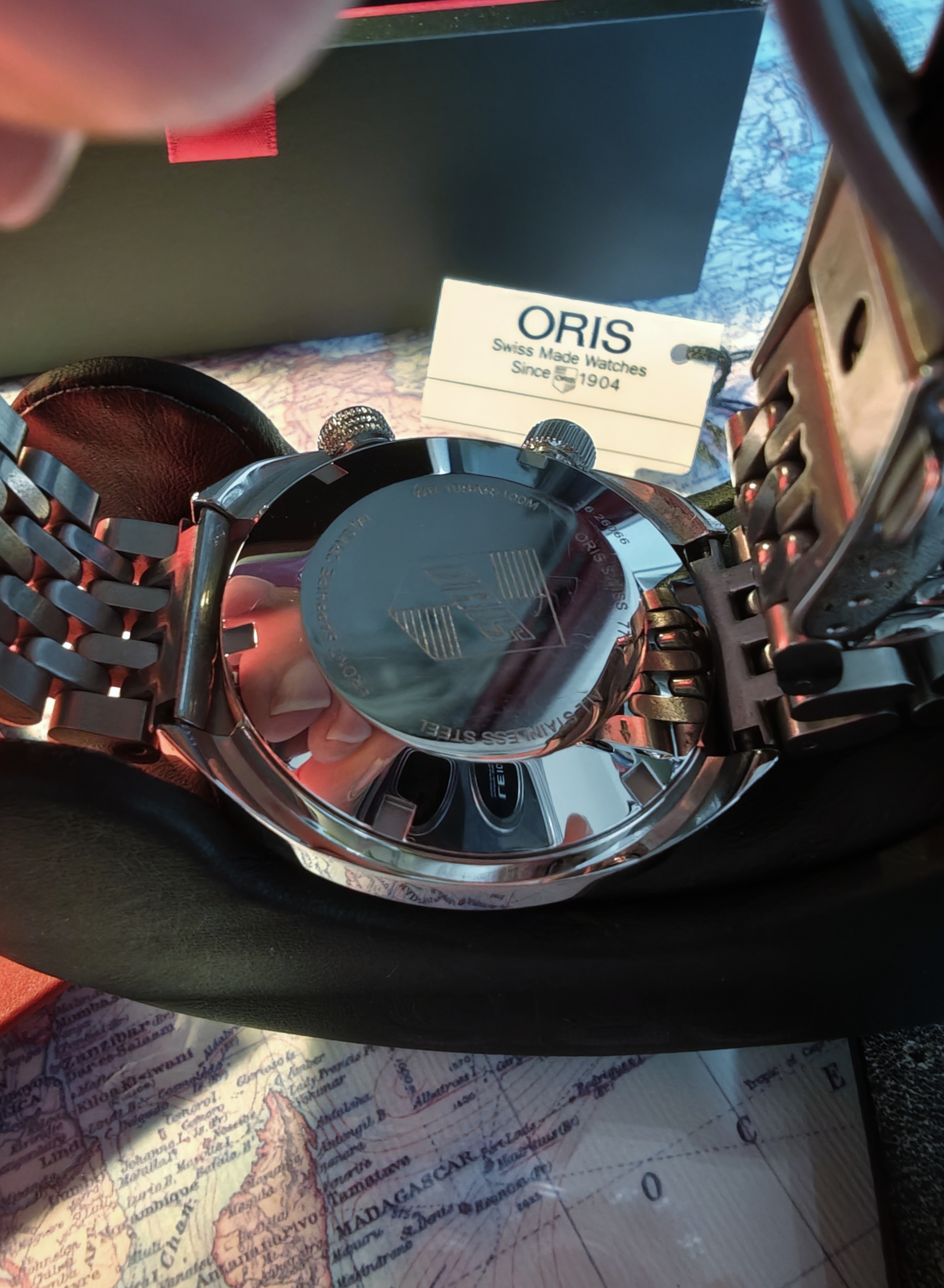 Saco mi Oris Chronoris tres agujas. El reloj es del año 2021. Un reloj poco visto con una calidad tremenda en cuanto a variedad de acabados, pulidos, cepillados en rayos de sol, cristal abombado estupendo por la nitidez y el anti reflejo, etc. Tiene muchos detalles. Un doble corona con diseño distinto para cada una.
