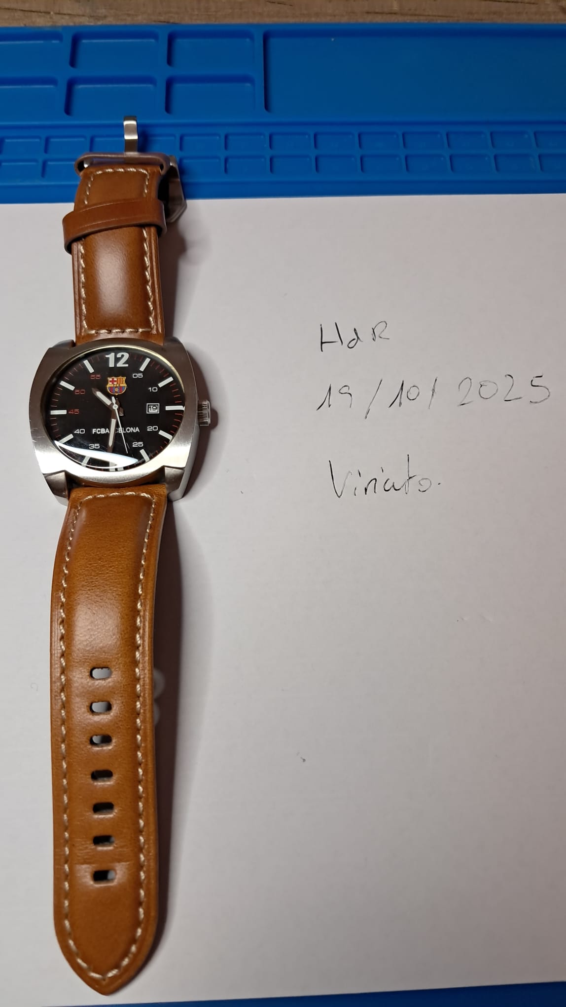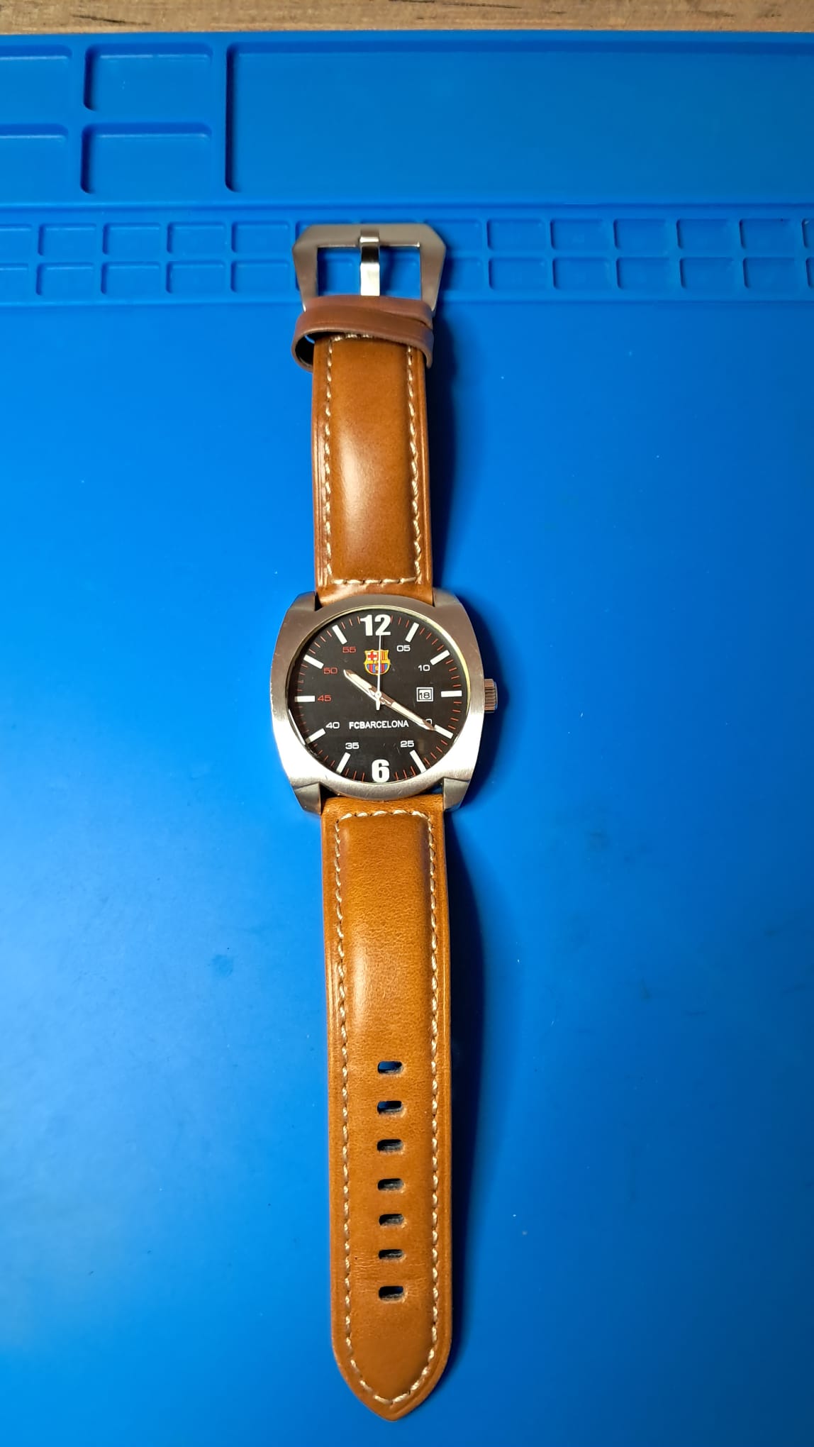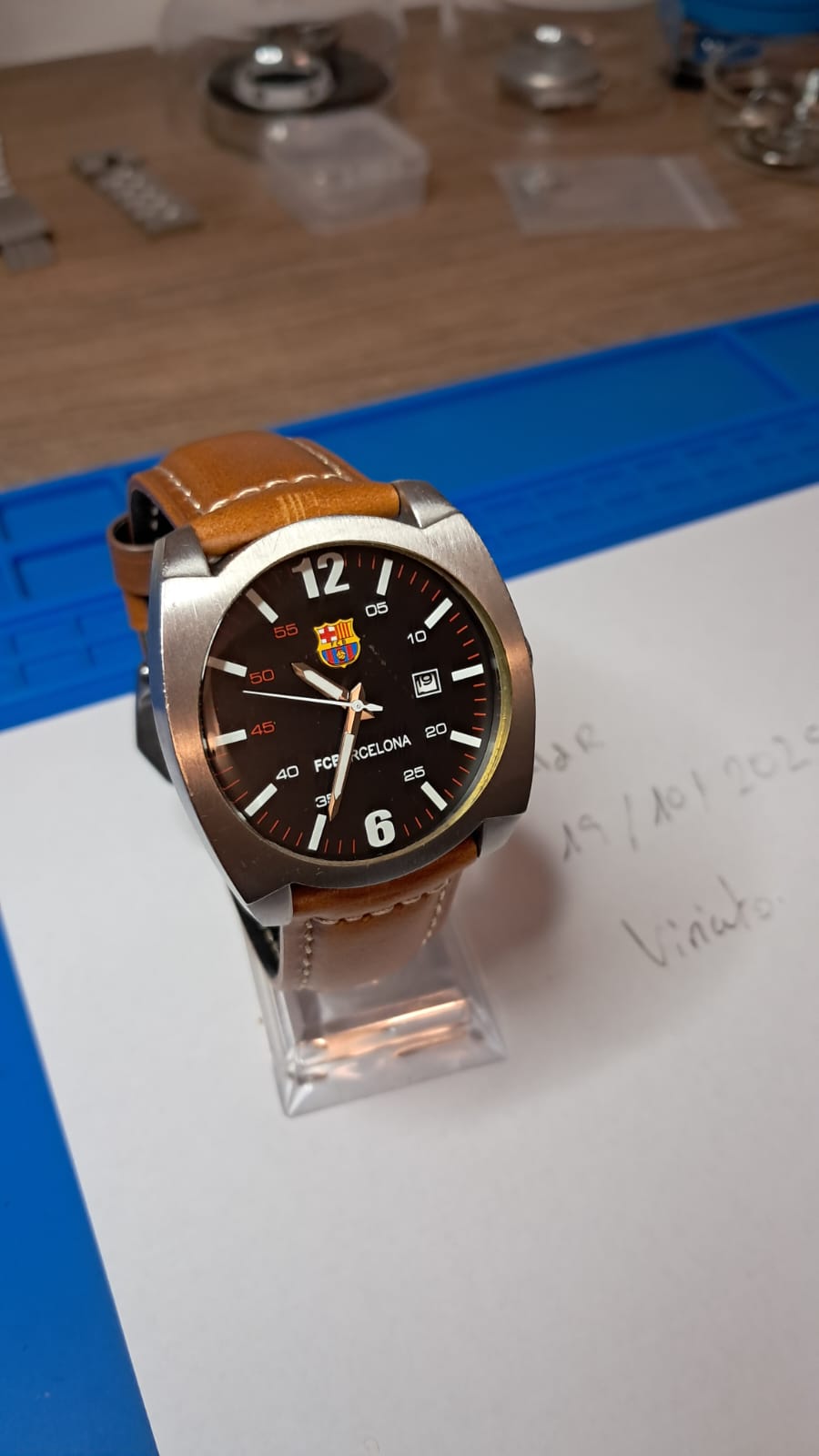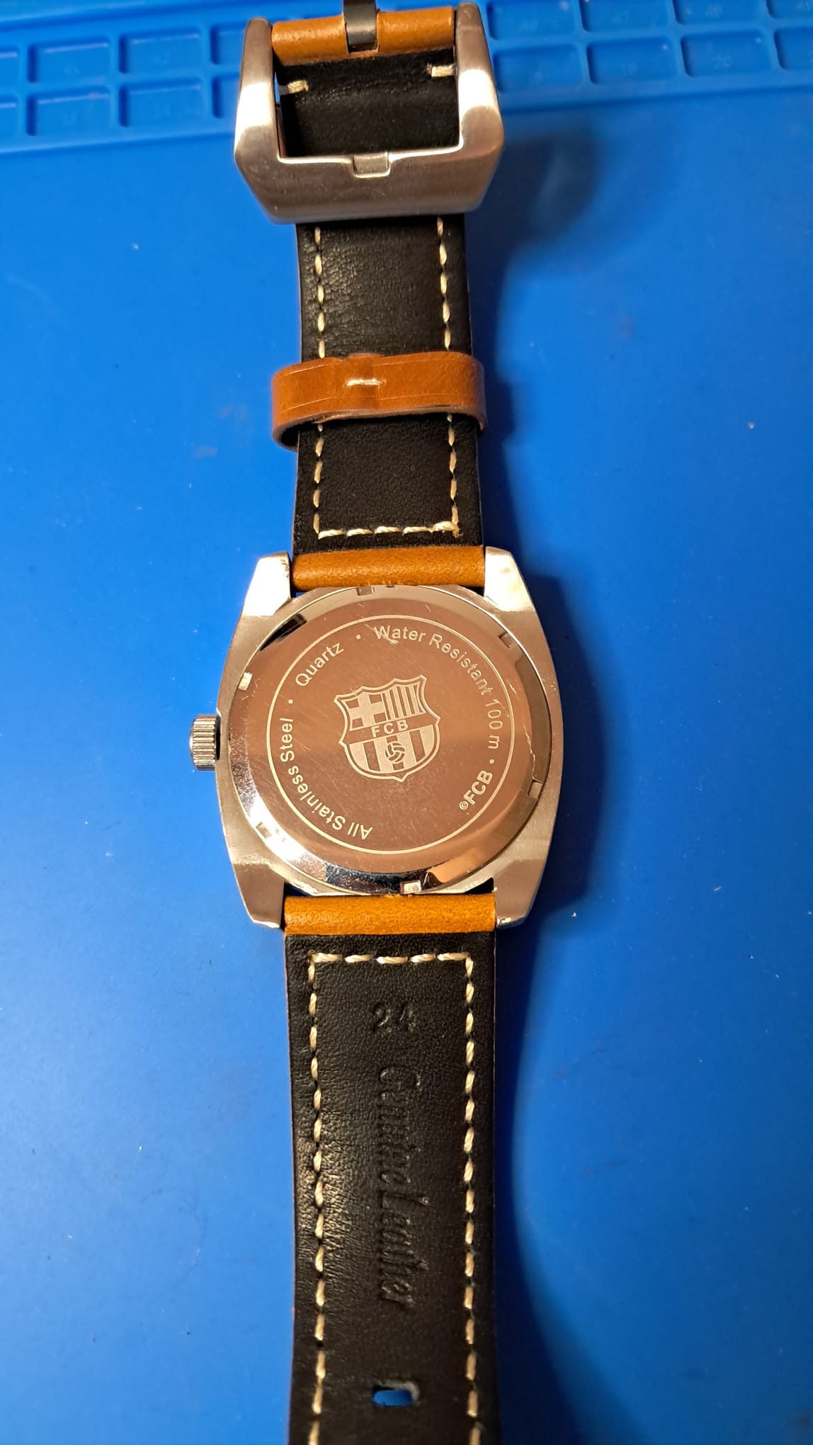 Reloj marca Calypso un con calibre de cuarzo Miyota y pila recién cambiada. Tiene la corona y la trasera firmadas con el escudo del Barça. 42mm. Correa de piel alomada nueva. Tiene una pequeña picada en el cristal muy poco apreciable a simple vista. Tiene lumen.
