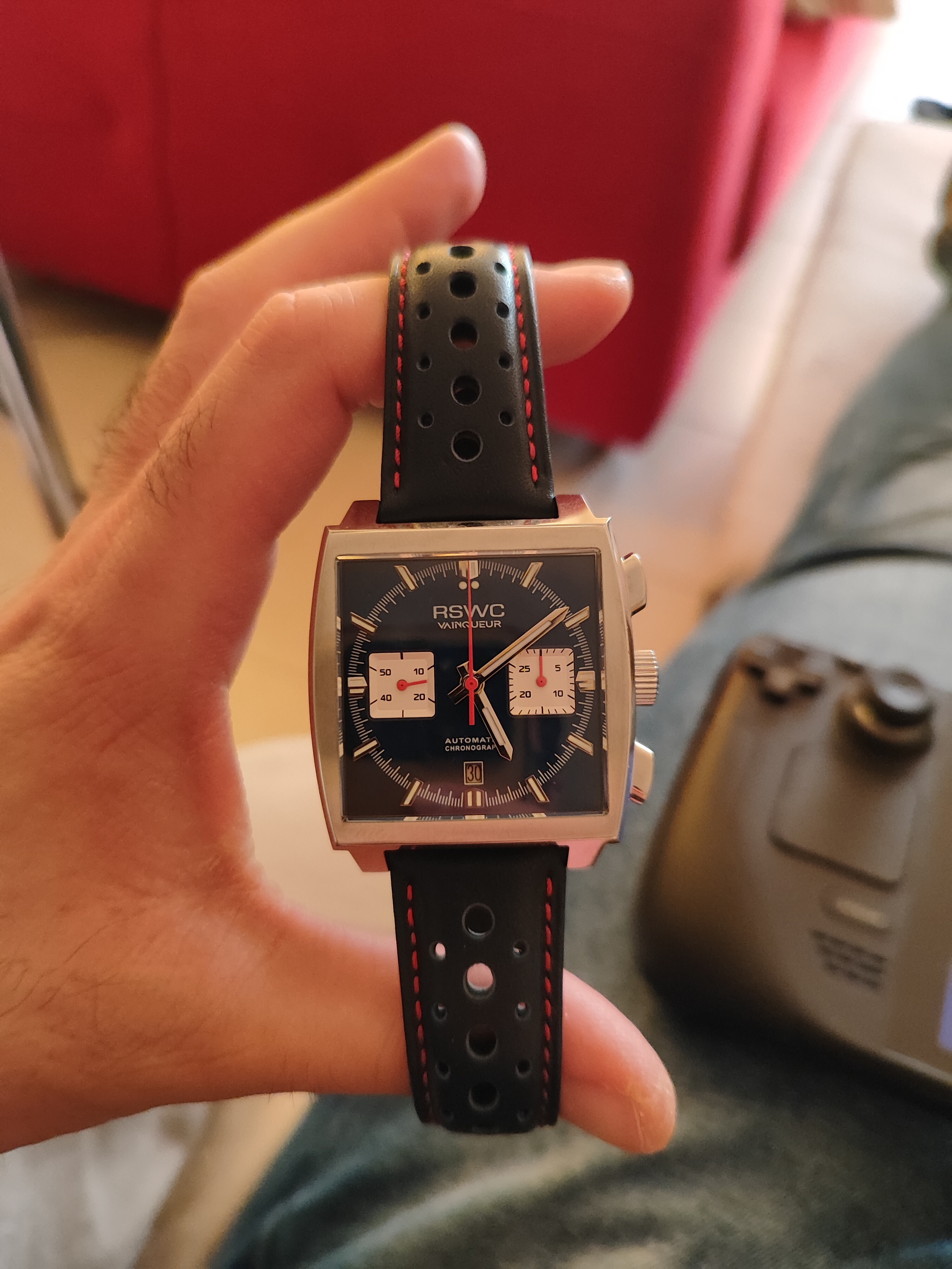 Vendo el conocido modelo RSWC Vainqueur azul en un estado de total reestreno. Ningún pelo apreciable. El funcionamiento del crono es excelente y resetea perfectamente. Muy bien ajustado el movimiento y su precisión. Anda sobre unos +5” al día. Lo entrego con su dotación completa sin uso (ambas correas) y regalo correa racing azul con pespuntes rojos y cierre deployante muy cómoda.