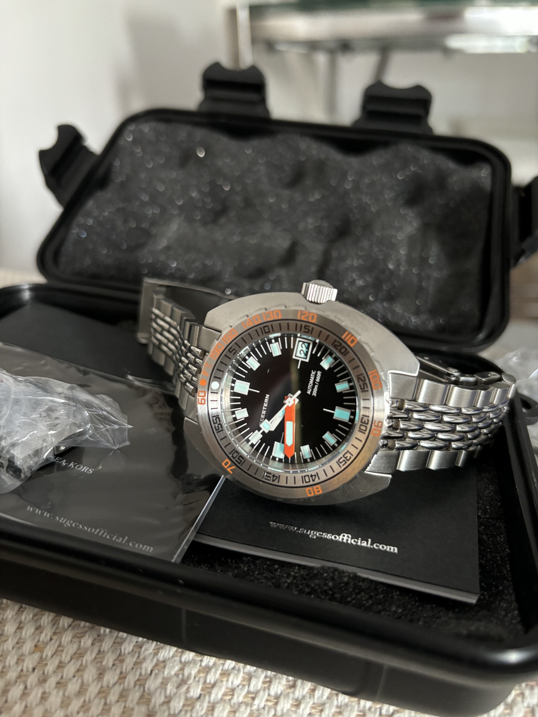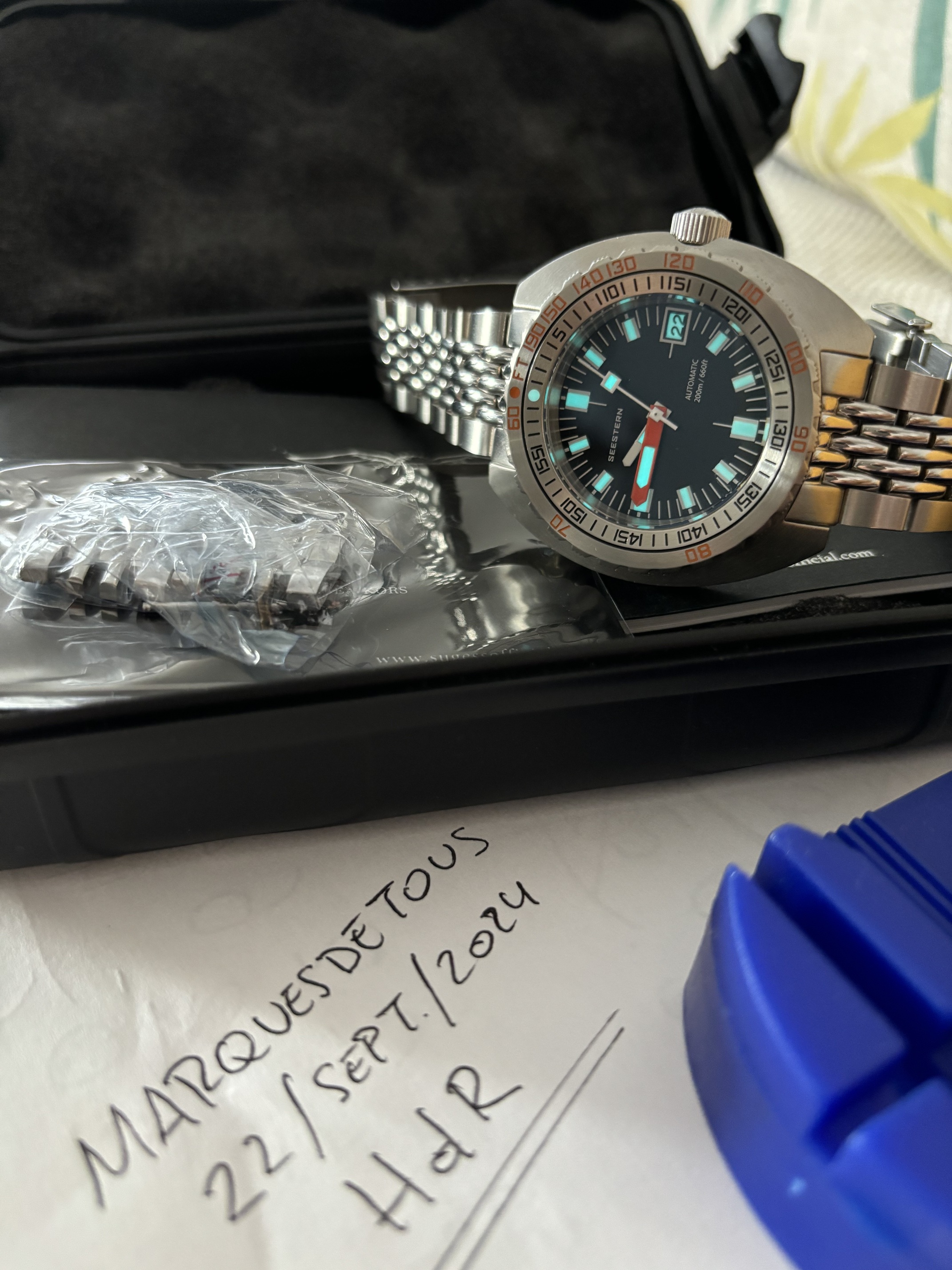 Se envía con toda la dotación con la que lo recibí: caja tipo pelican para un reloj, manual, tarjeta de garantía y herramientas para el ajuste y cambio del armis.