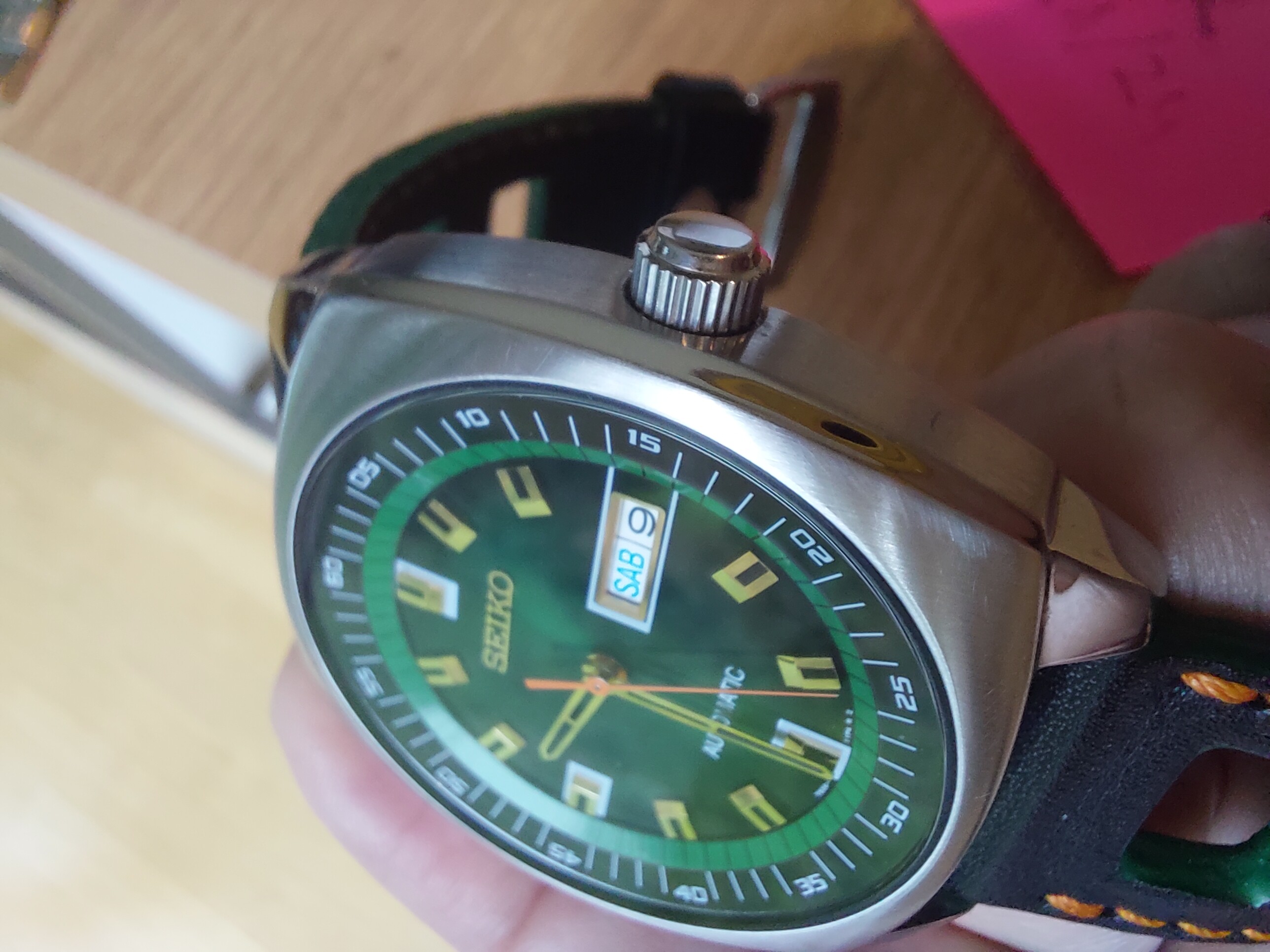 Por lo demás, el reloj es precioso, y el dial tiene un verde que al sol hace un efecto radial muy chulo.