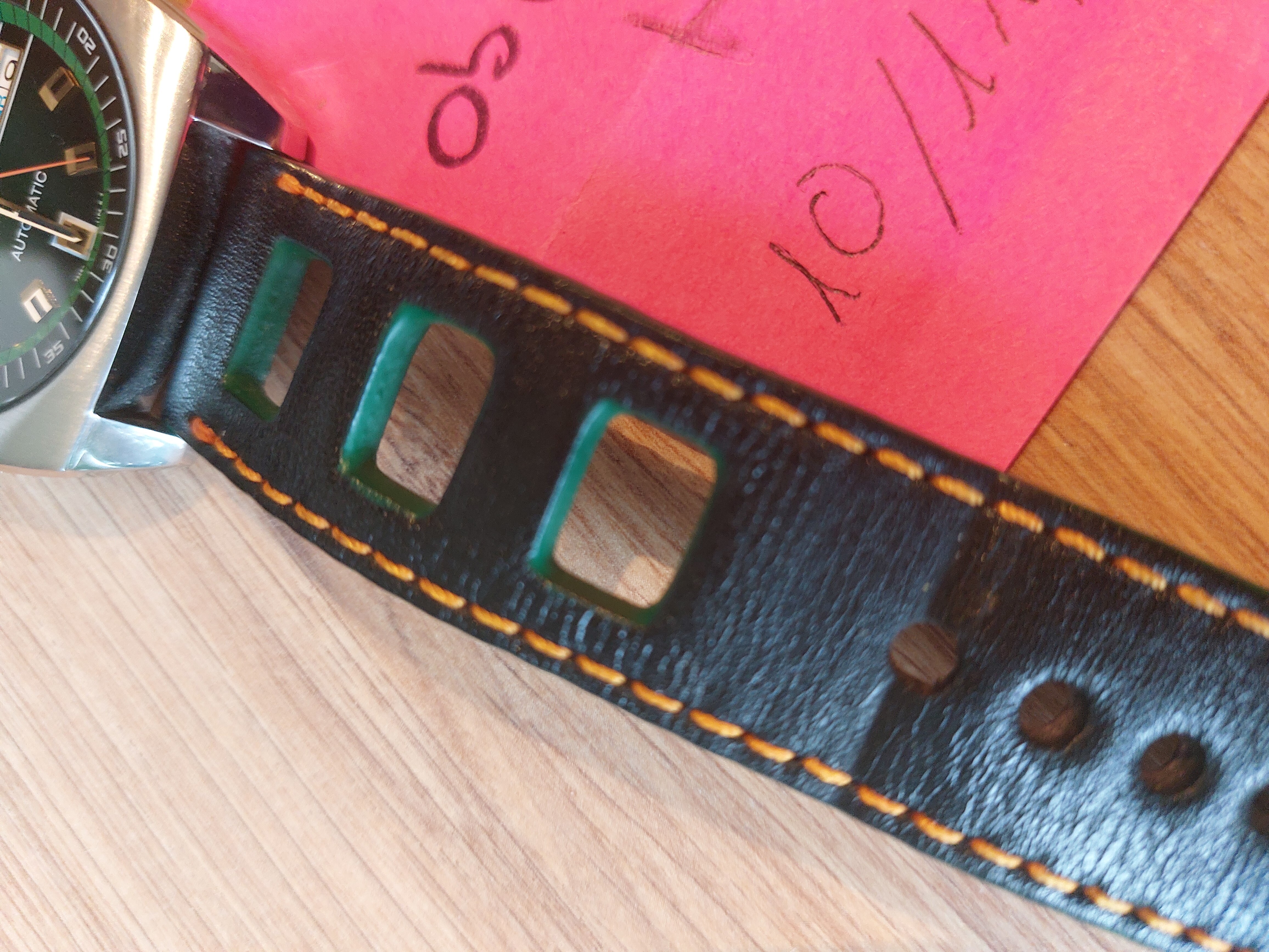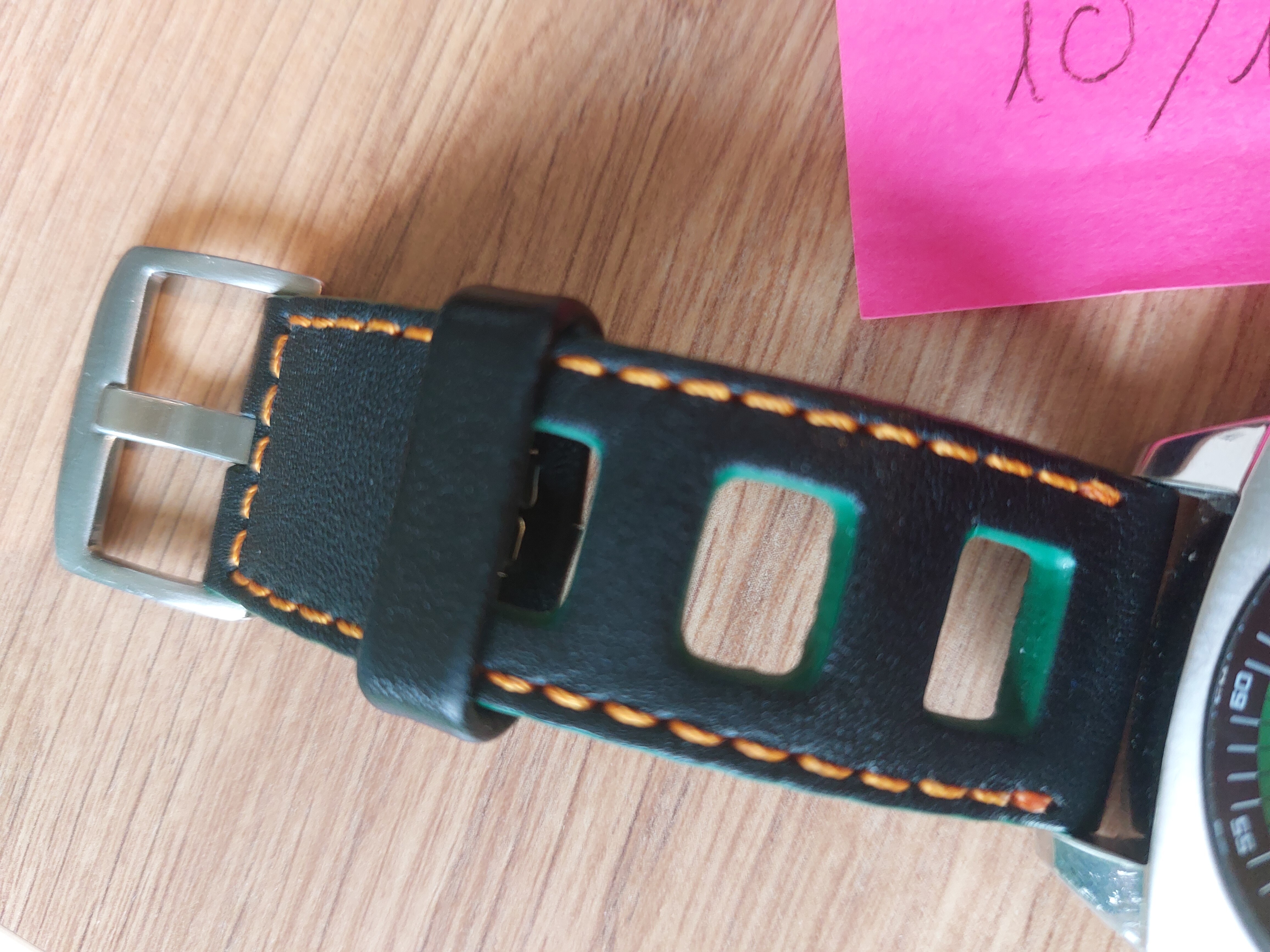 La venta incluye la correa de cuero de Pattini, especialmente diseñada para este modelo, con cuero natural, hilo naranja y bordes verdes.