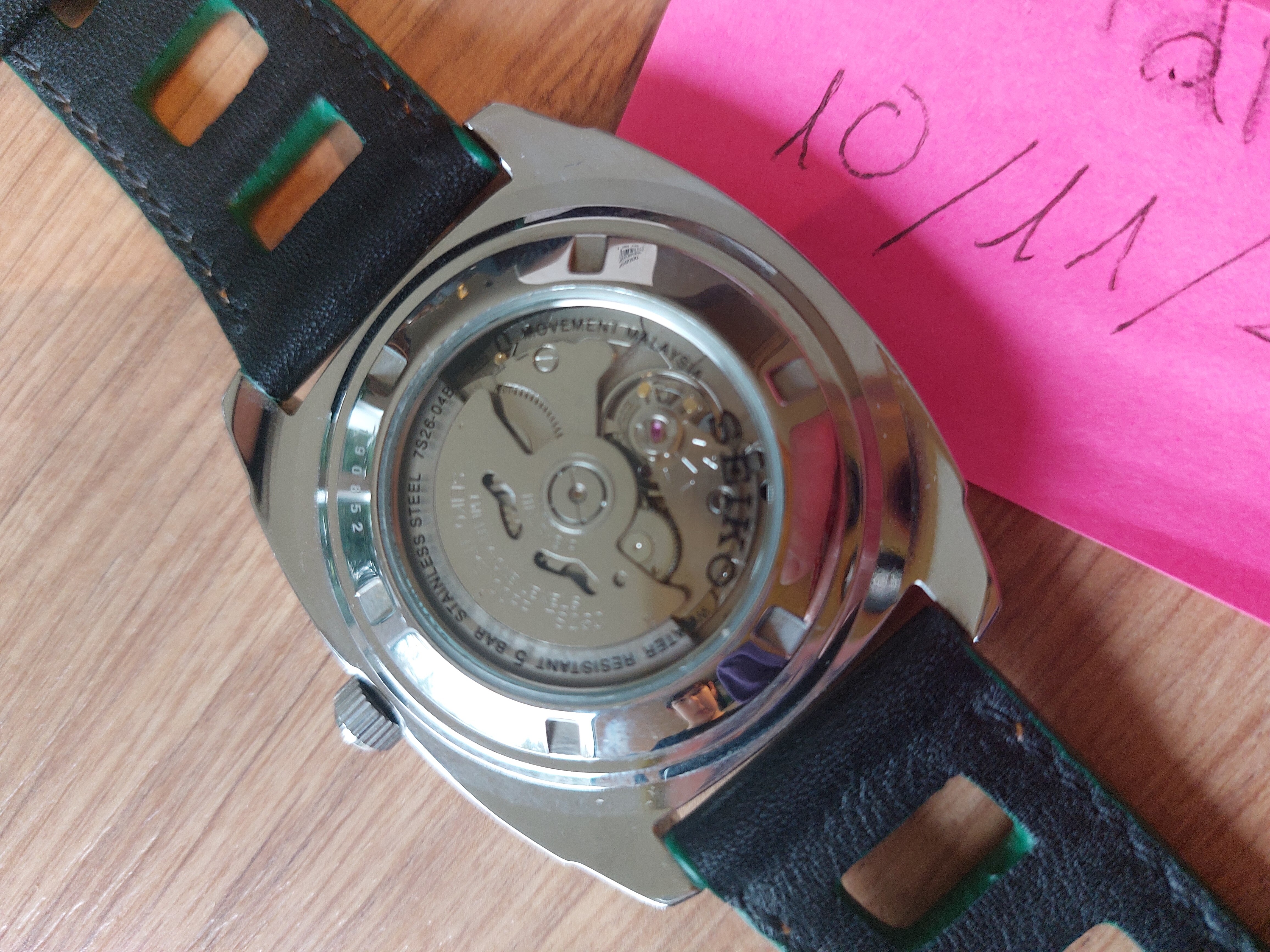 El movimiento es un 7S26C que, para ser claro, no es el más fino que he tenido. No sé exactamente cuál es la marcha que tiene, pero no es especialmente exacto (roto a diario, por lo que no me preocupa demasiado), la reserva que mantiene no llega a las 41h que indica Seiko, se para bastante antes, una vez lo dejas de usar.