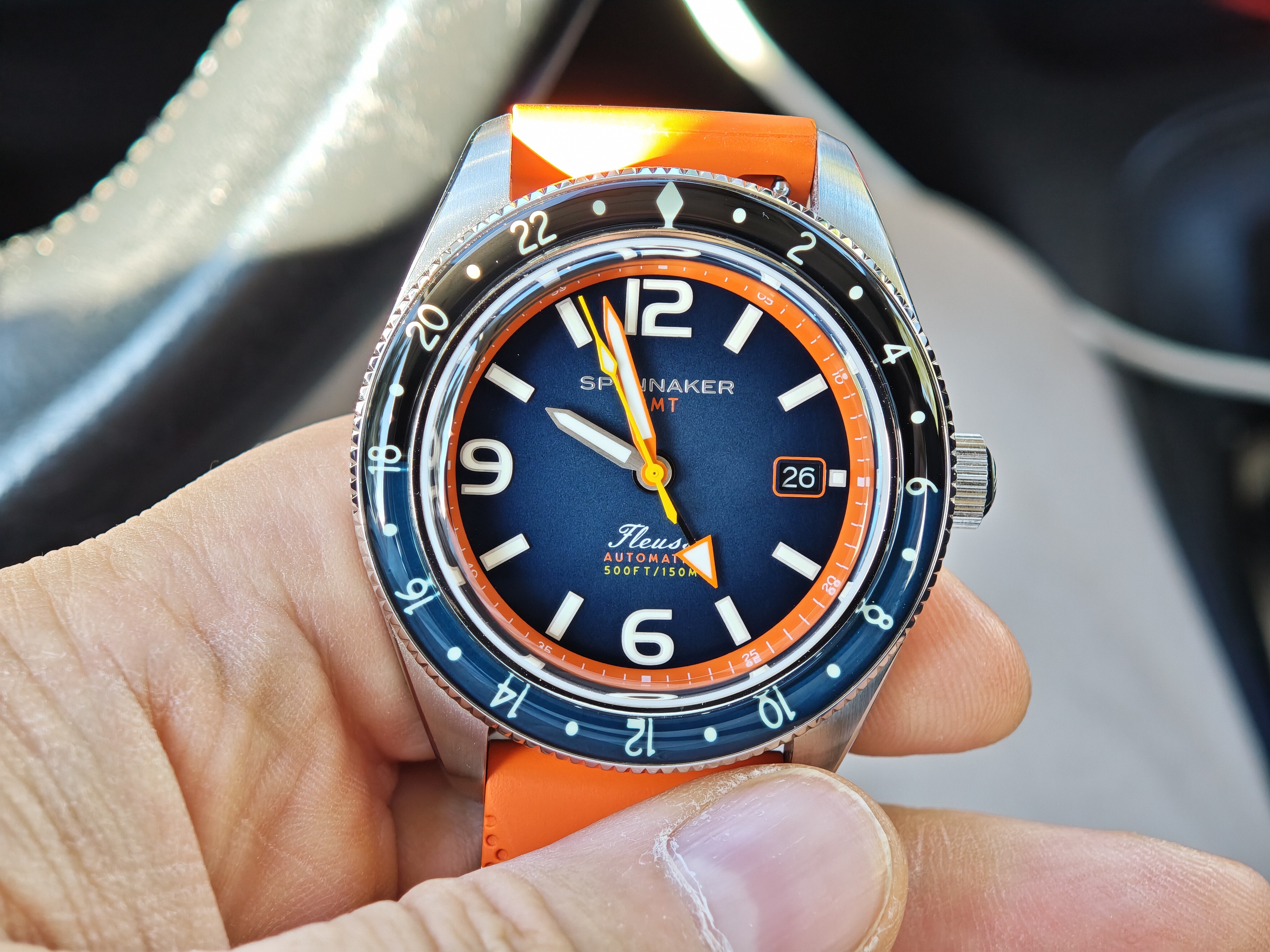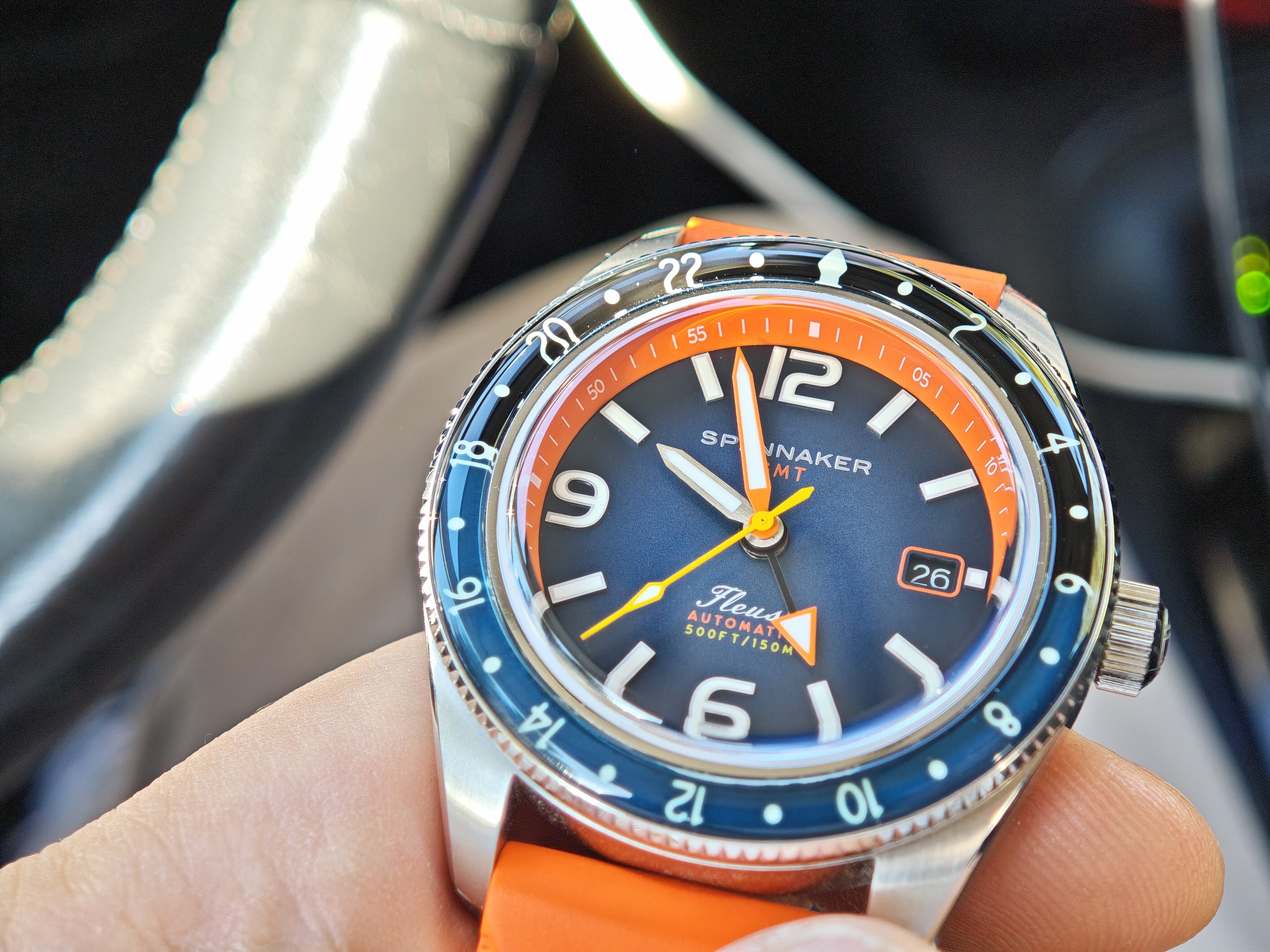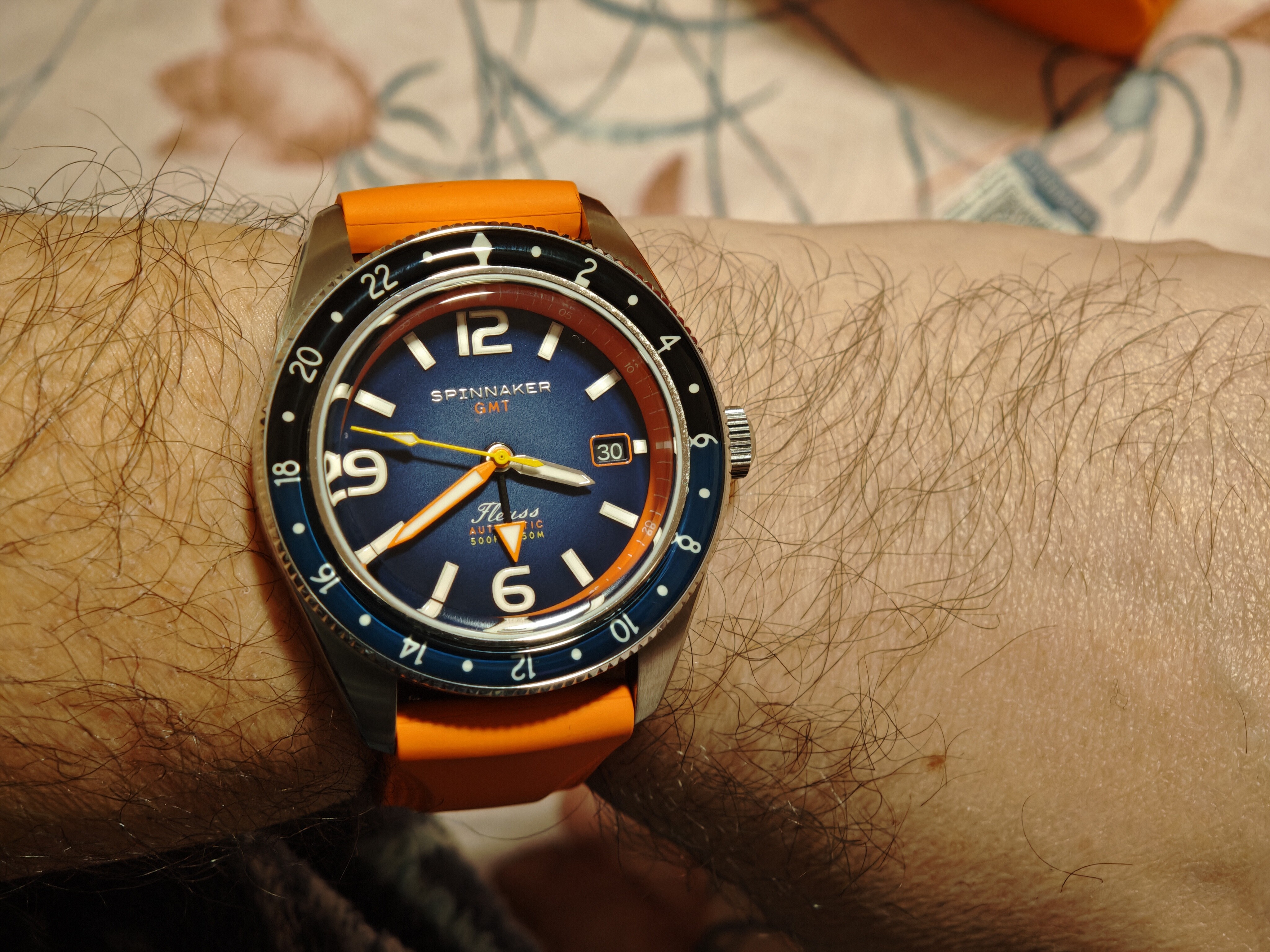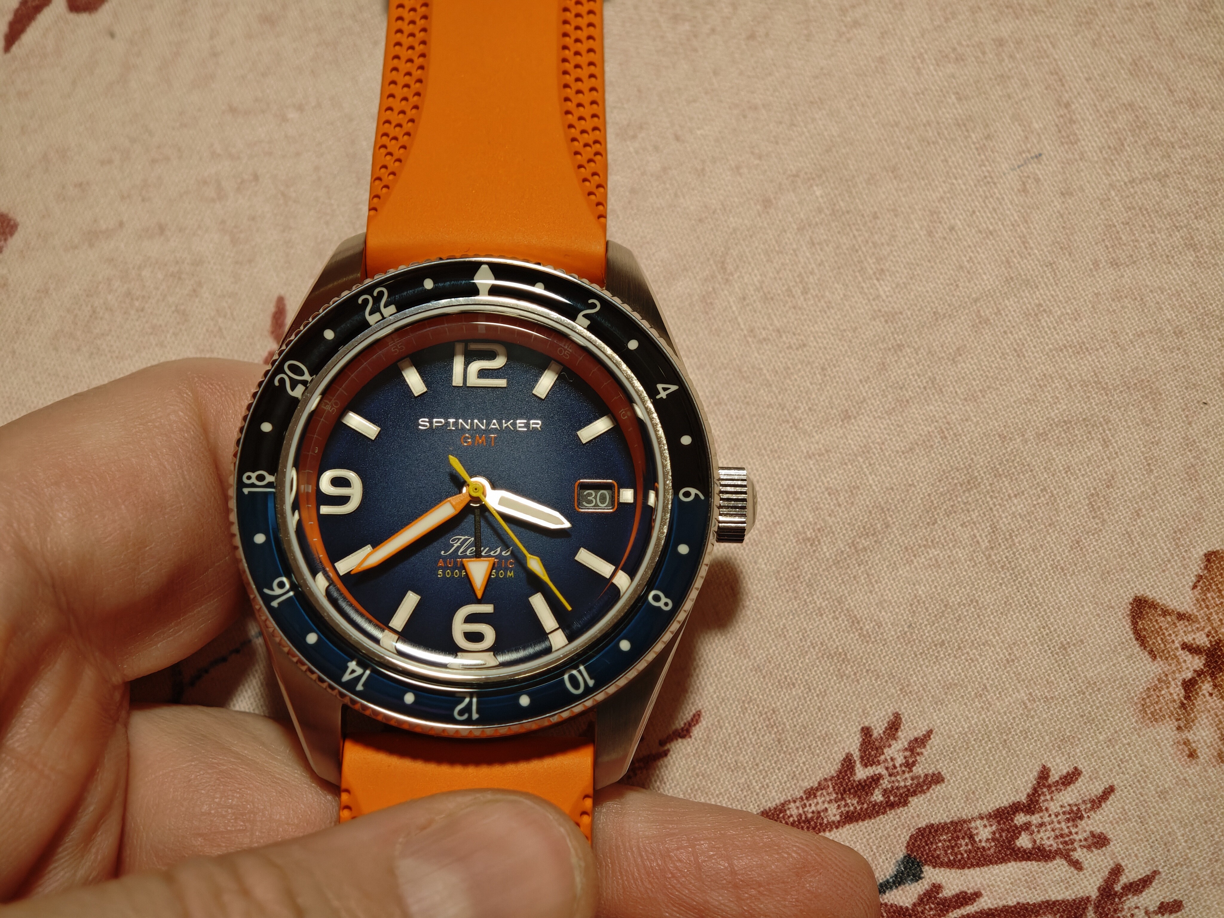 Spinnaker Fleuss GMT: Set con armis a estrenar y correa naranja/azul con 5 puestas contadas. Sistema de cambio rápido tanto en correa como en armis (una gozada). Movimiento Seiko GMT. Cuenta con cristal de Zafiro y una pasada de lumen, tanto en intensidad como en duración, a la altura de los divers Seiko. Lumen en agujas, índices y bisel. Comprado en septiembre.