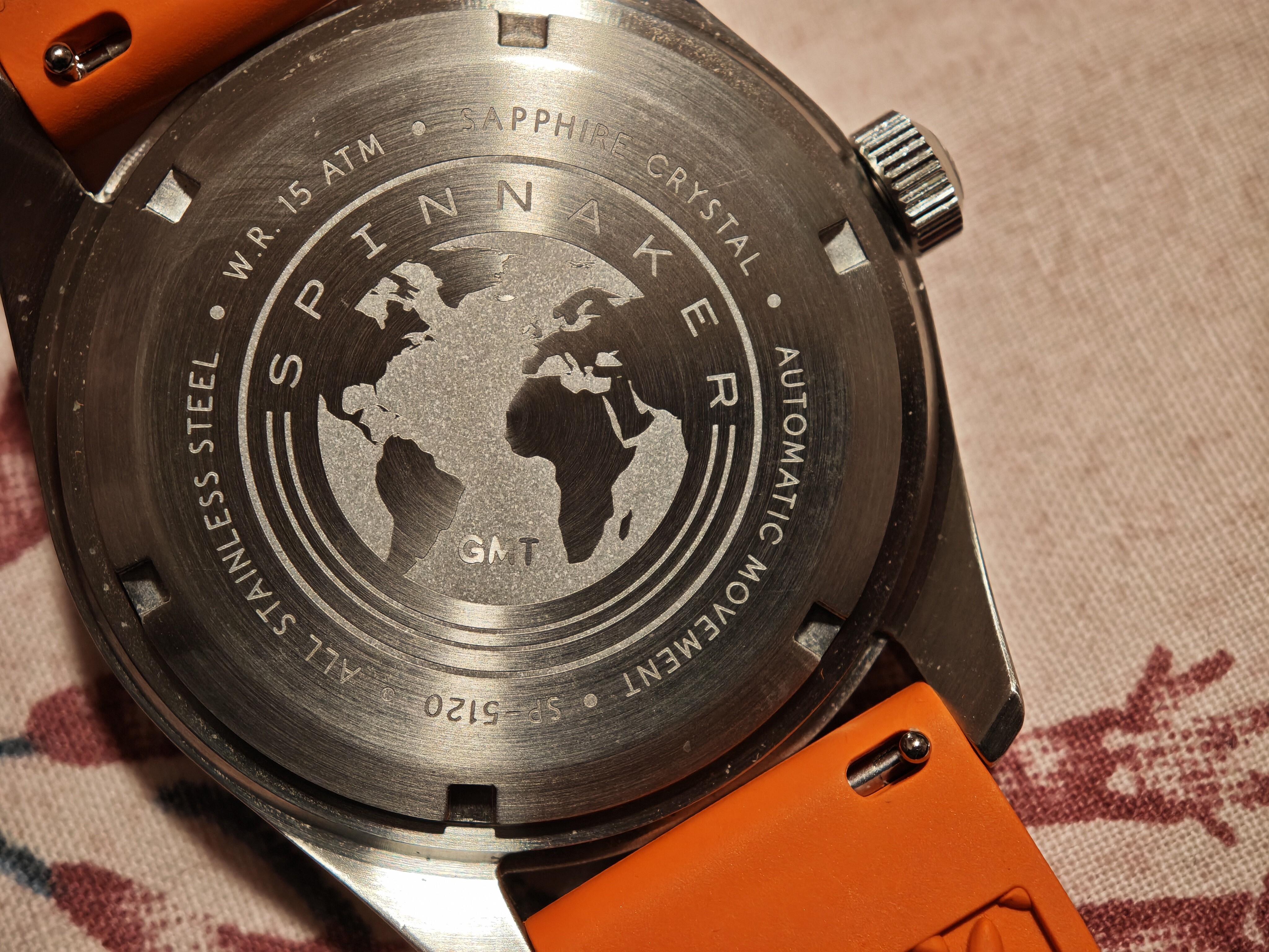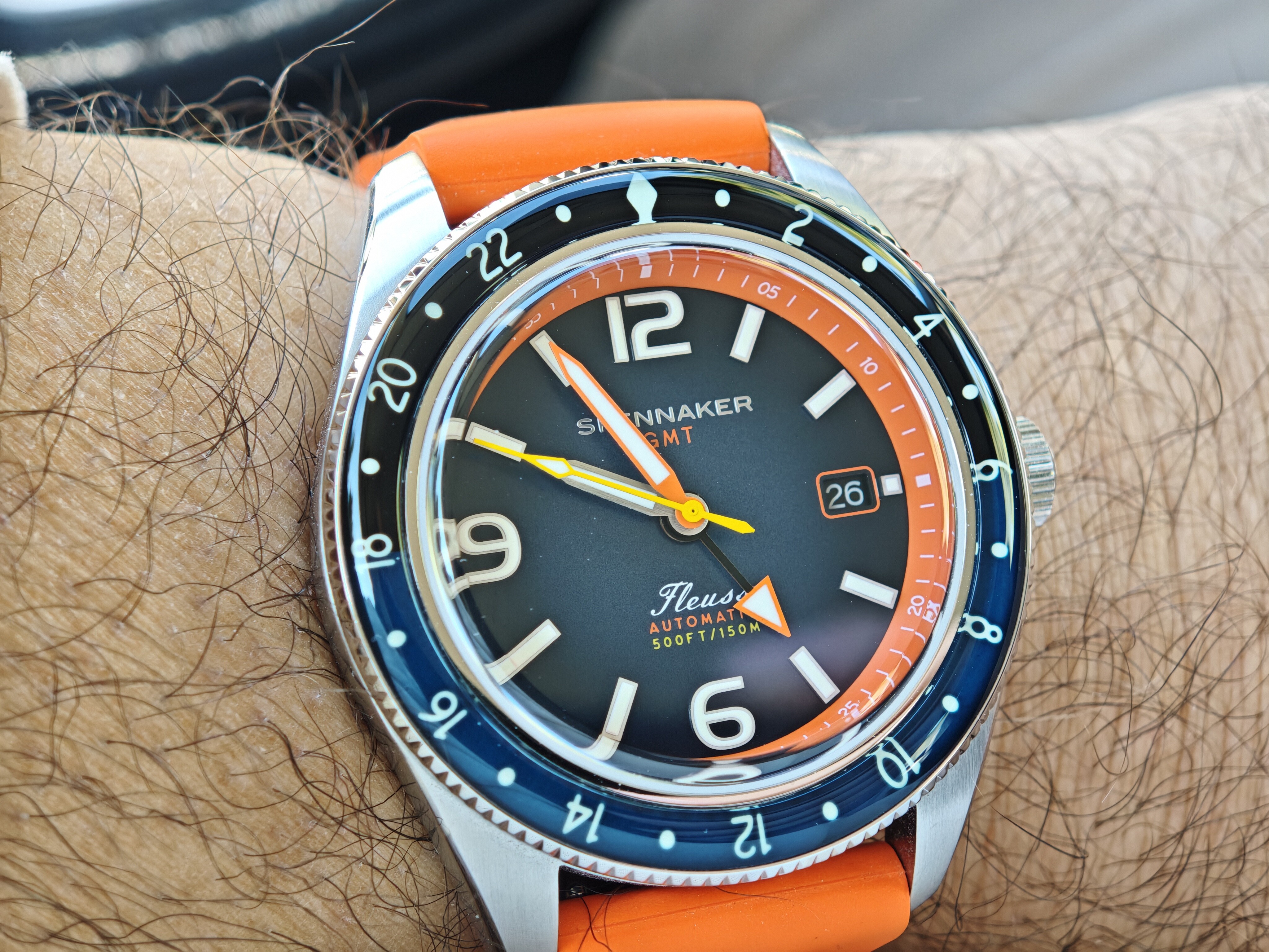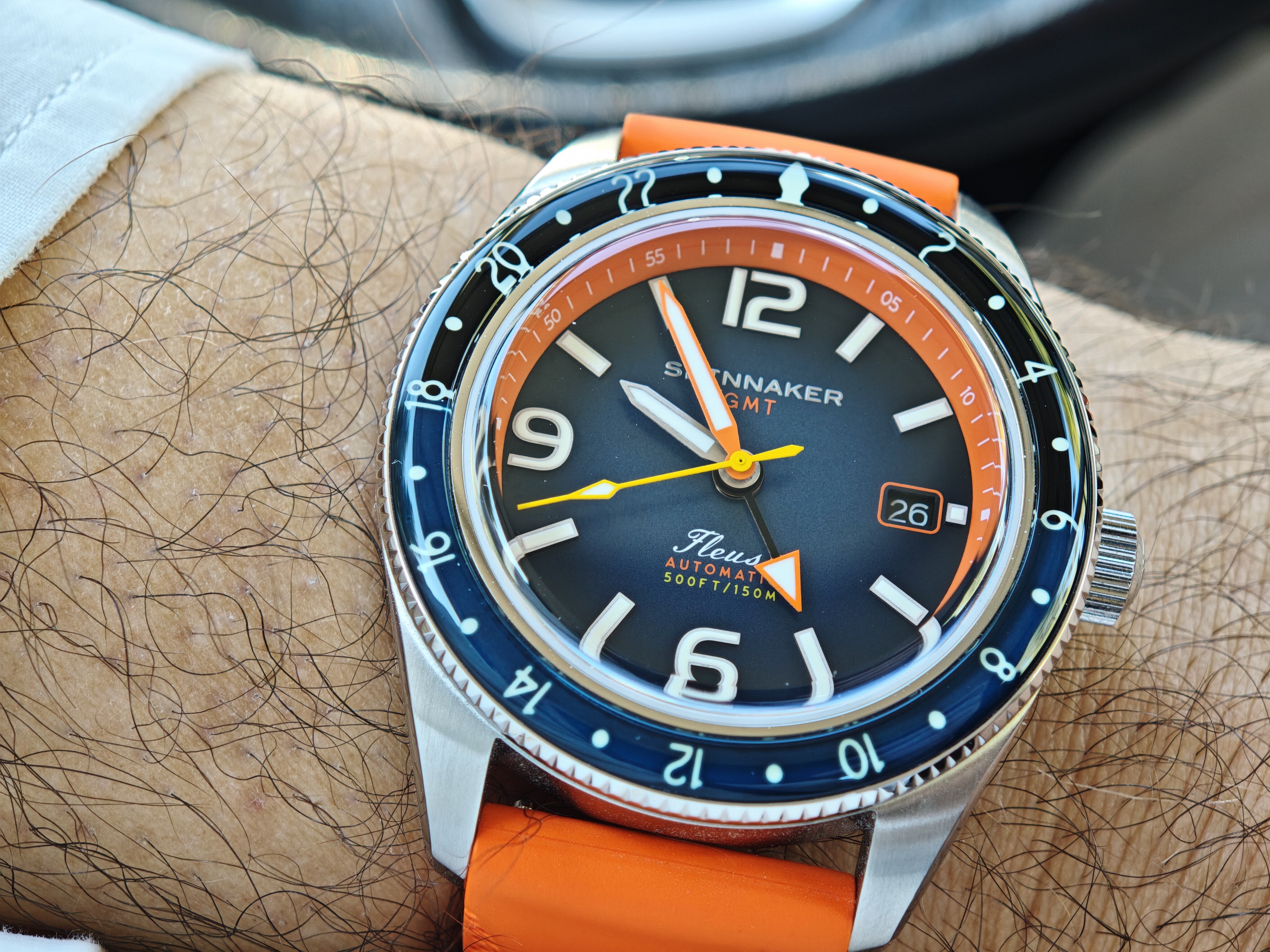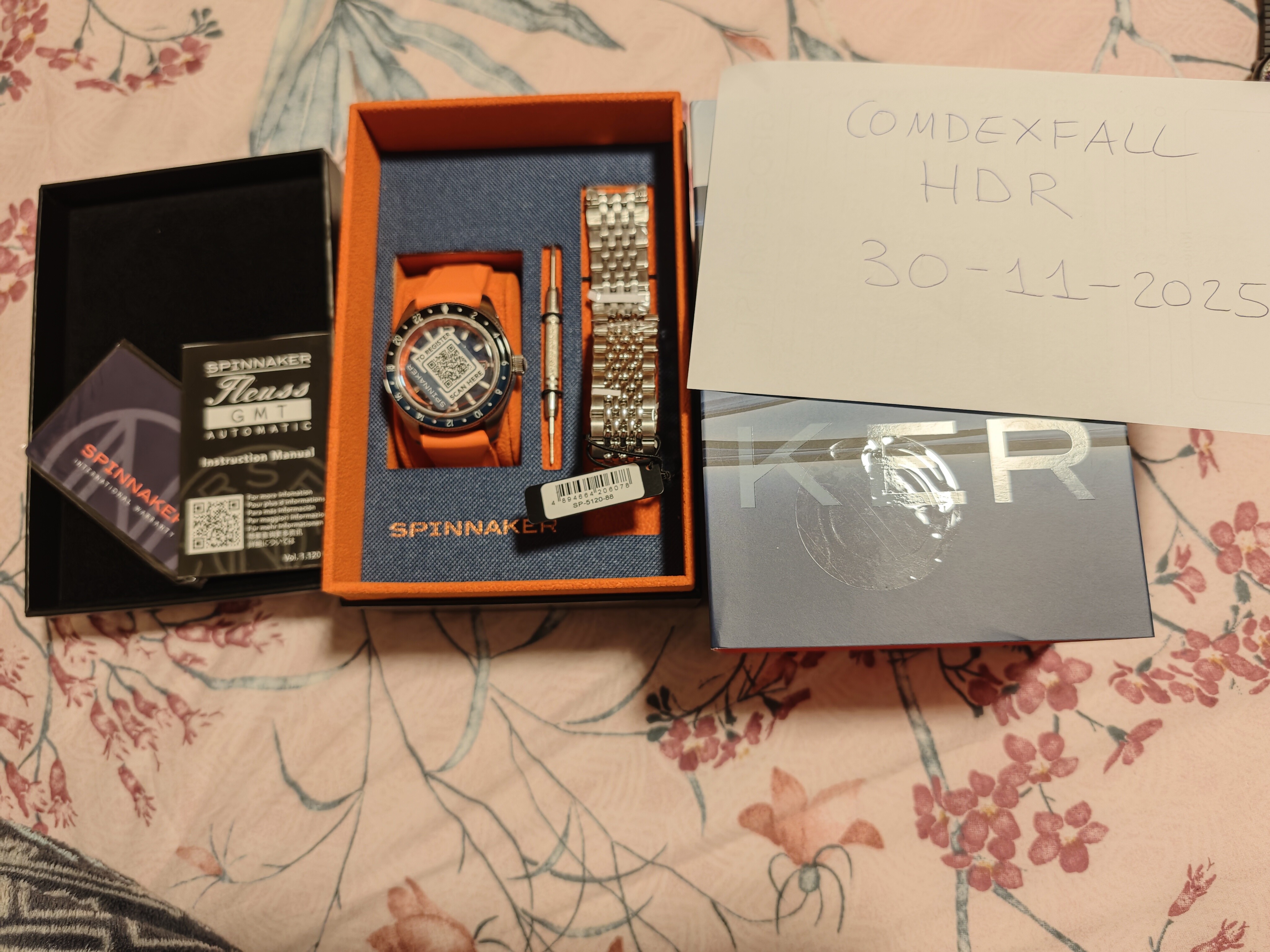 Spinnaker Fleuss GMT: Set con armis a estrenar y correa naranja/azul con 5 puestas contadas. Sistema de cambio rápido tanto en correa como en armis (una gozada). Movimiento Seiko GMT. Cuenta con cristal de Zafiro y una pasada de lumen, tanto en intensidad como en duración, a la altura de los divers Seiko. Lumen en agujas, índices y bisel. Comprado en septiembre.