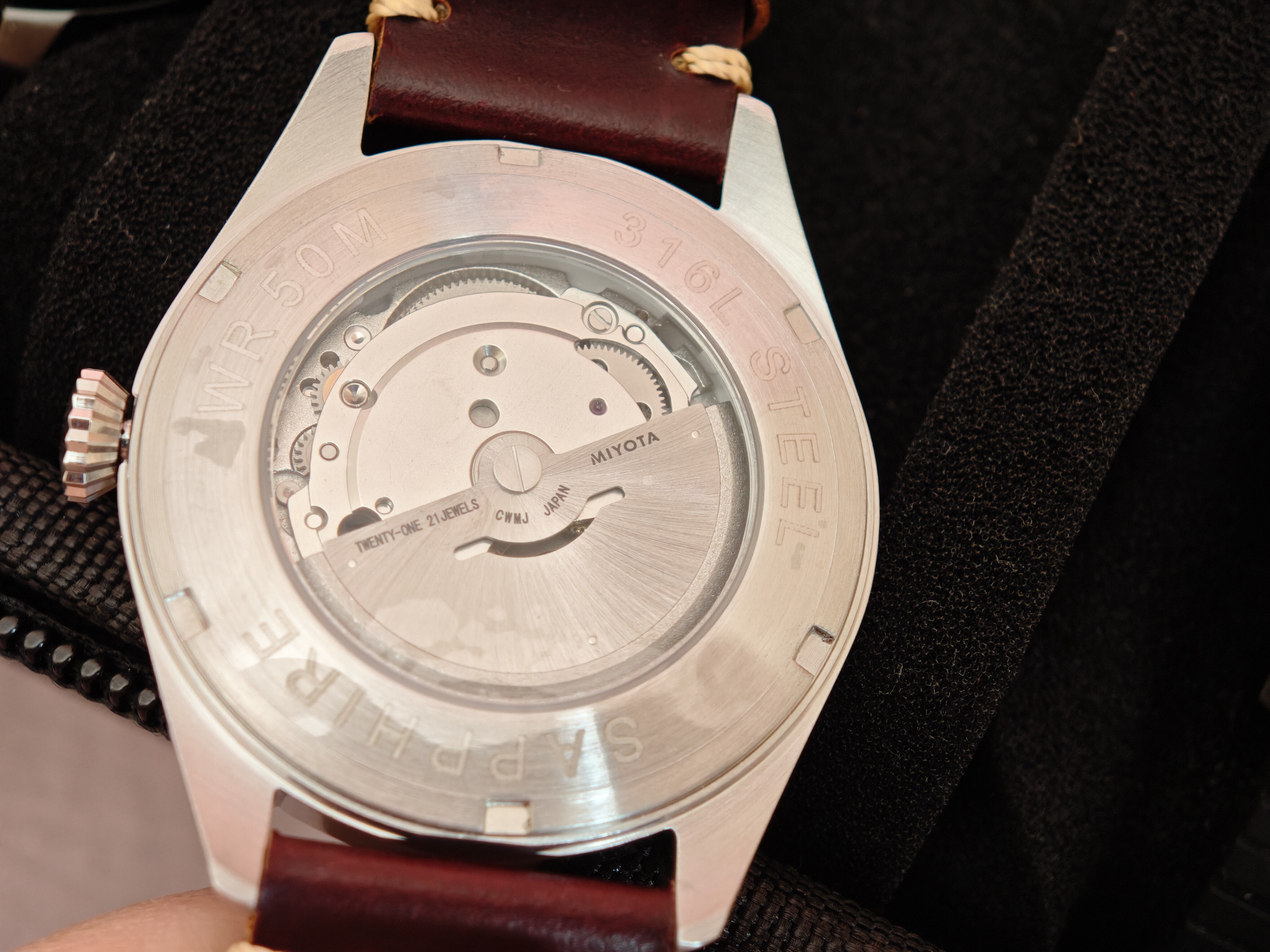 Un increíble reloj con mecanismo automático Miyota y cristal de zafiro (comprobado con Diamond Selector). Me acaba de llegar y, si no fuera porque necesito cash, no lo vendía. 42 mm de diámetro. No tengo foto de la caja, pero la incluyo.