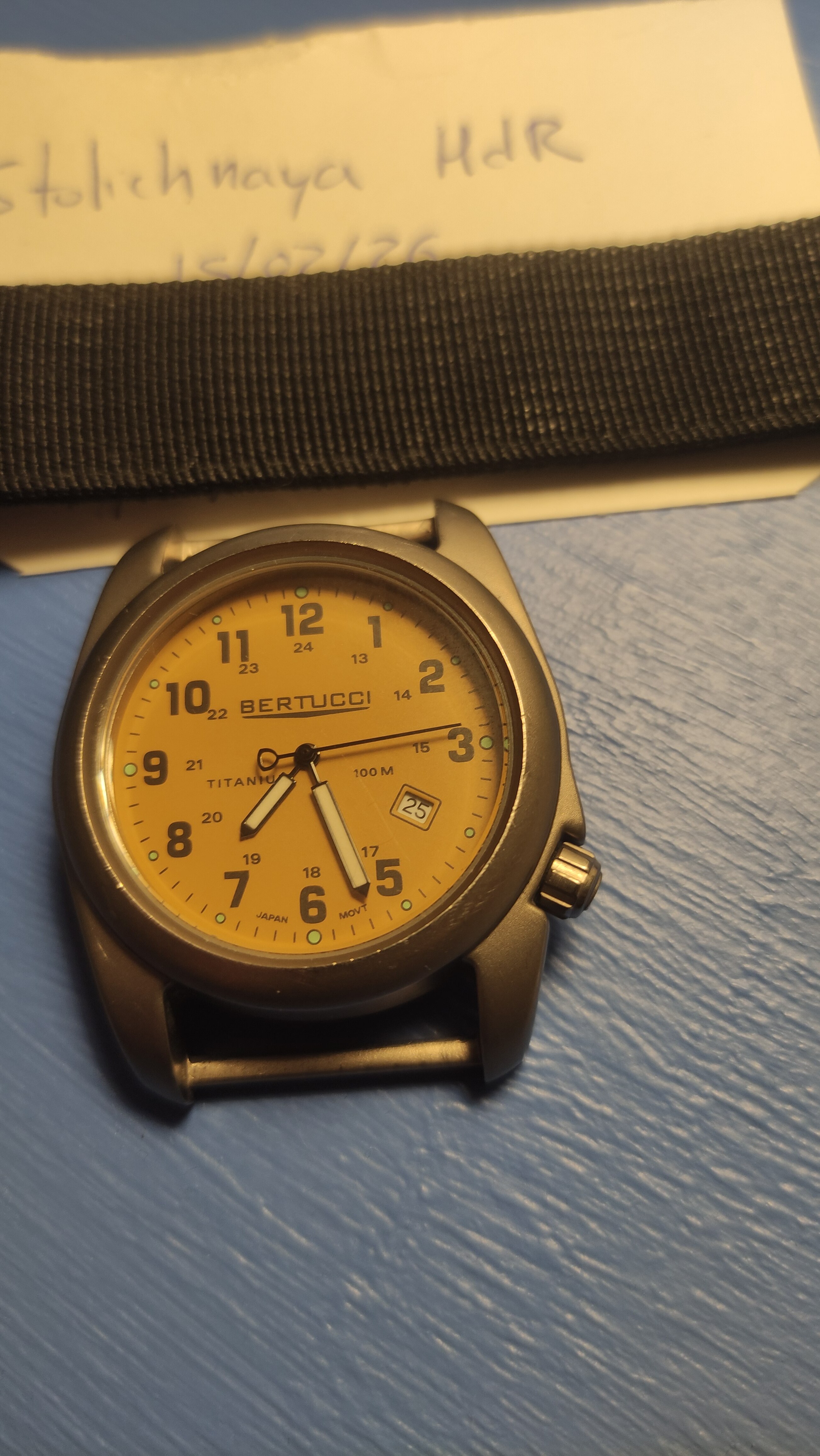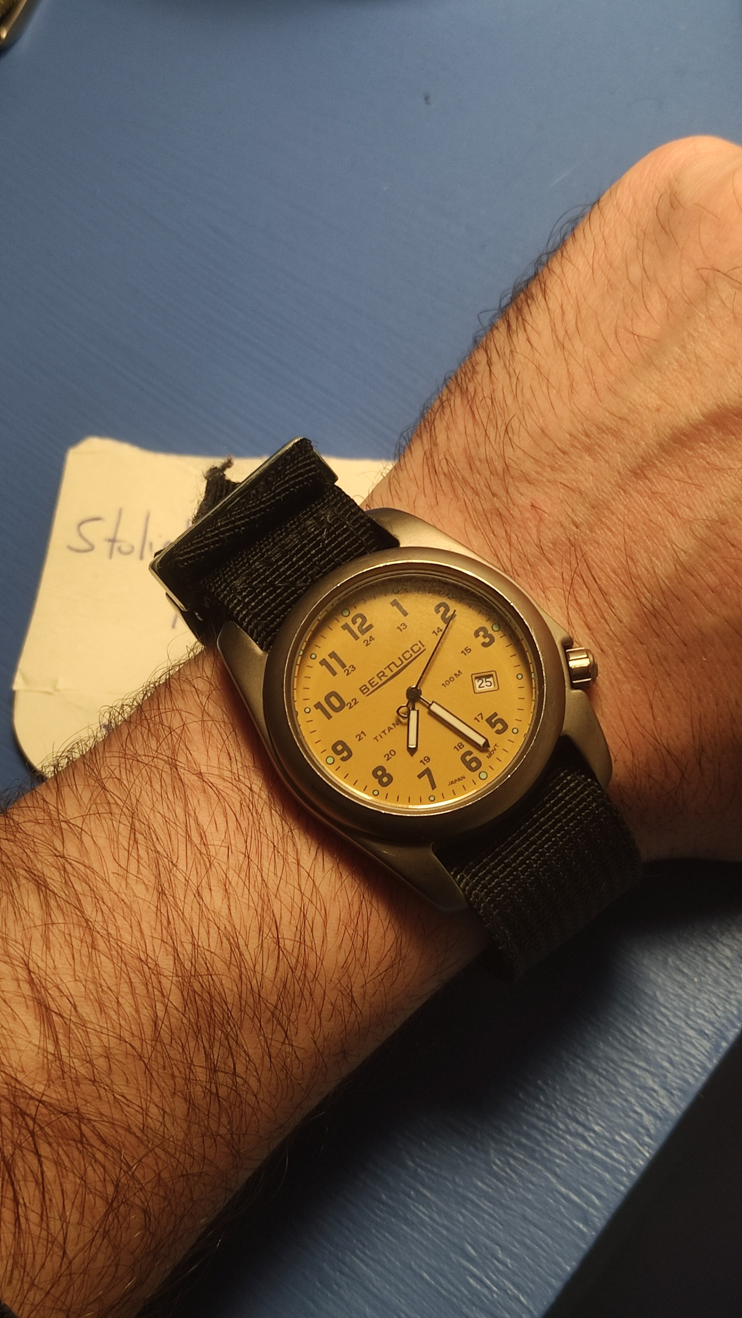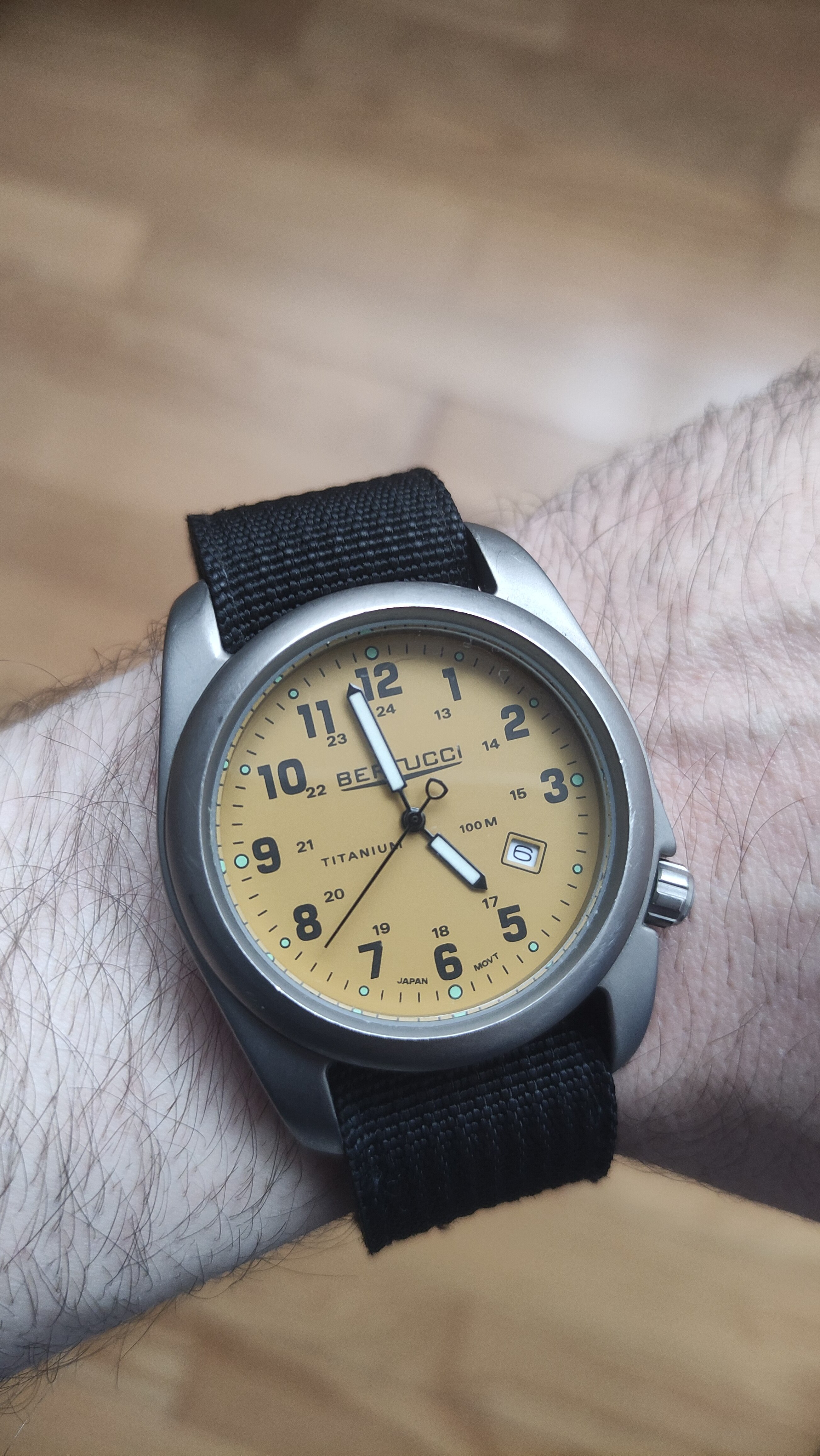 Saco a la venta este Bertucci con caja de titanio, un reloj de campo (field watch) muy cómodo gracias a su ligereza y a la posición de la corona a las 4.
