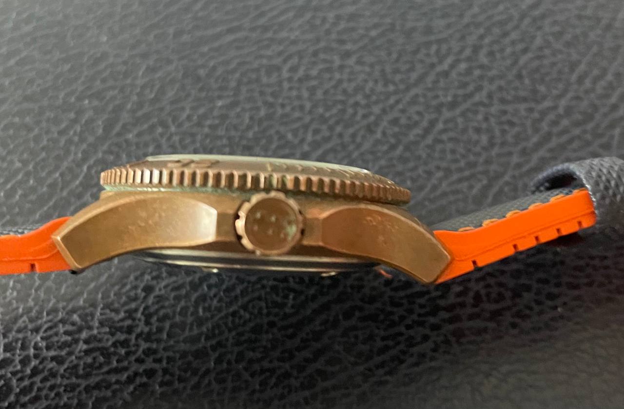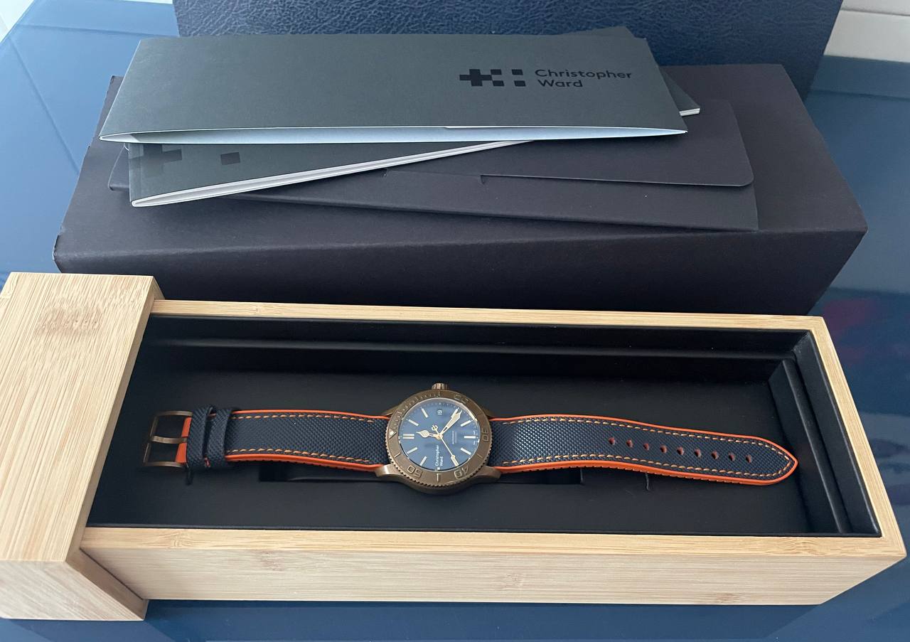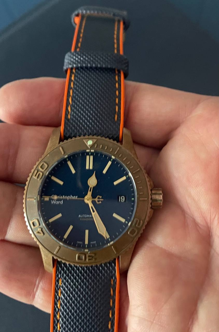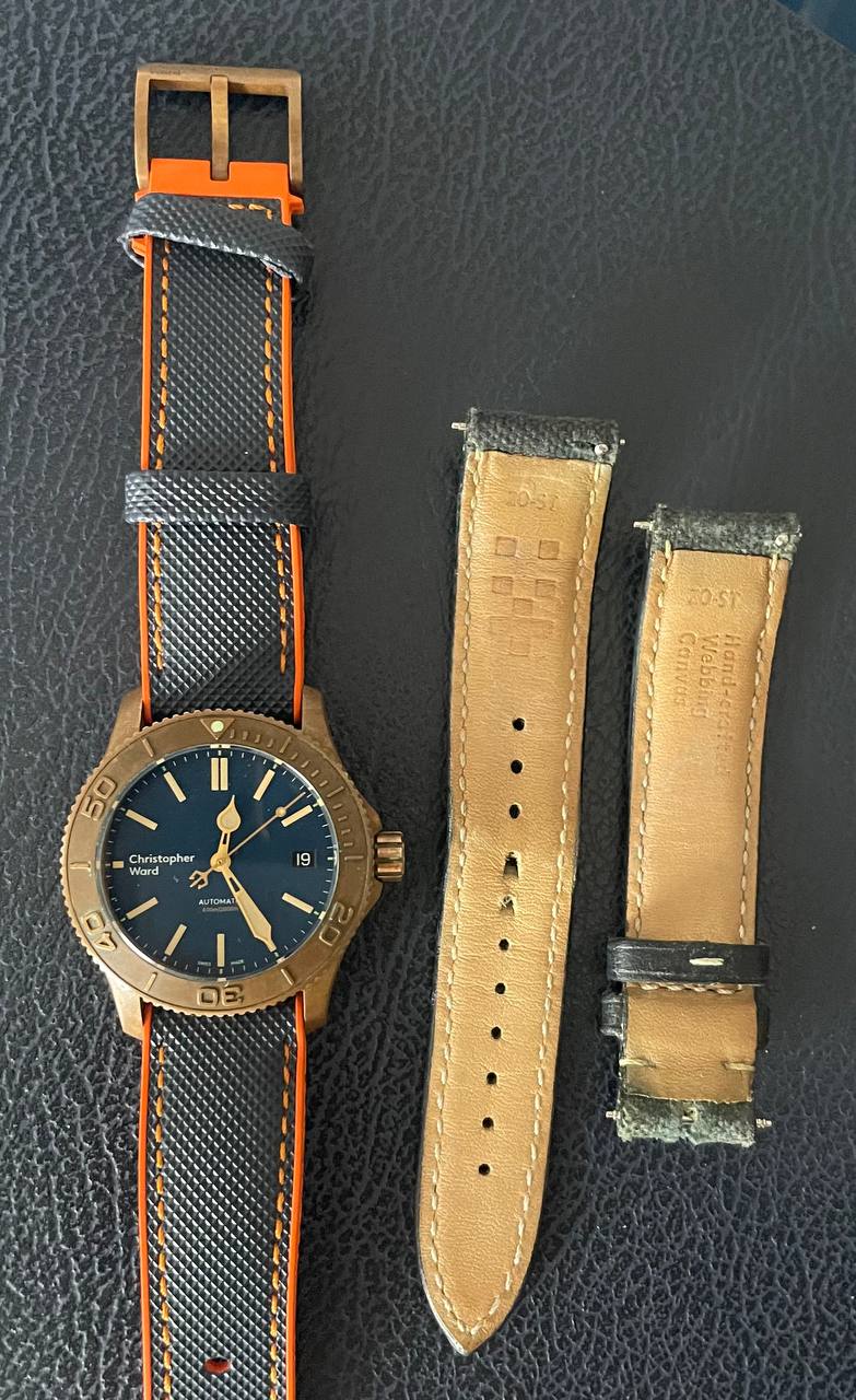 Todo un objeto de culto al ser de los bronces de la primera época de la marca, que entrego con dos correas: La original, bastante trallada pero recién limpia e higienizada y una que le he puesto hace un año que le va mejor que la que traía, a la que le he añadido el cierre firmado Christopher Ward que traía la original.