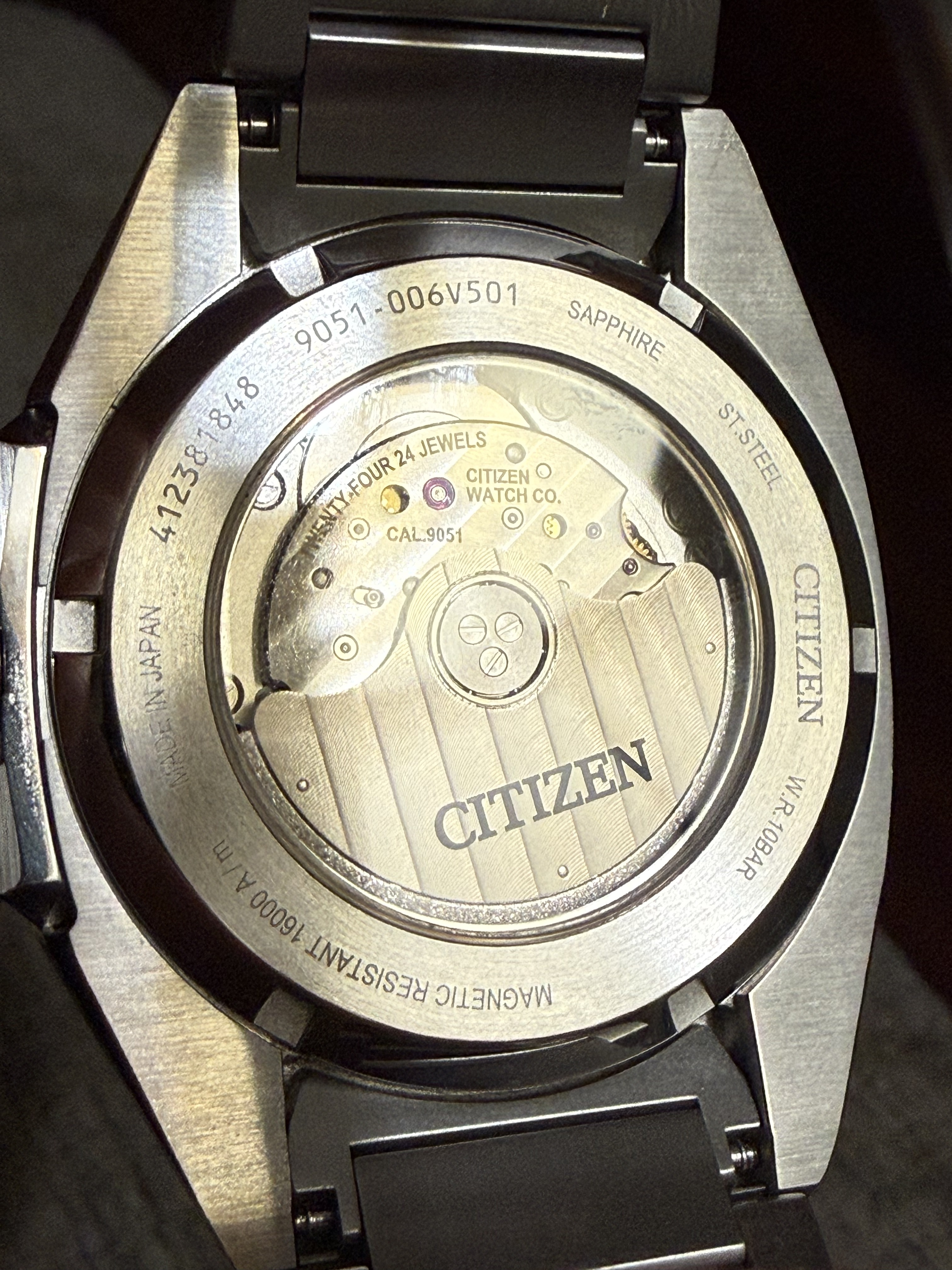 Cristales de zafiros en ambas partes en la frontal (con antiteflejo) y en la trasera (la de la maquinaria). Calibre 9051 con 28.800 oscilaciones y una precisión extraordinaria y un antimagnetismo de Clase 2.