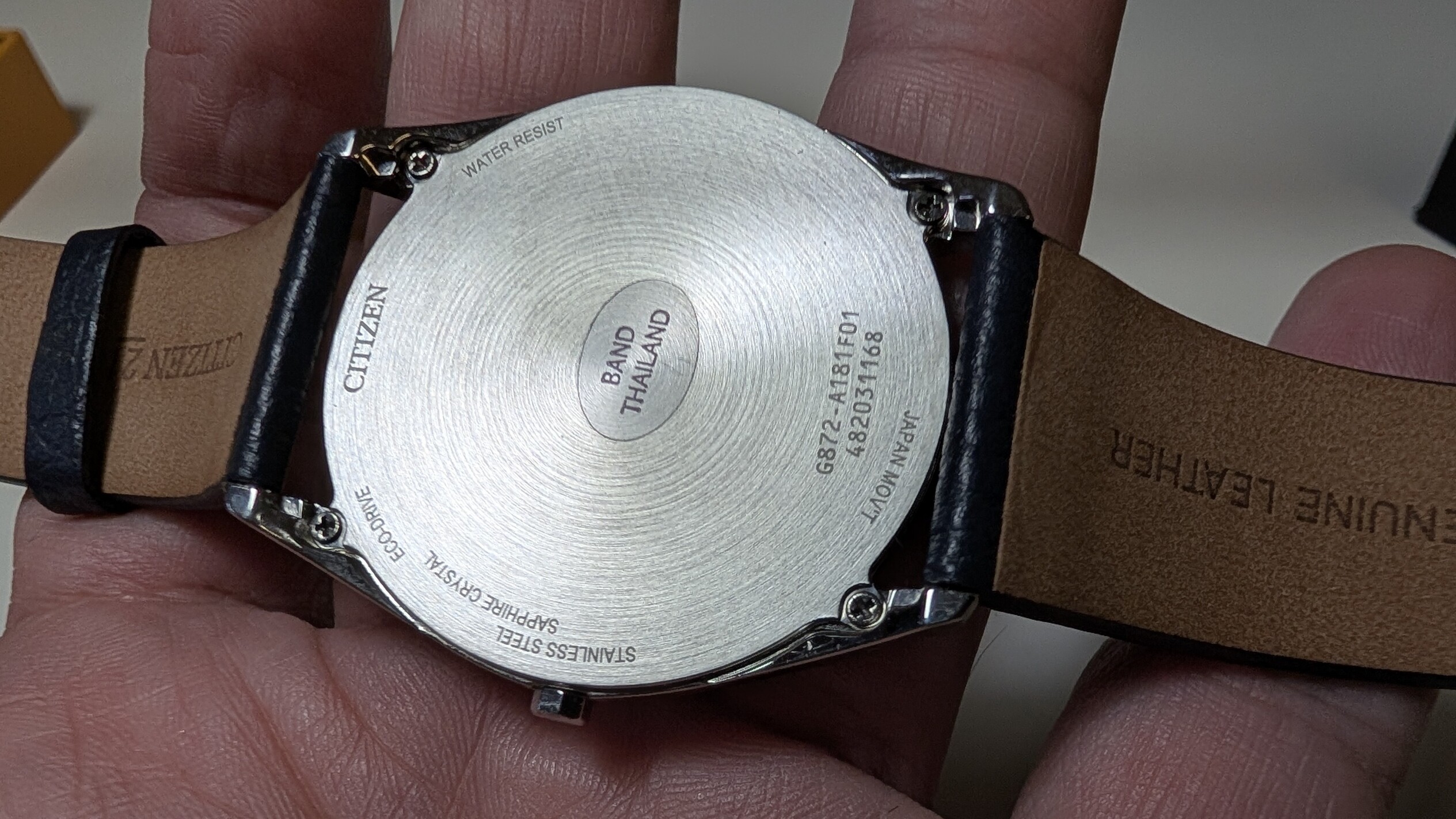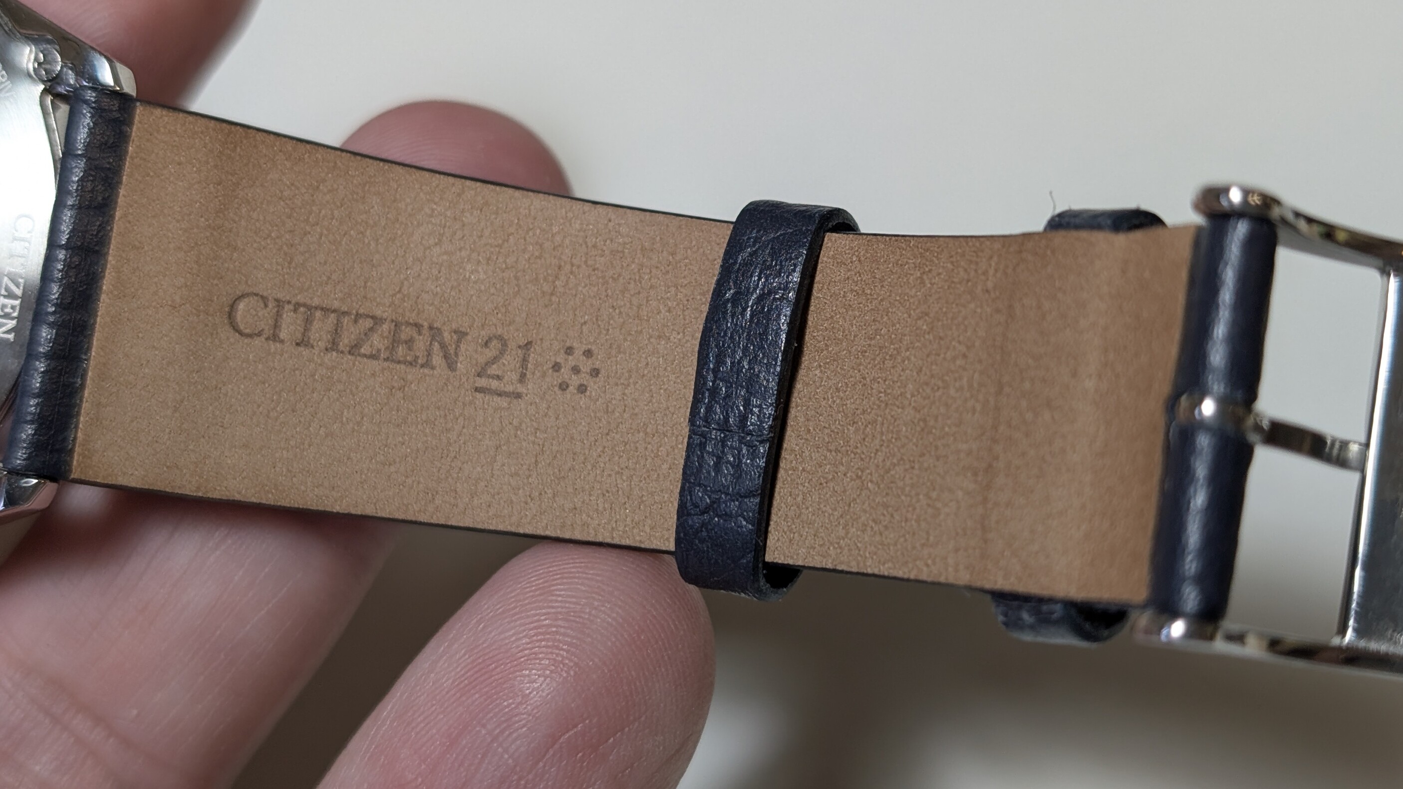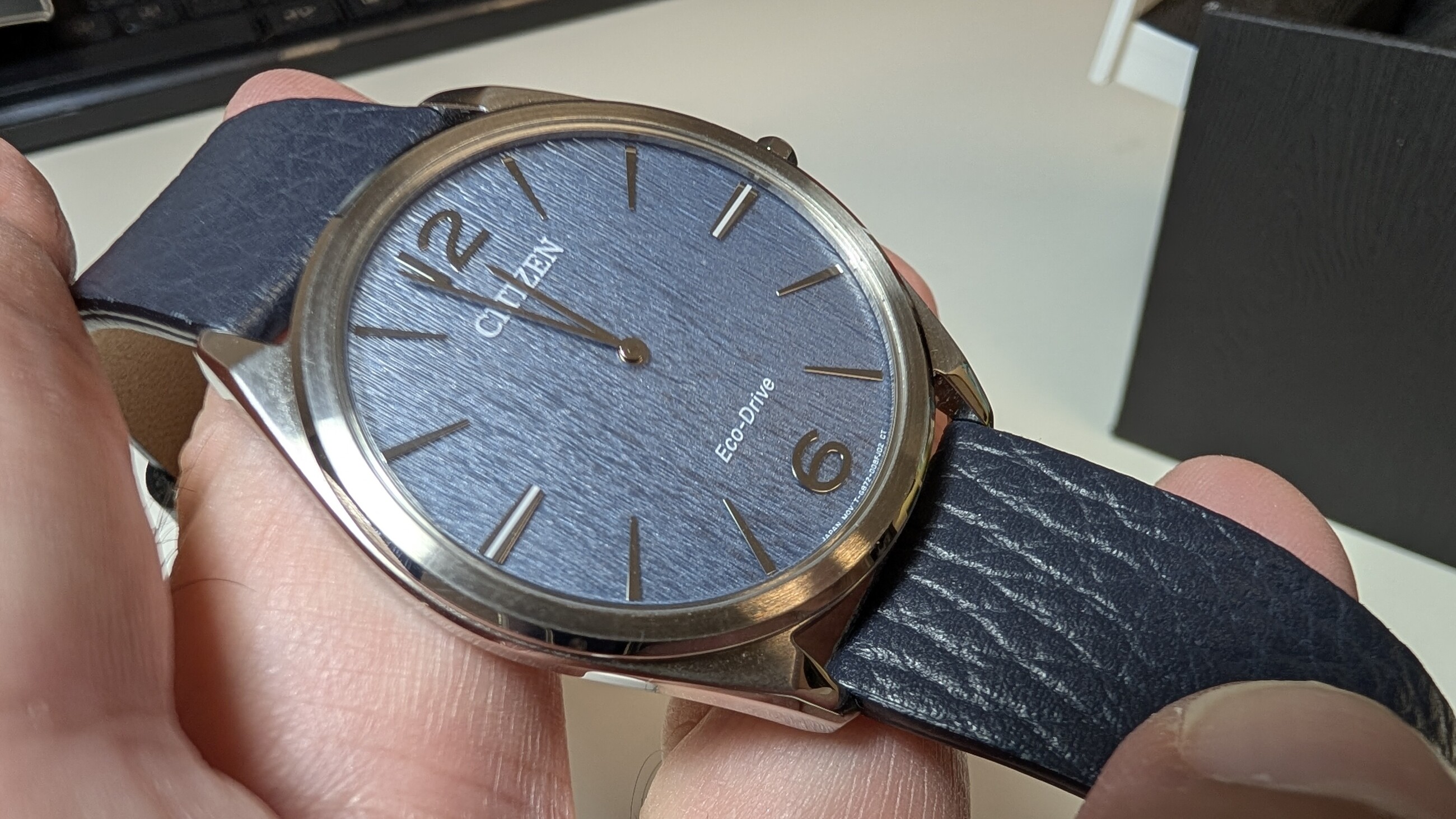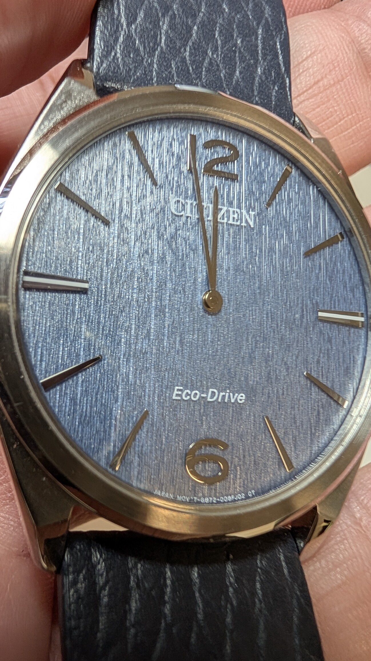 Es una pasada de reloj, con sólo 4,5mm de grosor y calibre Eco-Drive. Dial azul con un cepillado precioso. Correa original de cuero con hebilla firmada.