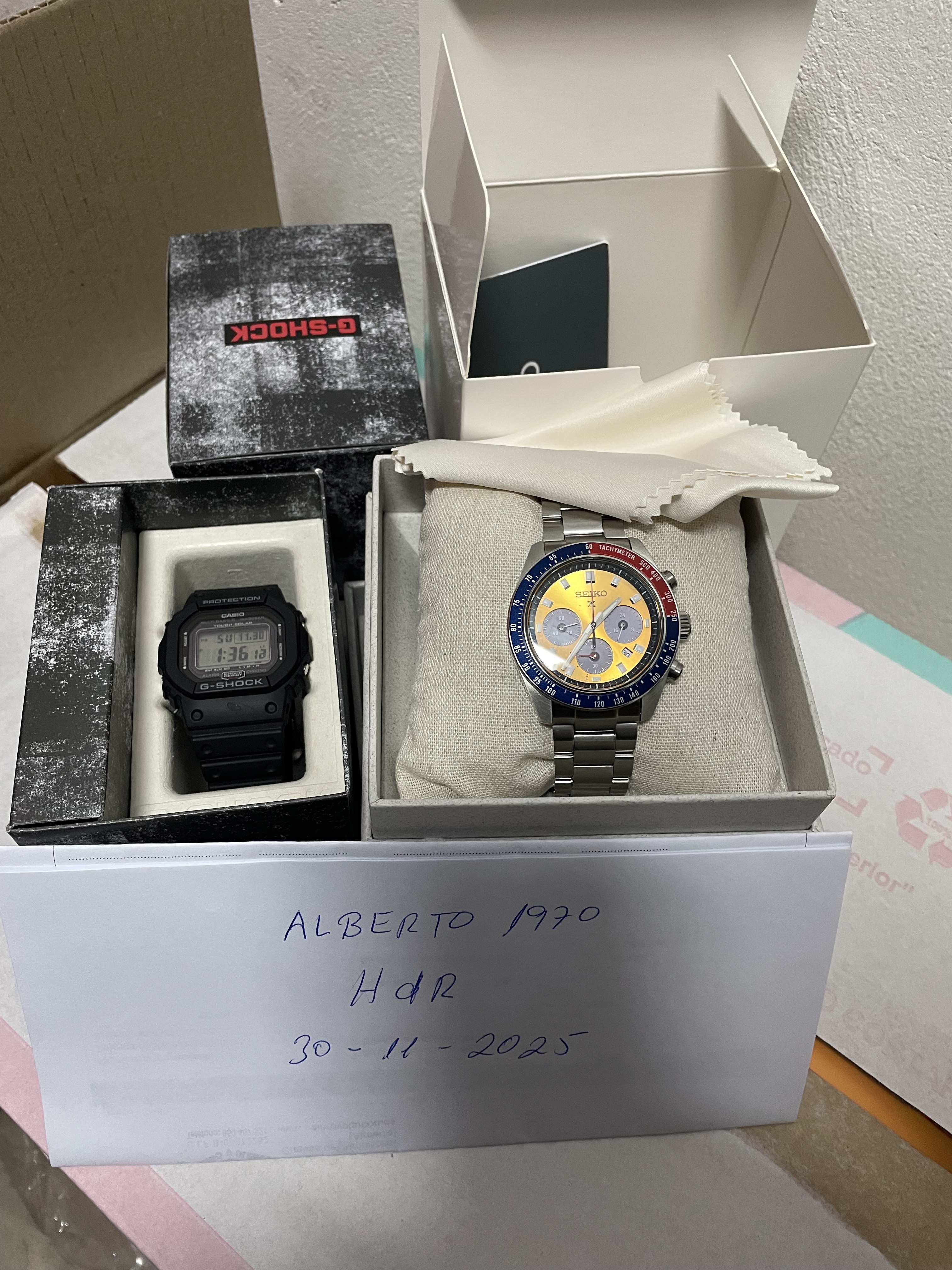 Buenos días a todos. Pongo a la venta estas dos piezas. El primero es un seiko ssc947 nuevo. El segundo es el conocido GW5000U de riguroso reestreno. Por supuesto los dos están completos de cajas y papeles. Os dejo unas fotos malas y rápidas pero quien quiera más las envío por watssap. Pido 530€ por el seiko y 220 por el príncipe. Envío por agencia nacex incluido. Más fotos por watssap. Gracias a todos y al foro.