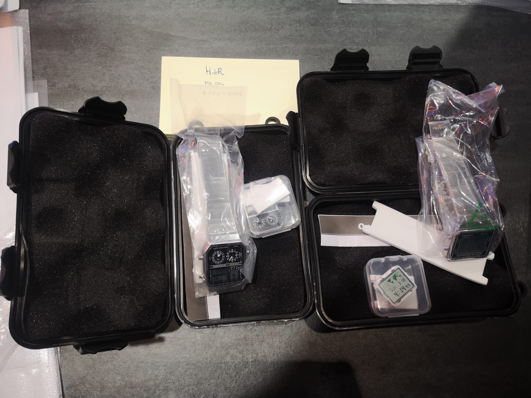 Pues lo dicho, pongo a la venta la pareja de relojes digitales de la RSWC a estrenar, con dotación completa como es lógico (módulo de repuesto). El precio: 150 € + 10 € de gastos de envío por mensajería.